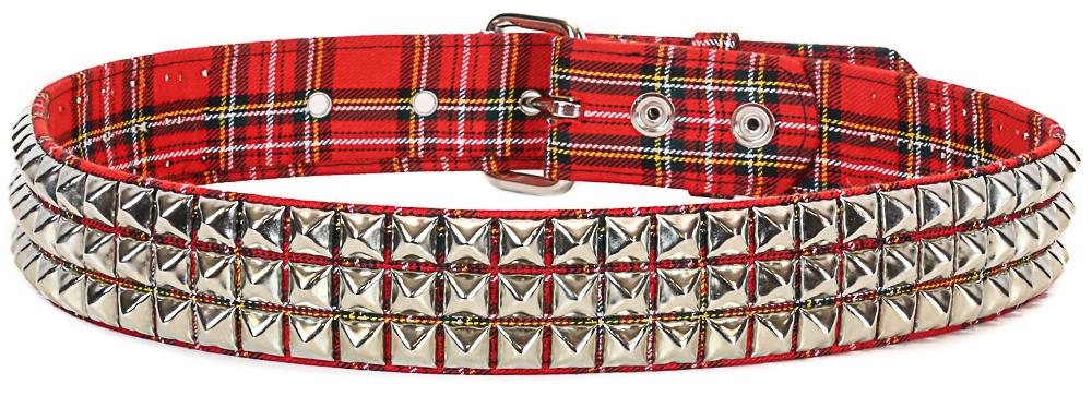 RED PLAID 3 ROW 1/2" PYRAMID STUD BELT, 1 3/4" WIDE
