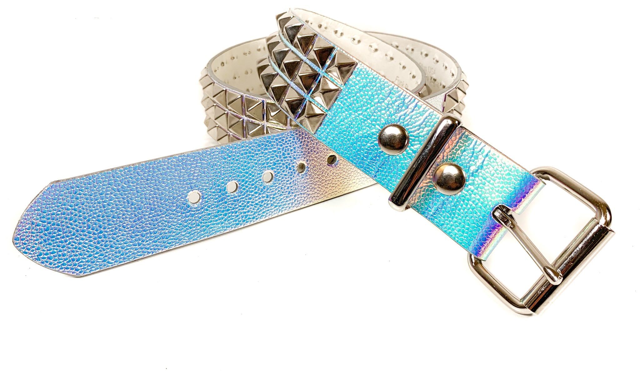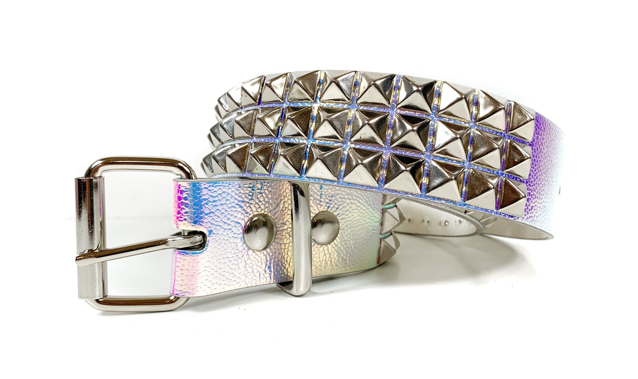 HOLOGRAPHIC 3 ROW 1/2" PYRAMID STUD BELT, 1 3/4" WIDE