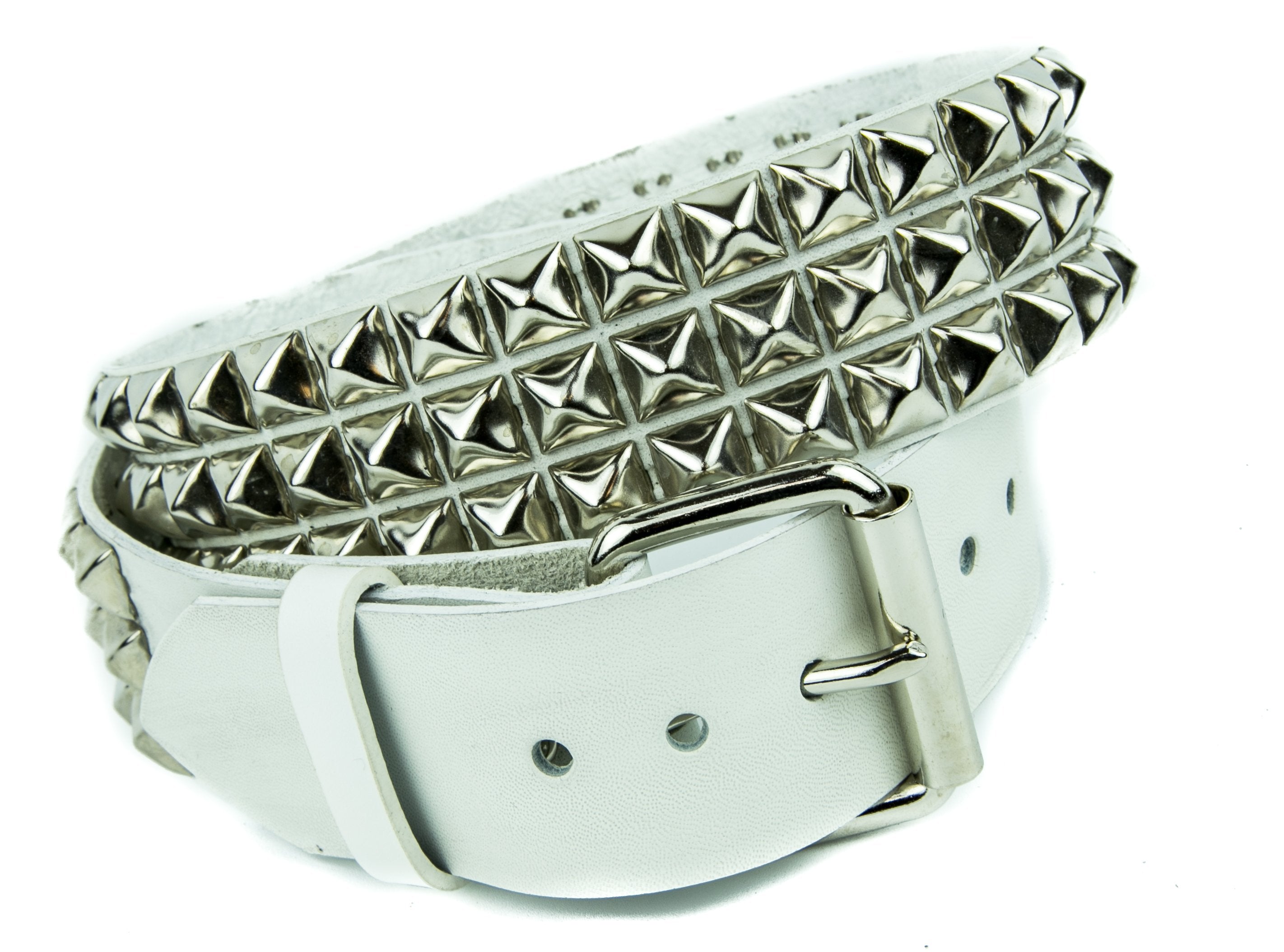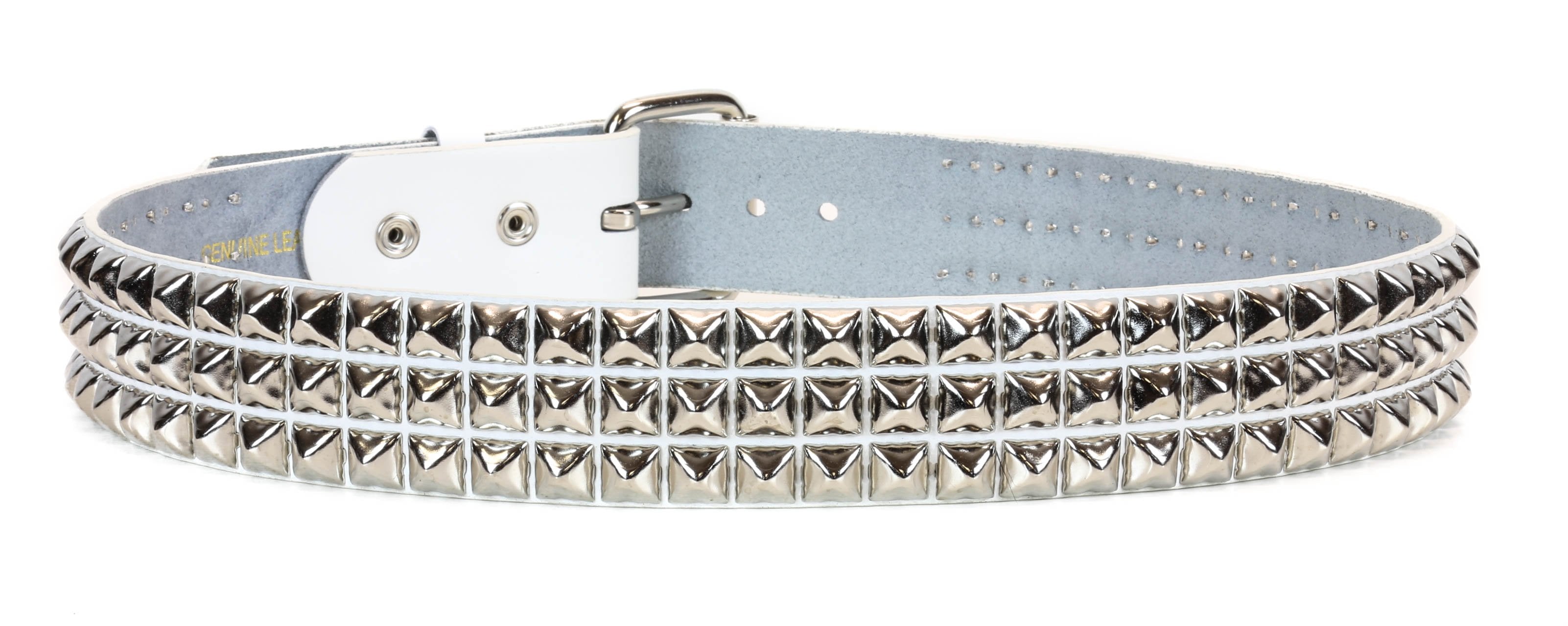 WHITE LEATHER 3 ROW 1/2" PYRAMID STUD BELT, 1 3/4" WIDE