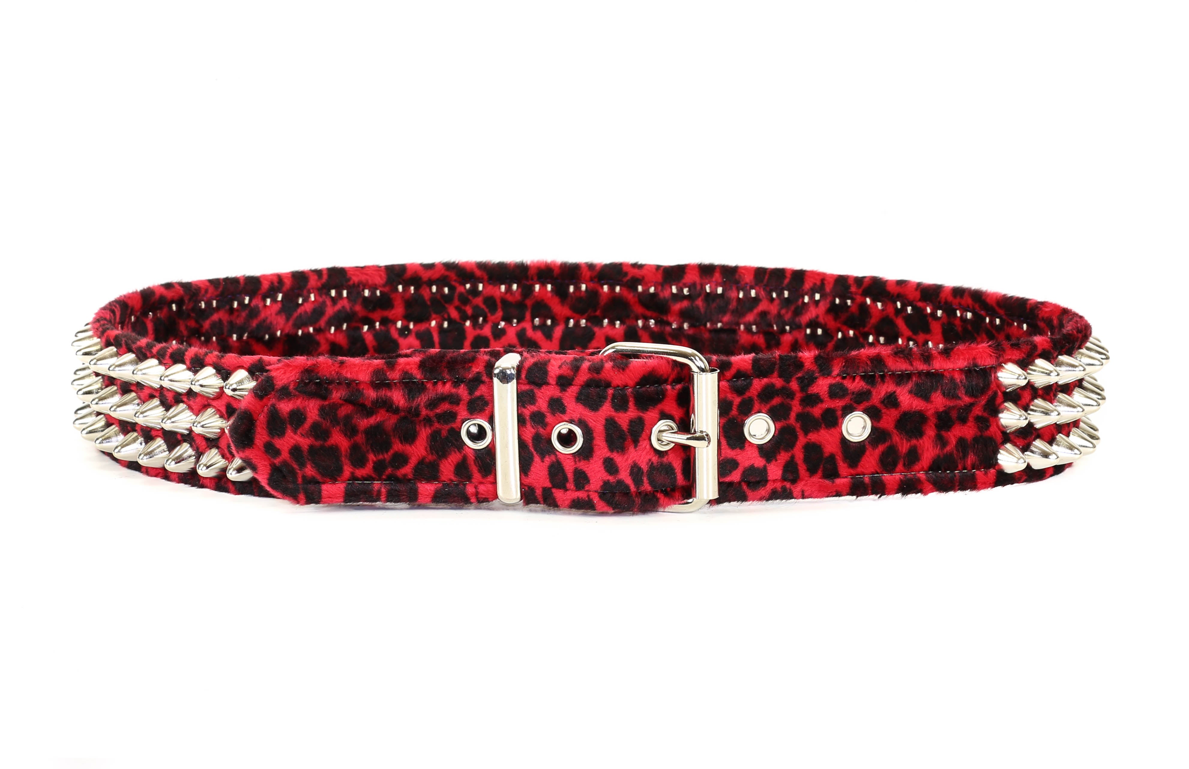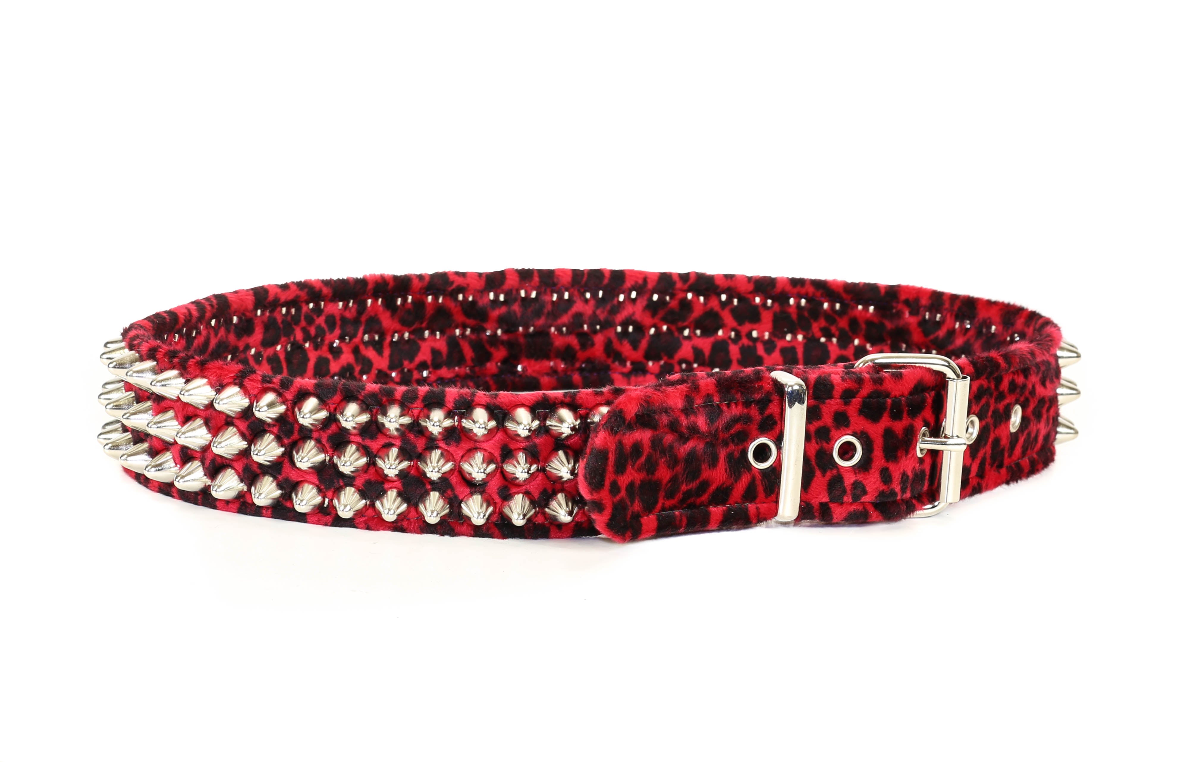 RED LEOPARD BELT, 3 ROW LARGE CONEHEAD STUDS, 1 1/2" WIDE