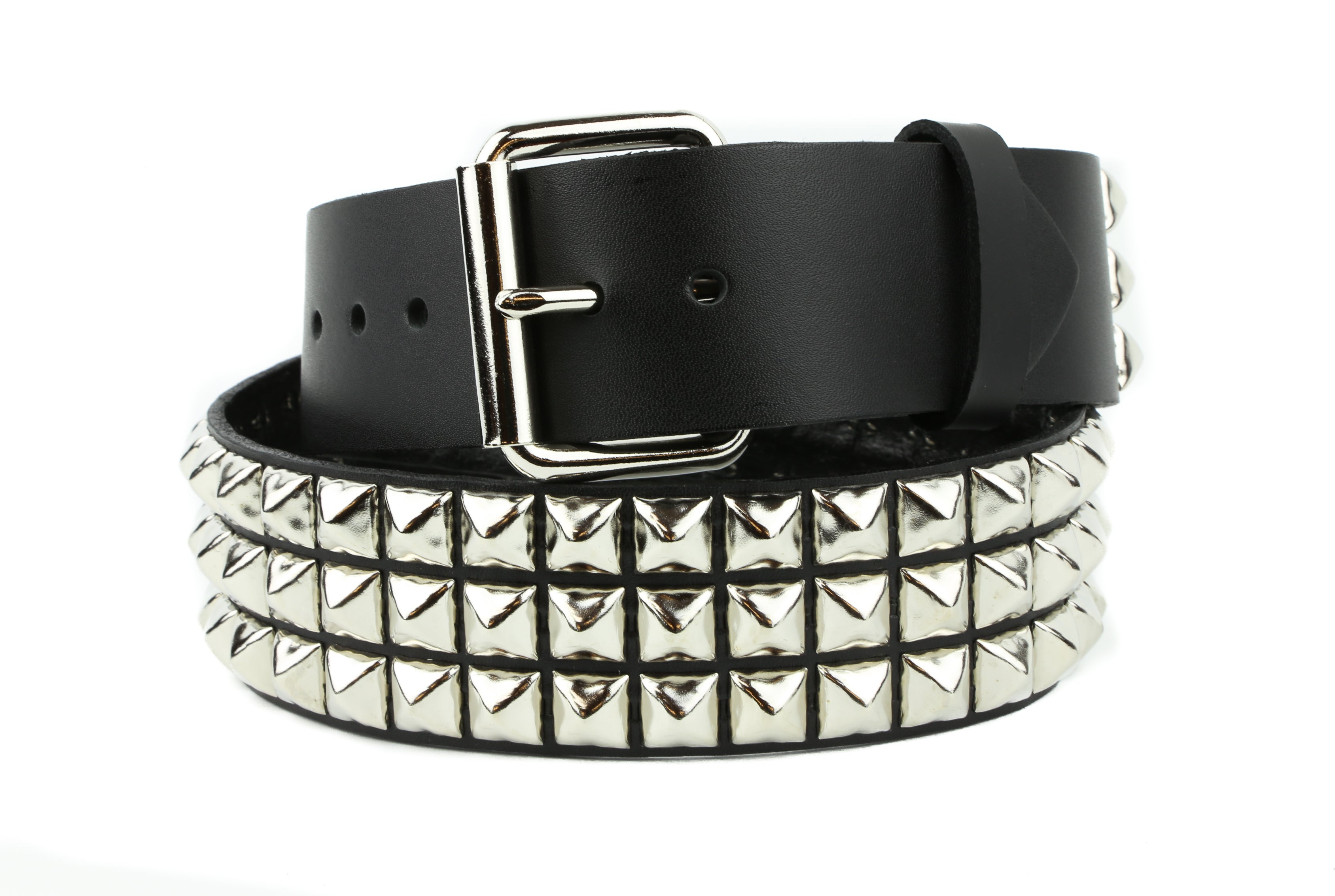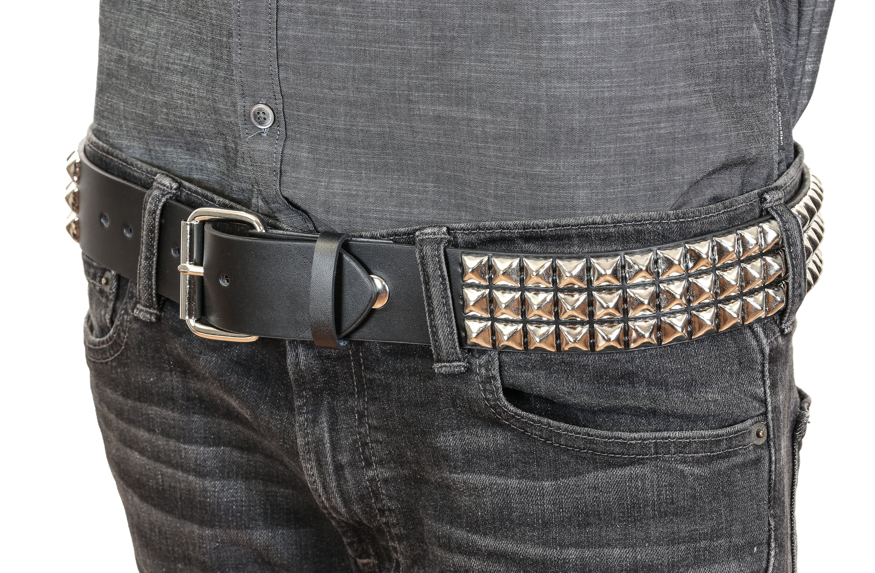Three Row Studded Pyramid Stud Heavy Duty Black Leather Belt