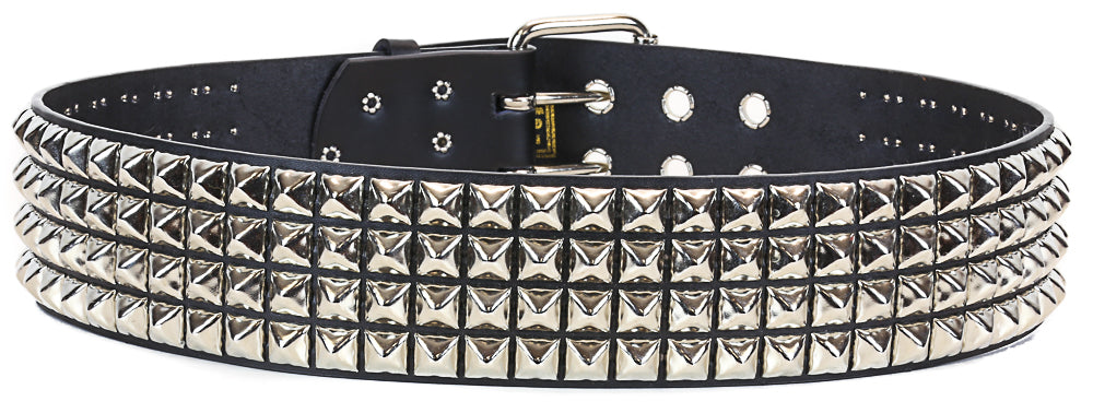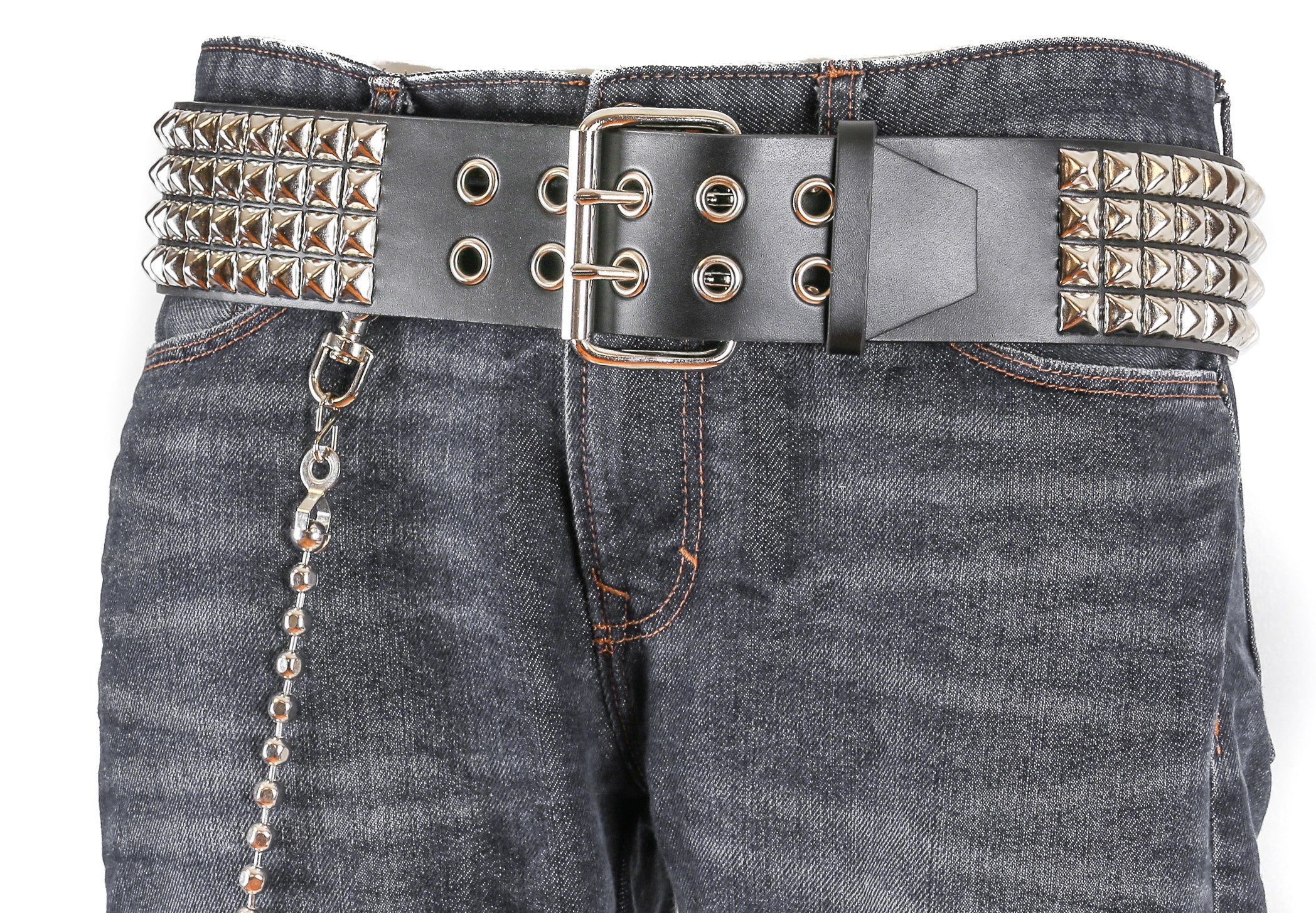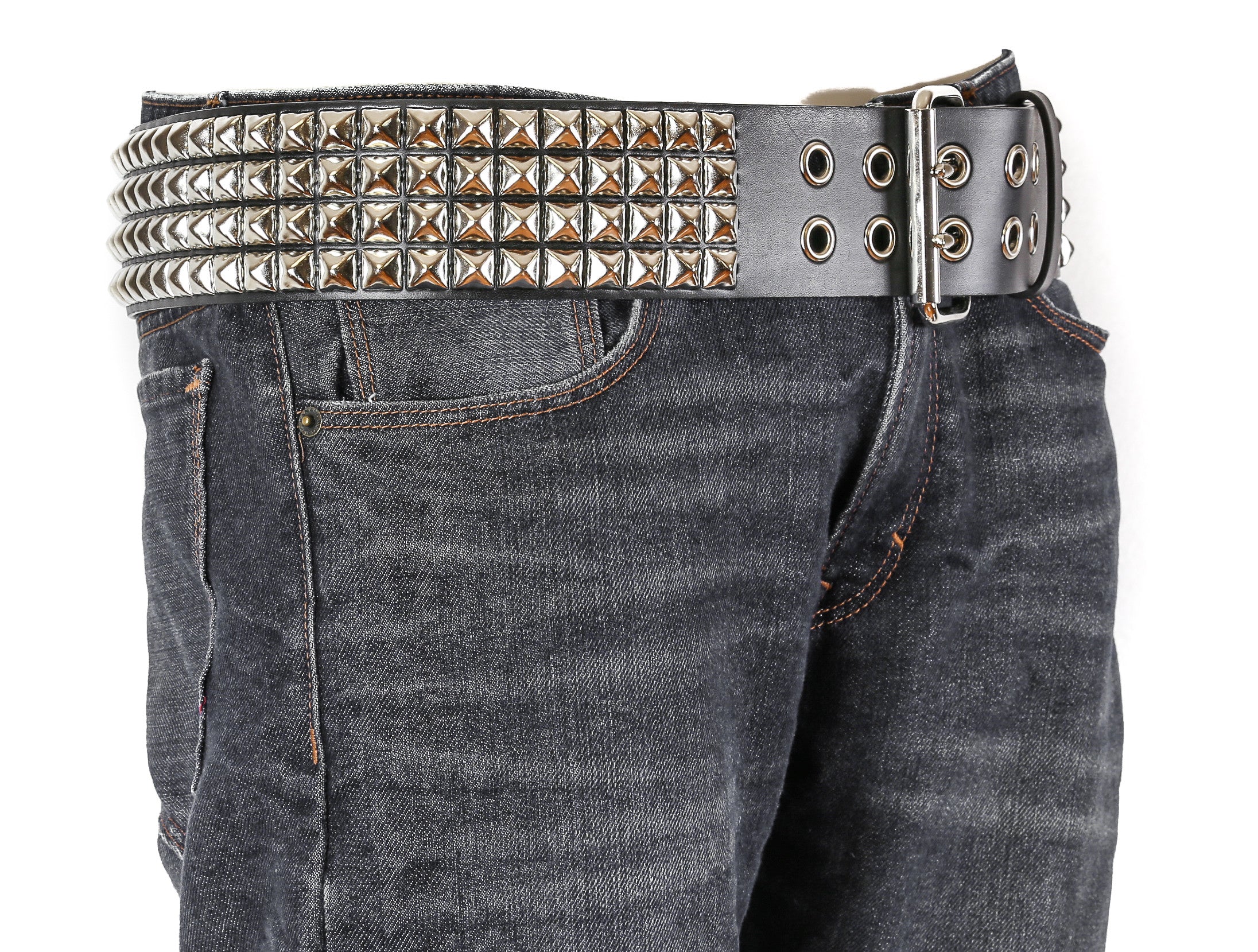 Four Row Pyramid Stud Heavy Duty Black Leather Belt Two Tongue Buckle