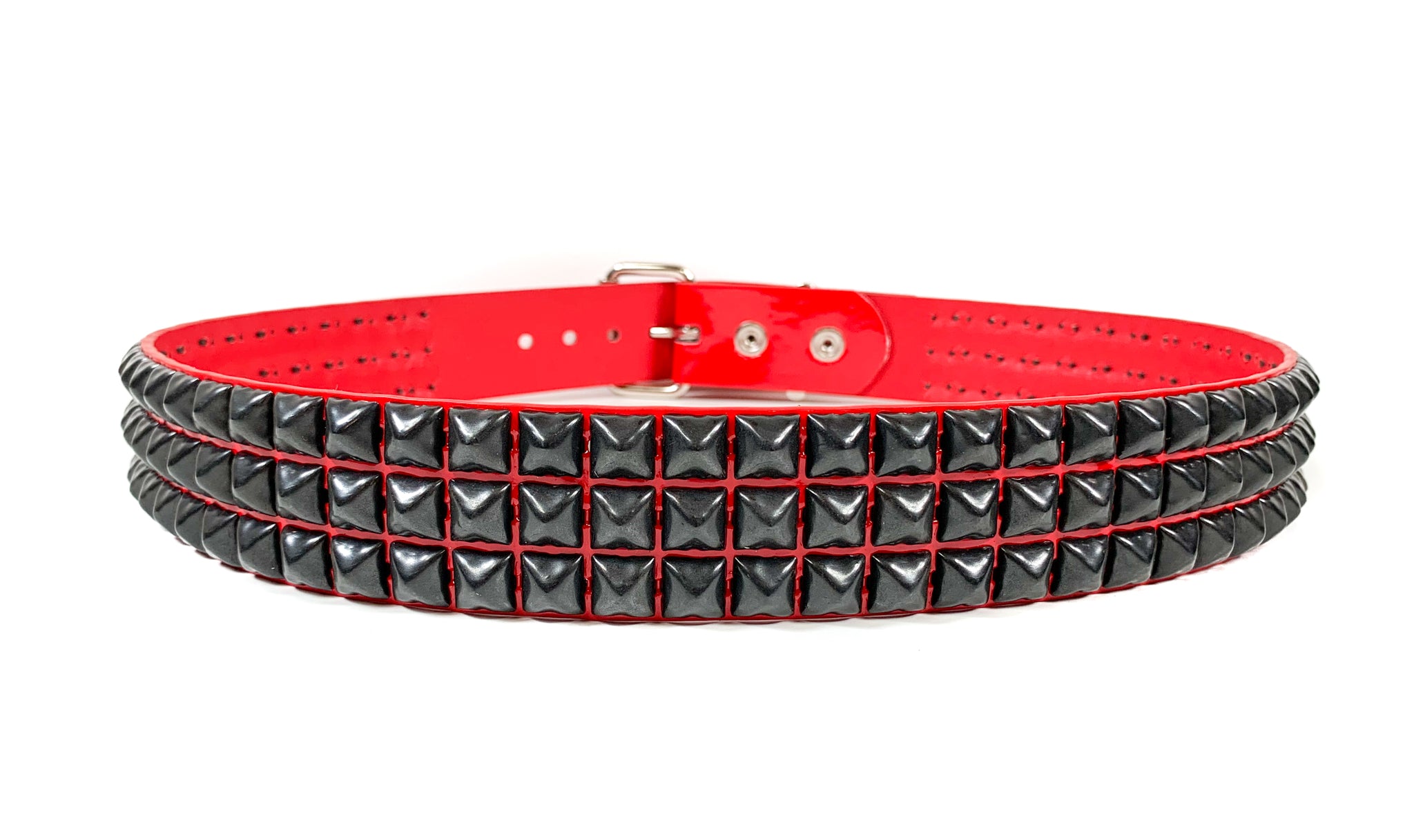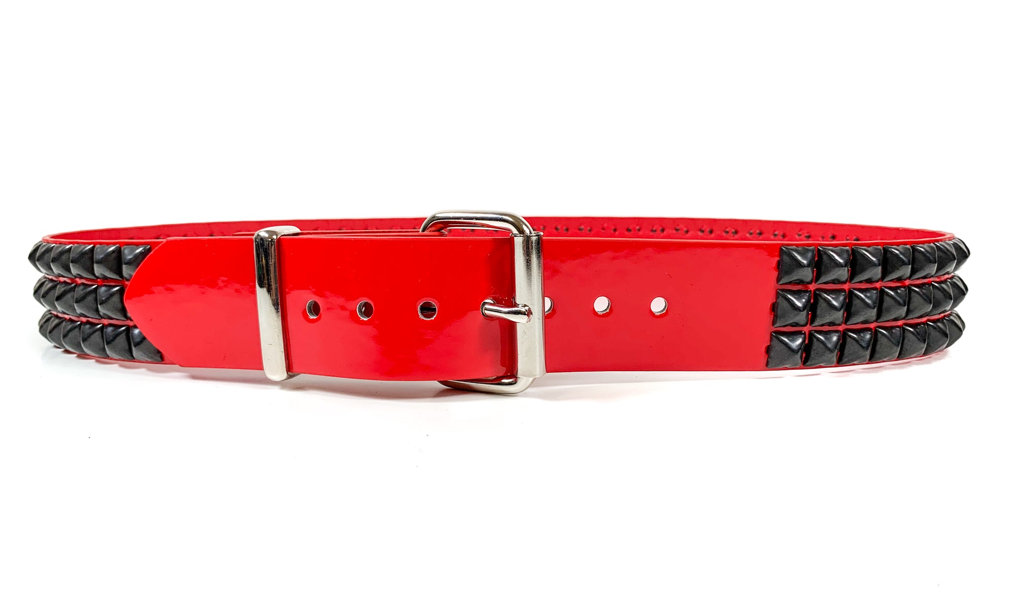 Red Patent Vegan 3 Row Gun Metal Pyramid Studded Belt By Funk Plus