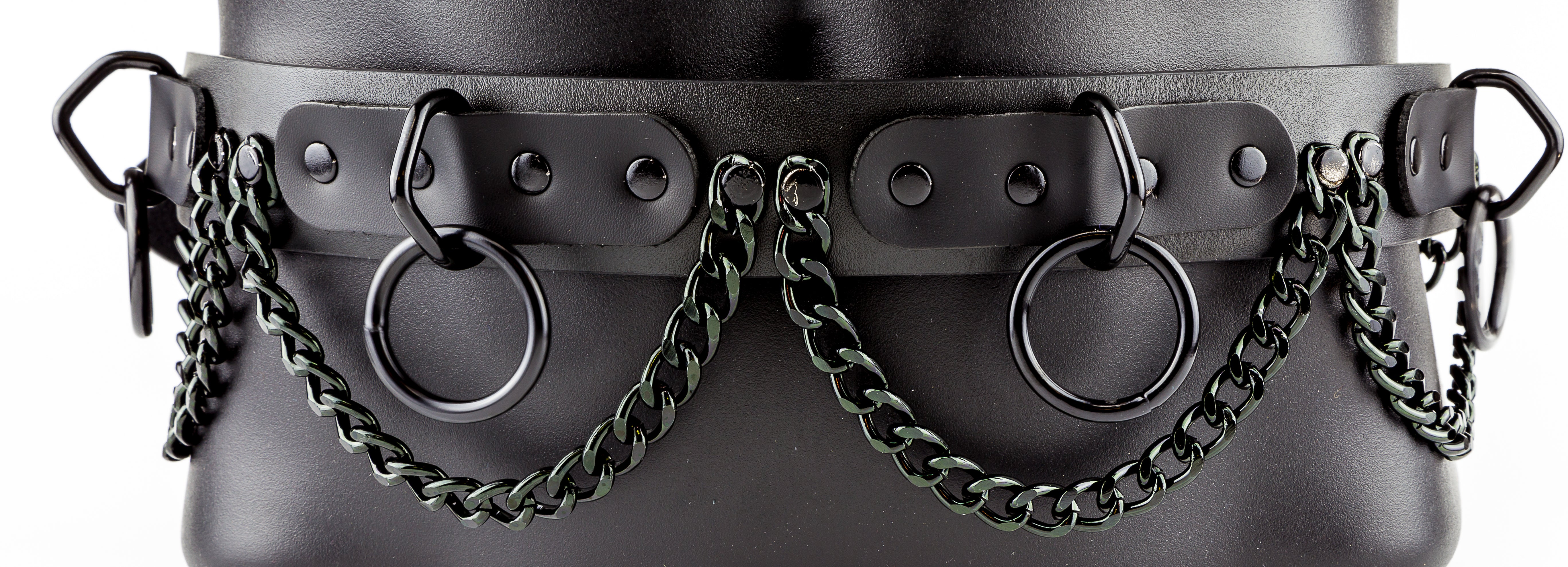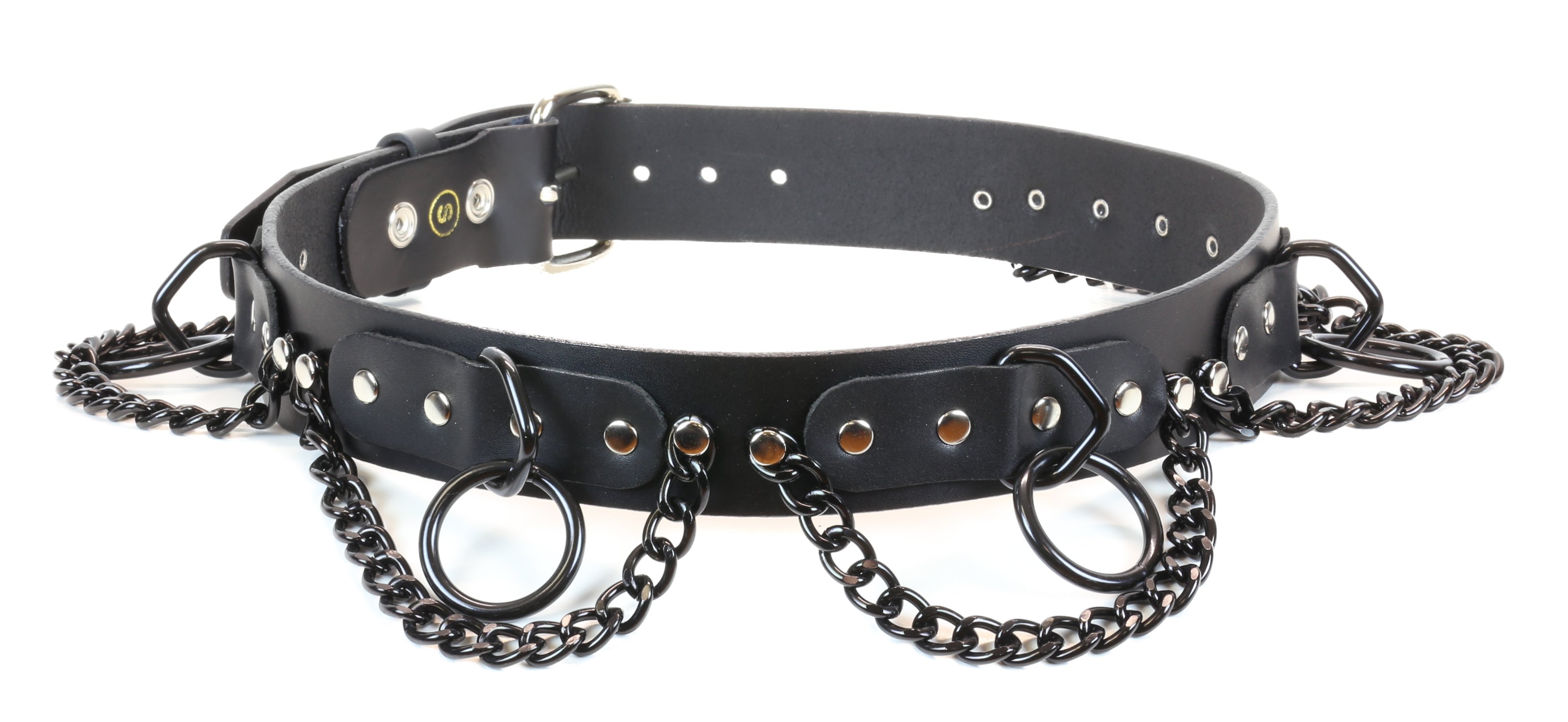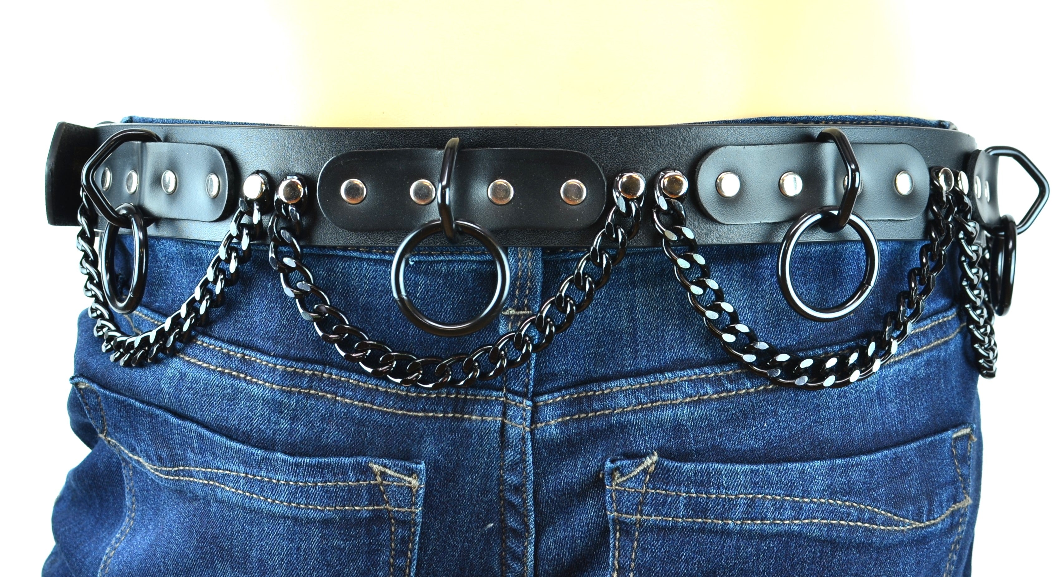 Medium Black Ring Hanging Chain Bondage Wide Belt Genuine Leather