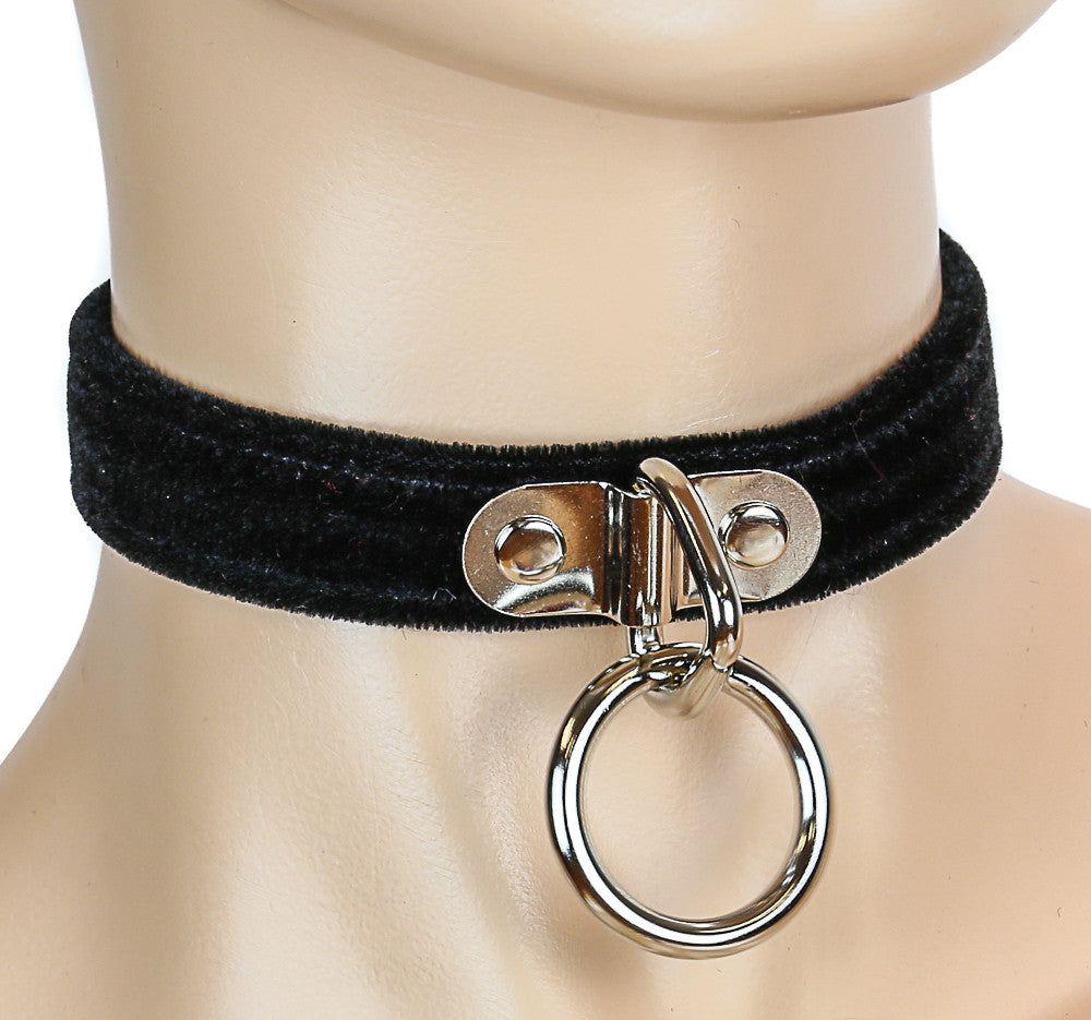 Bondage Thin Black Velvet Choker with Silver O Ring