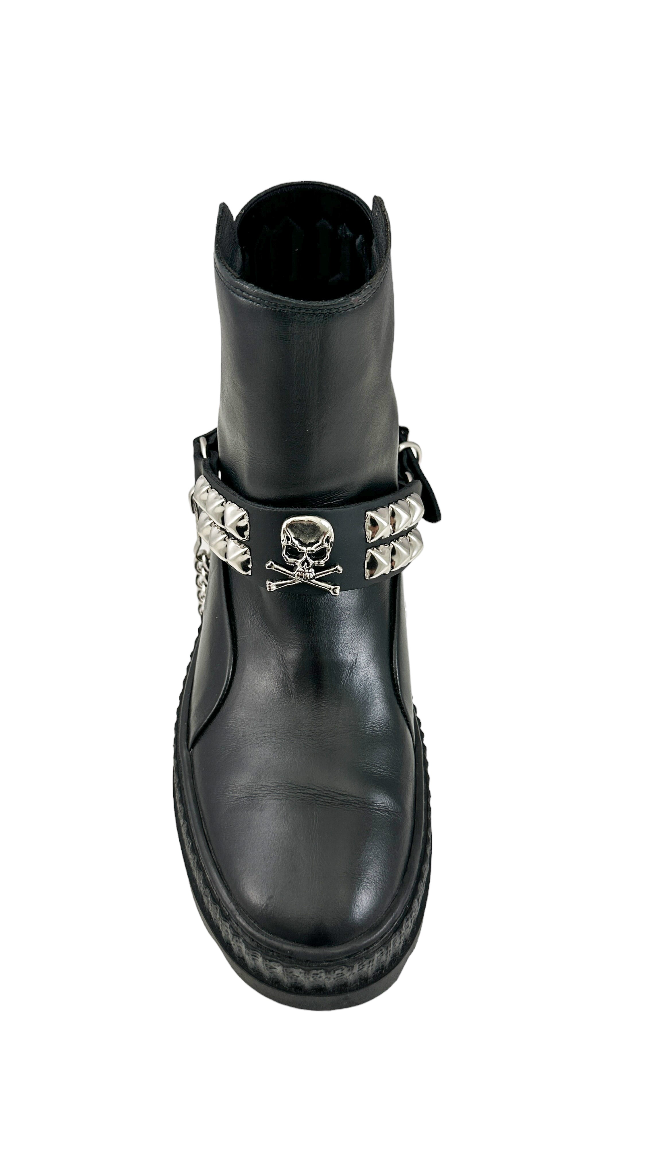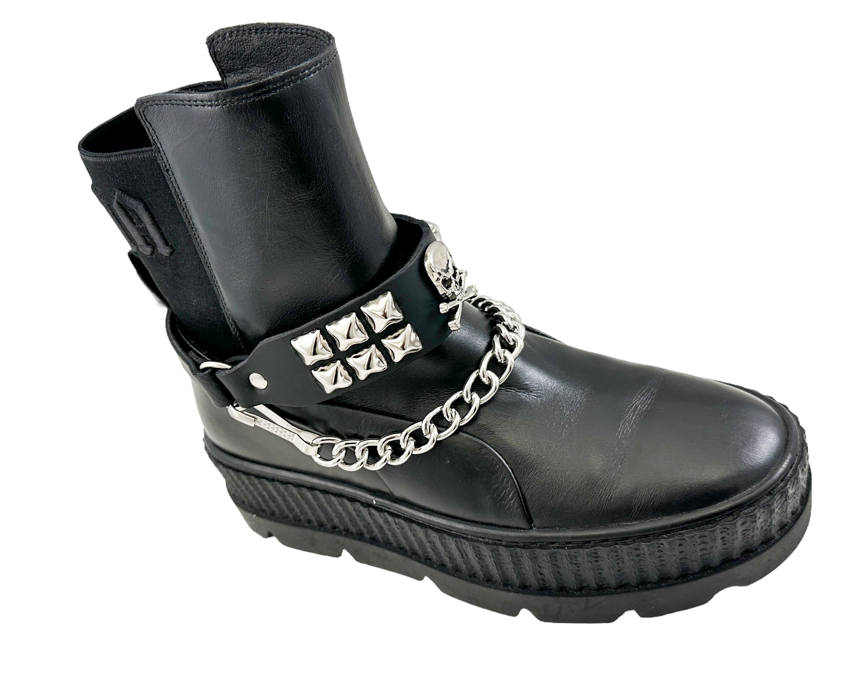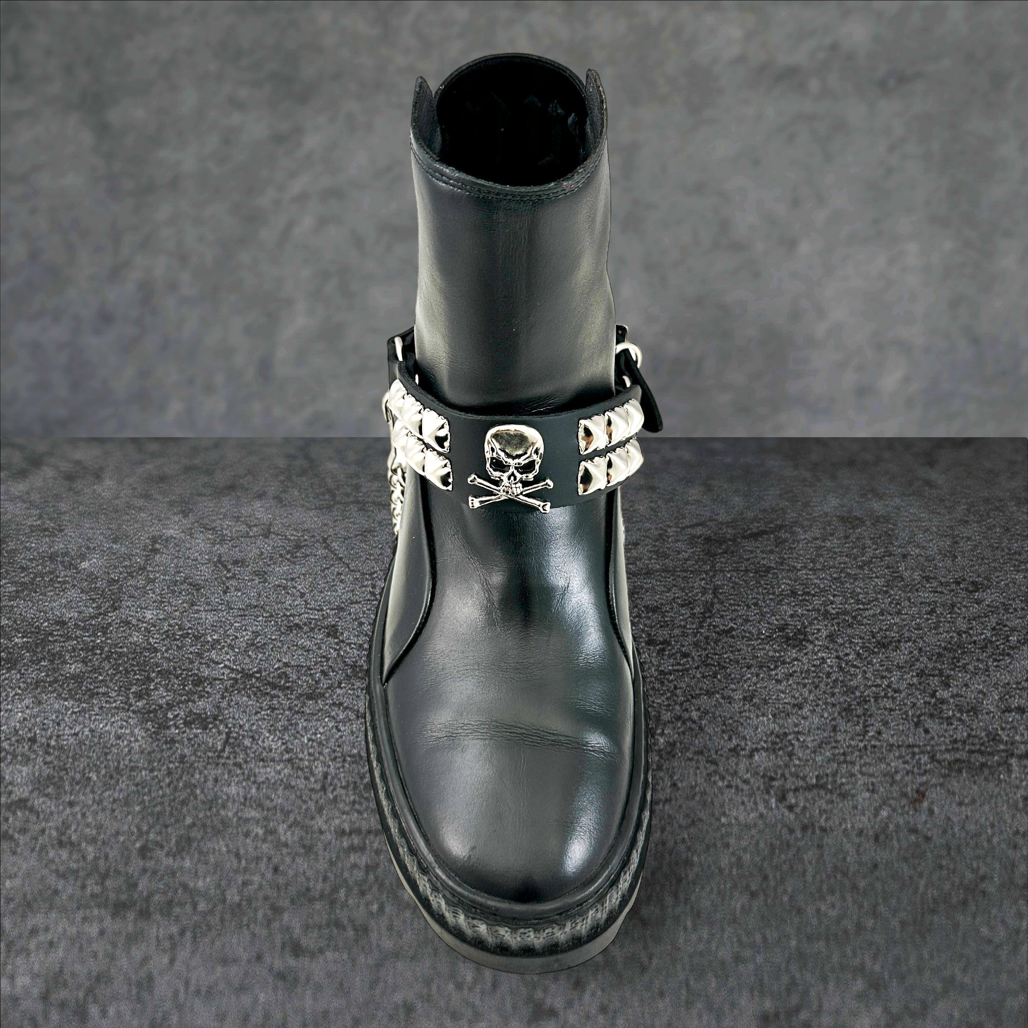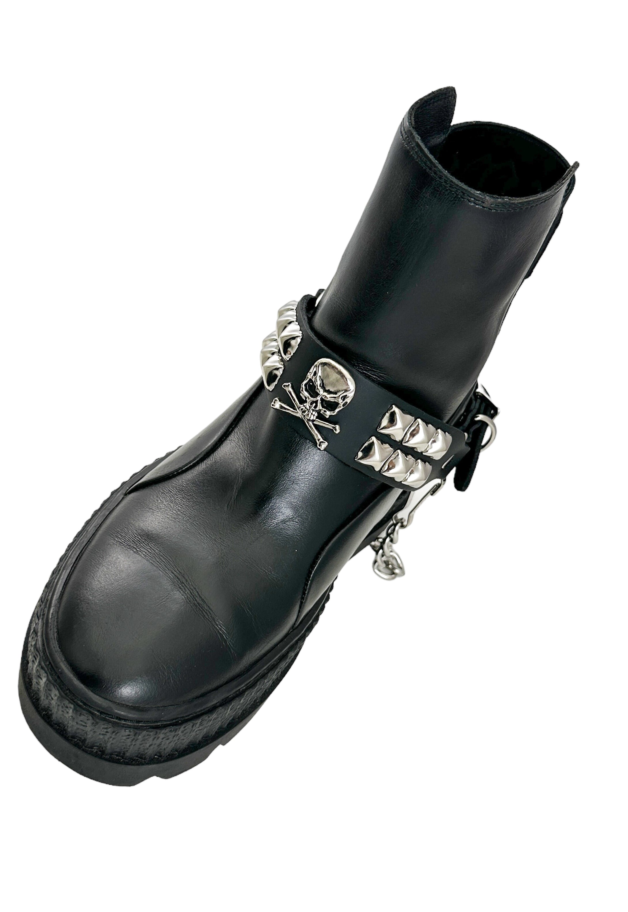 SKULL AND STUDDED BOOTSTRAP OVER LEATHER