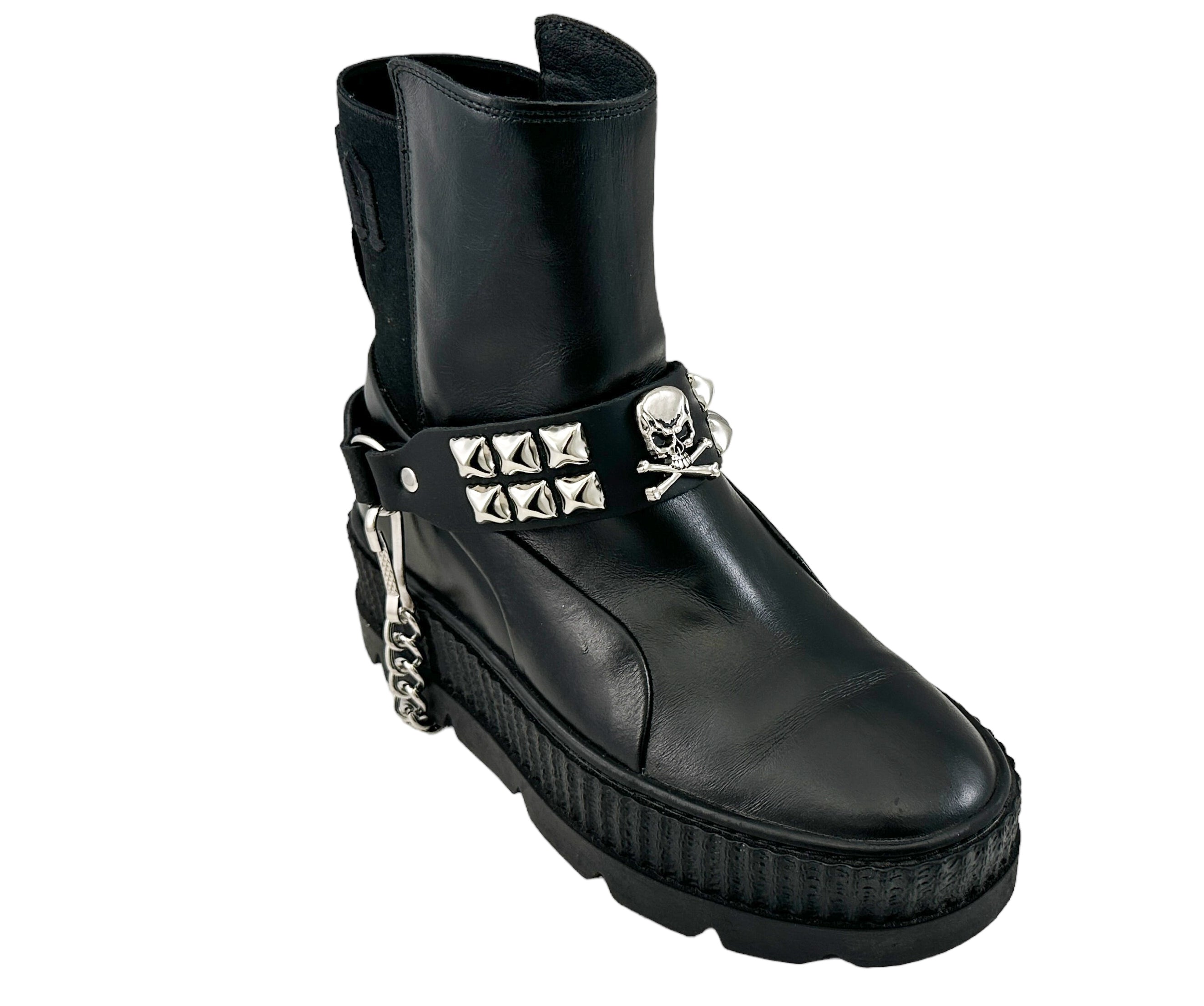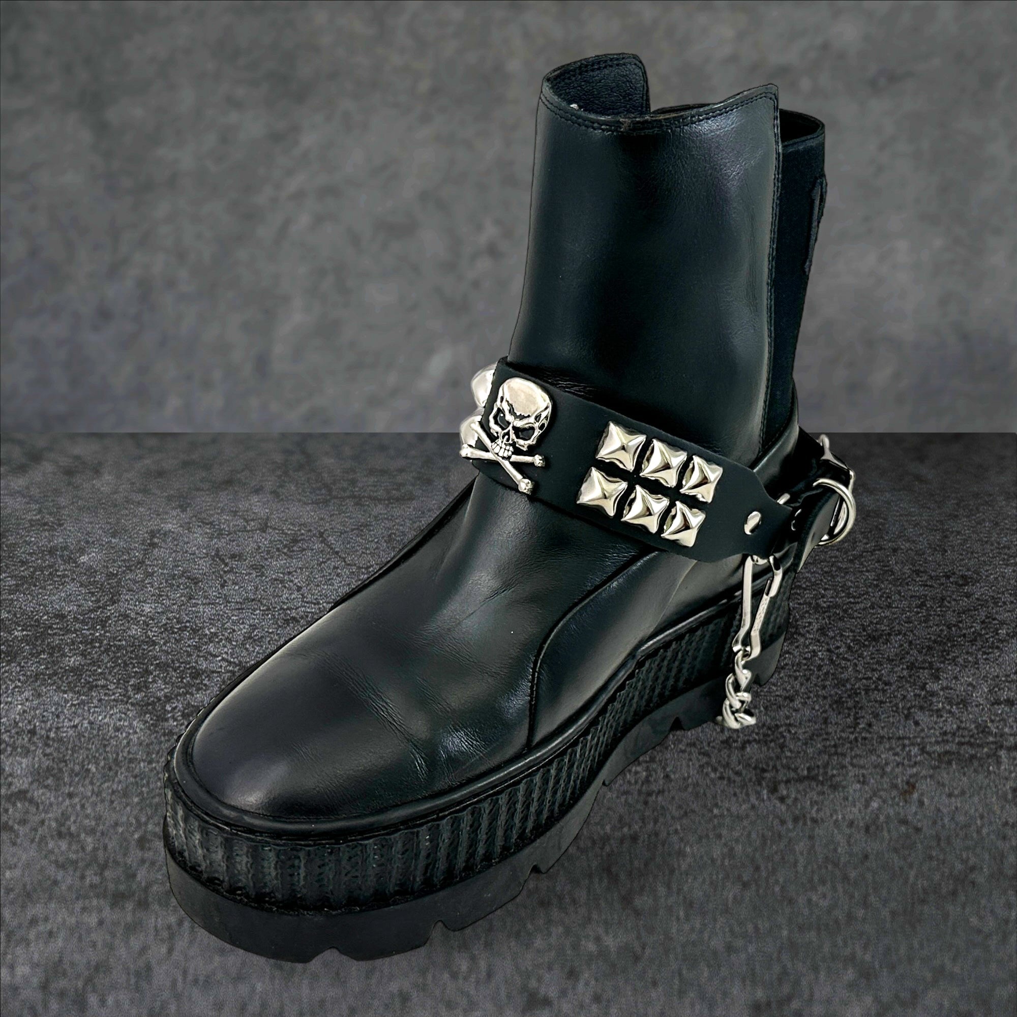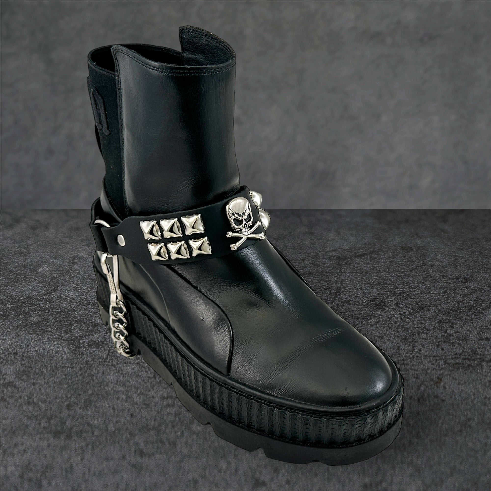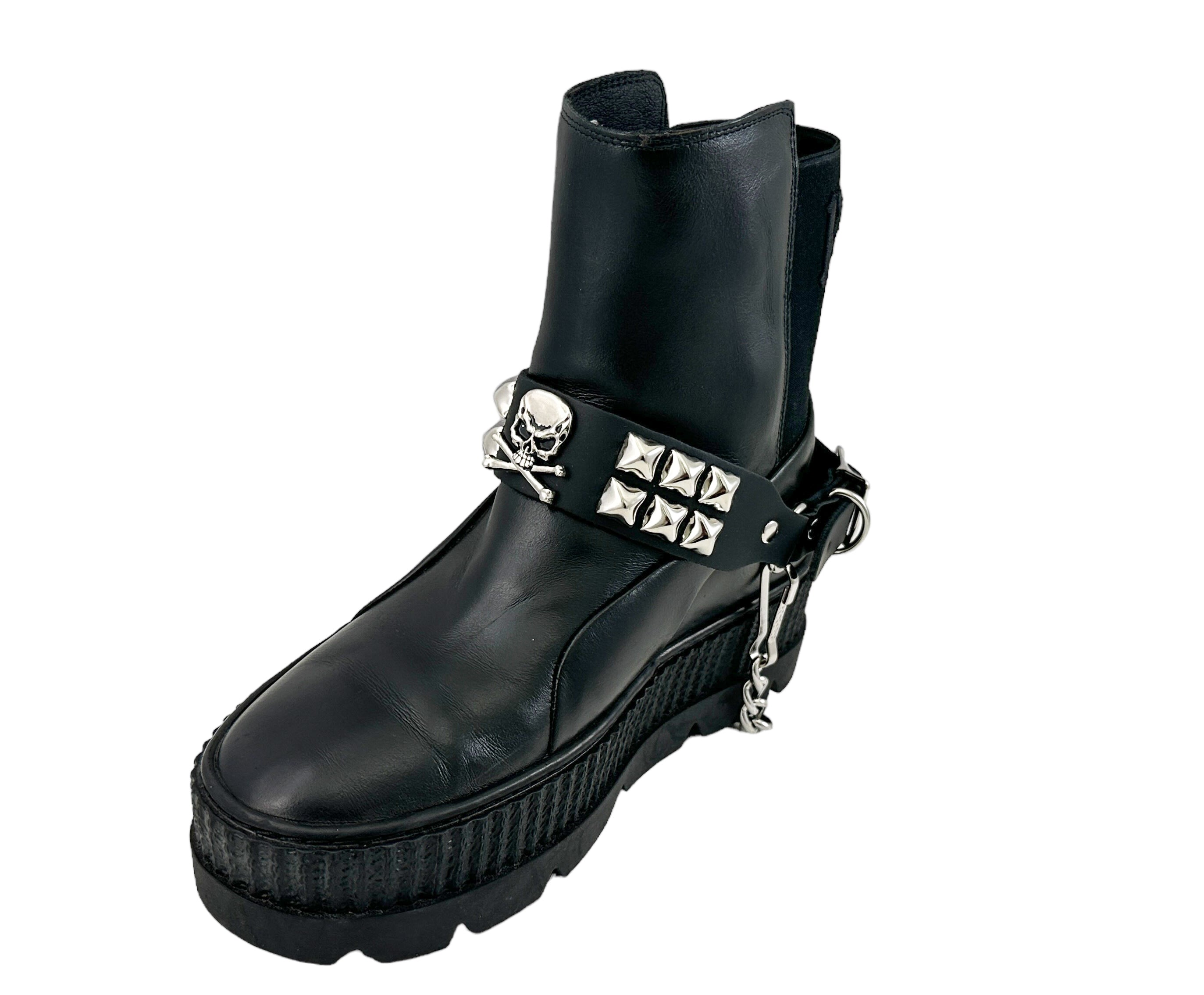 SKULL AND STUDDED BOOTSTRAP OVER LEATHER