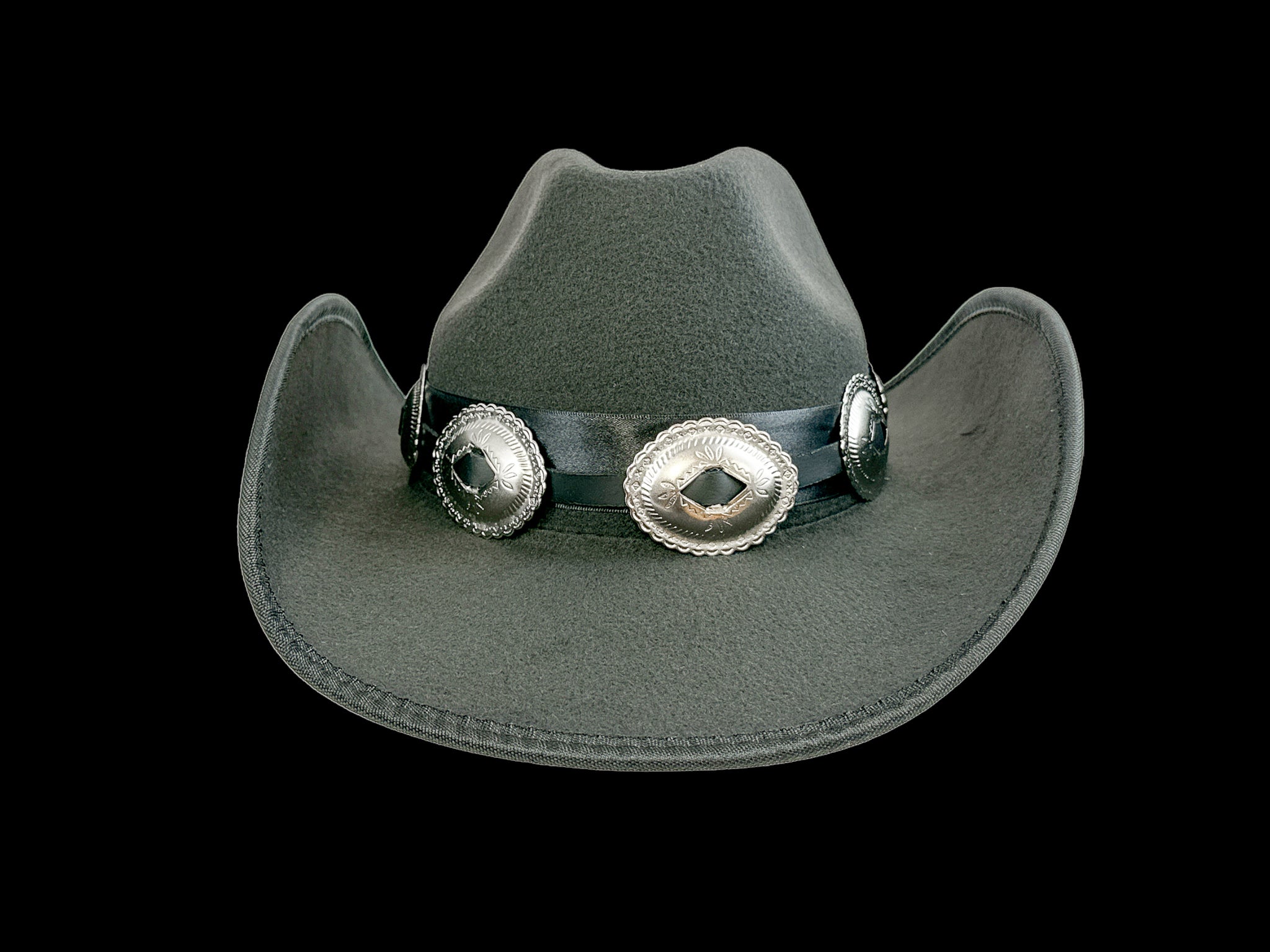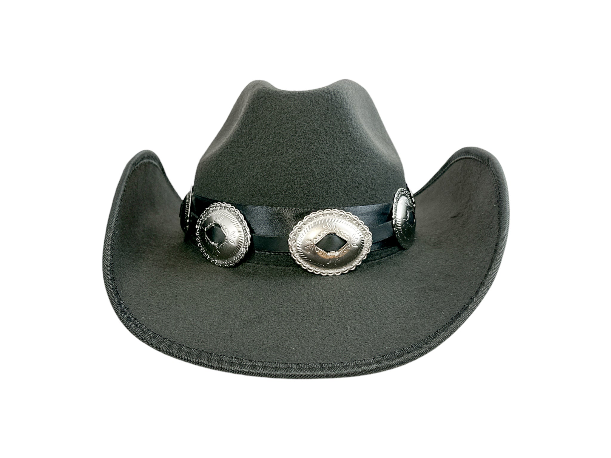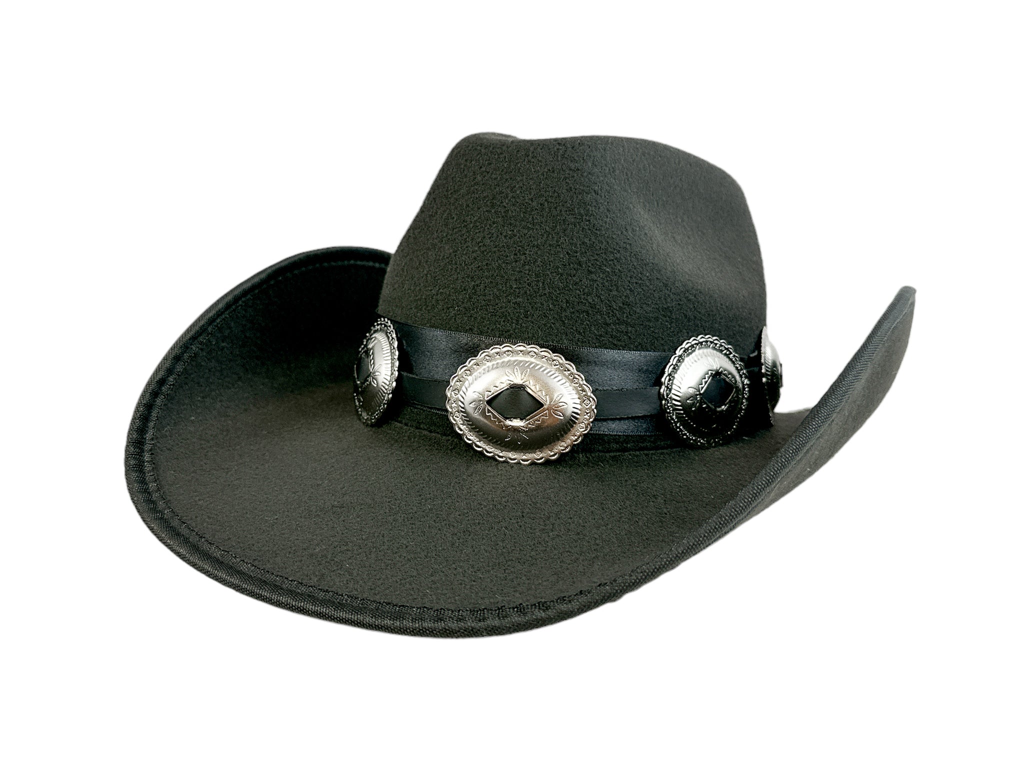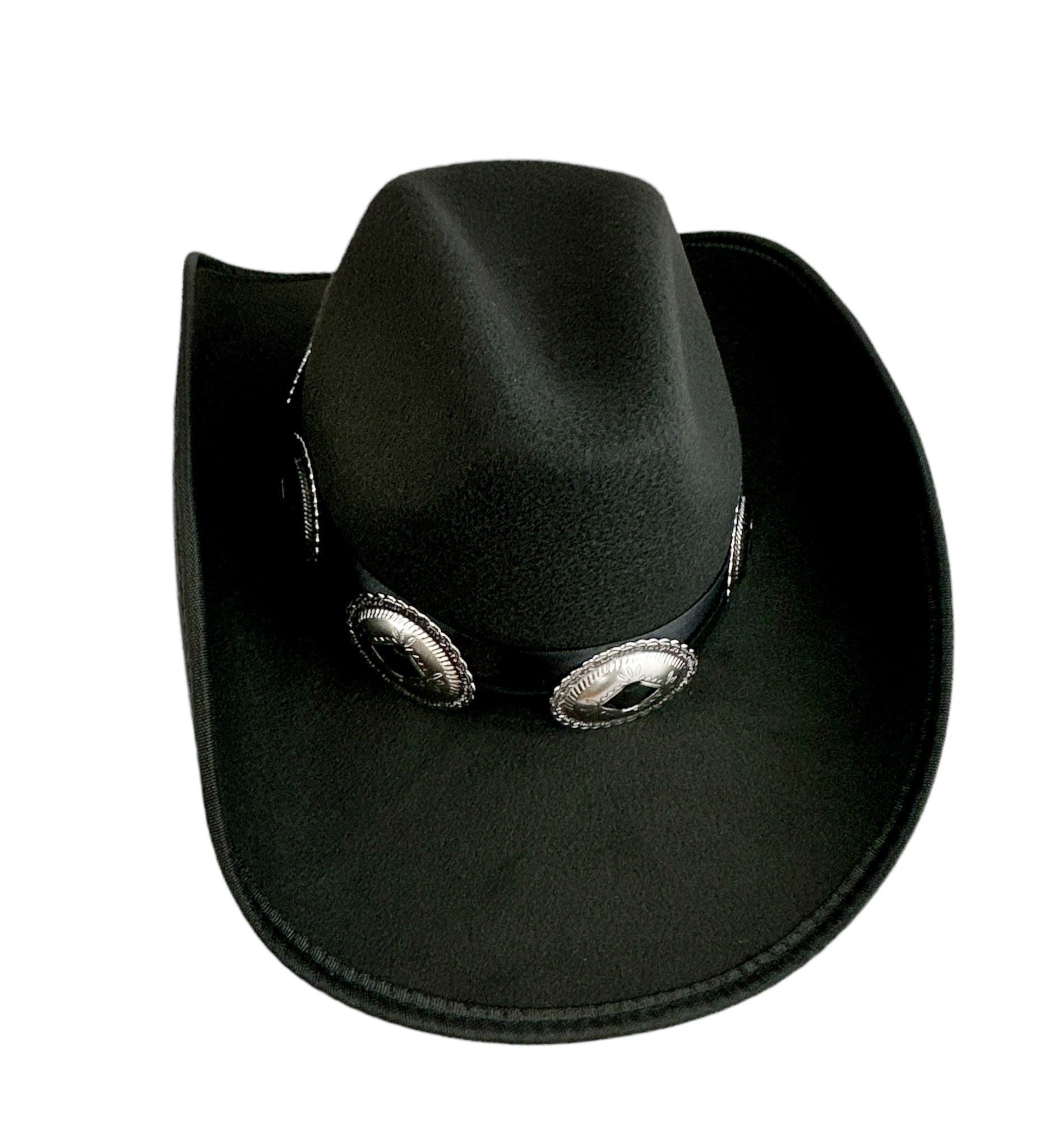 The black Traditional Western hat will get everyone in the mood to kick up their heels! The Texan Hat features a black band decorated with Conch. The hat is adult-sized.