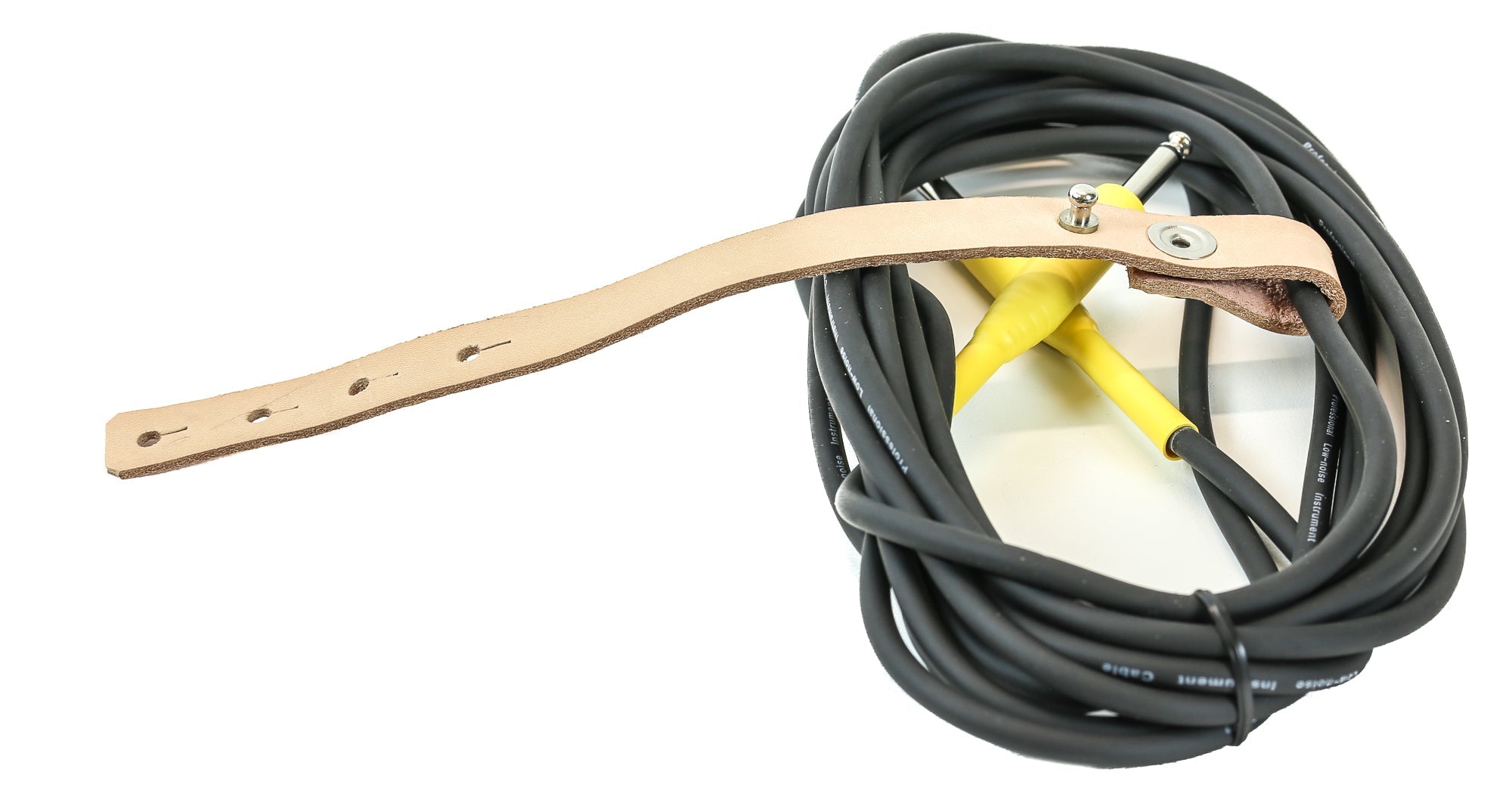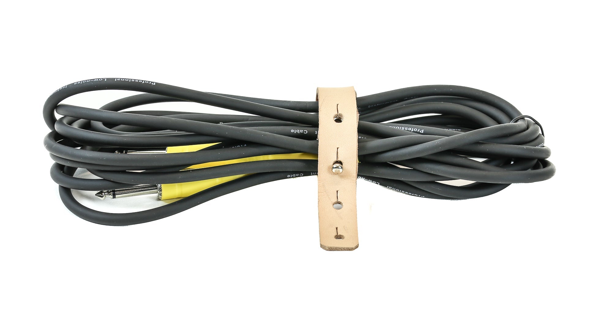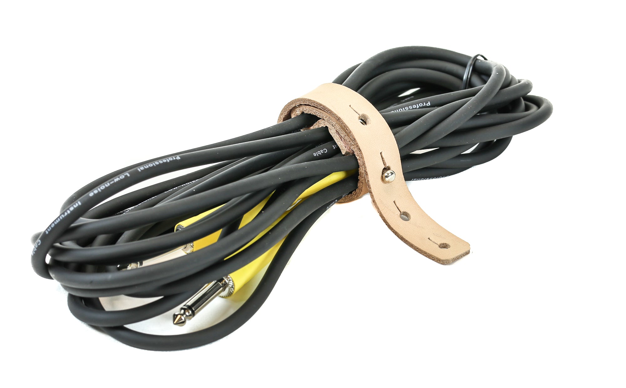 3/4" Genuine Leather Cable Organizer.  Leave It With The Cable Snapped.  So You Will Not Misplace This.  Snap The Cable First And Then Tie After Your Done With Your Gig.  Tie As Tight As You Want, There Are 4 Holes And Saddle Button Spike.  We reckoned get the 4 pack.