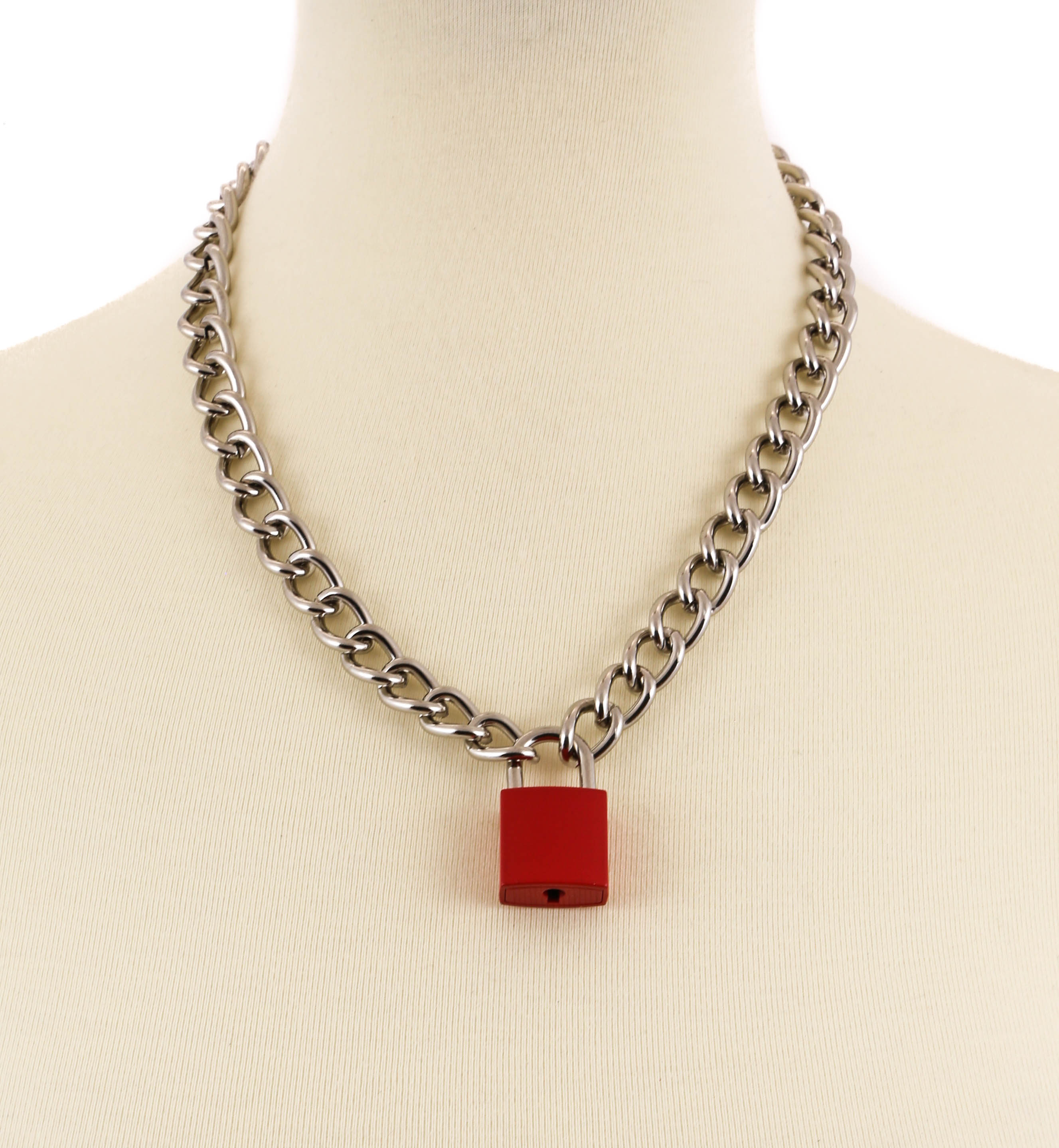 Red Square Padlock Silver Steel Chain Pendant Choker