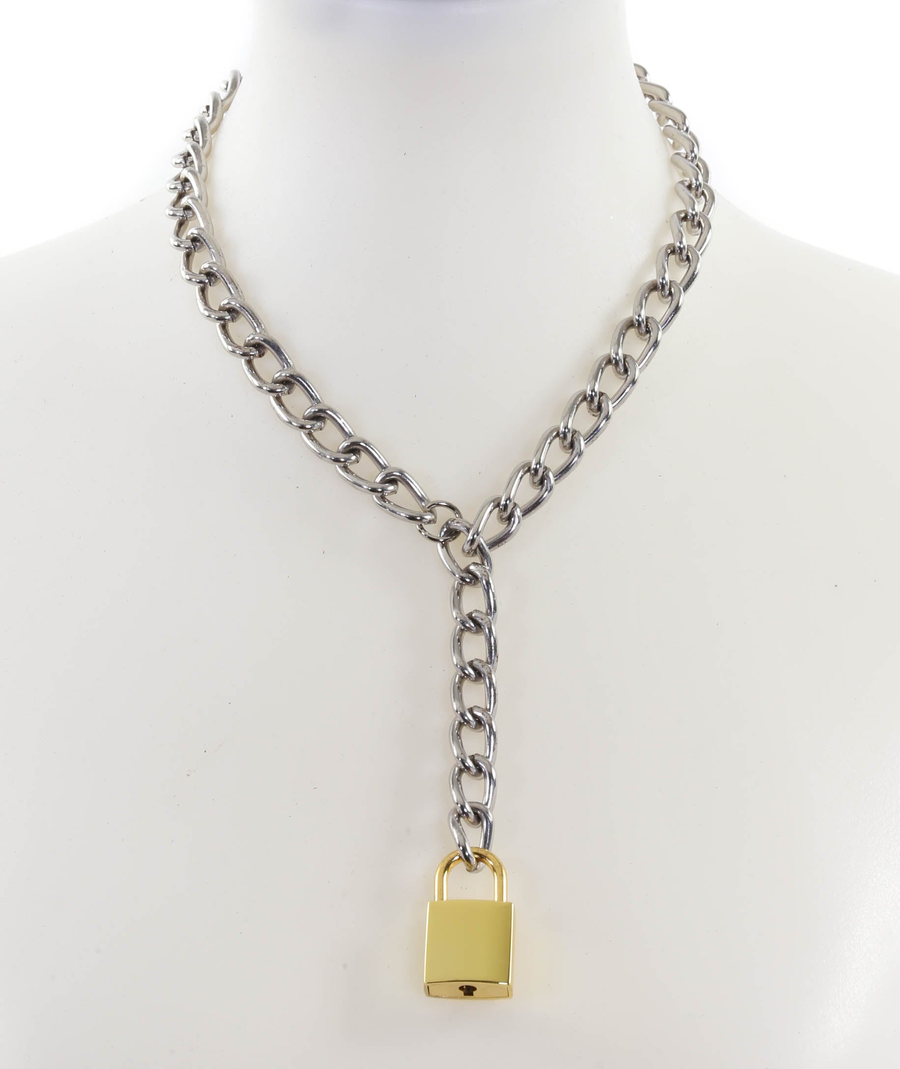 Hanging Gold Square Lock Pendant Silver Steel Cain Choker Necklace
