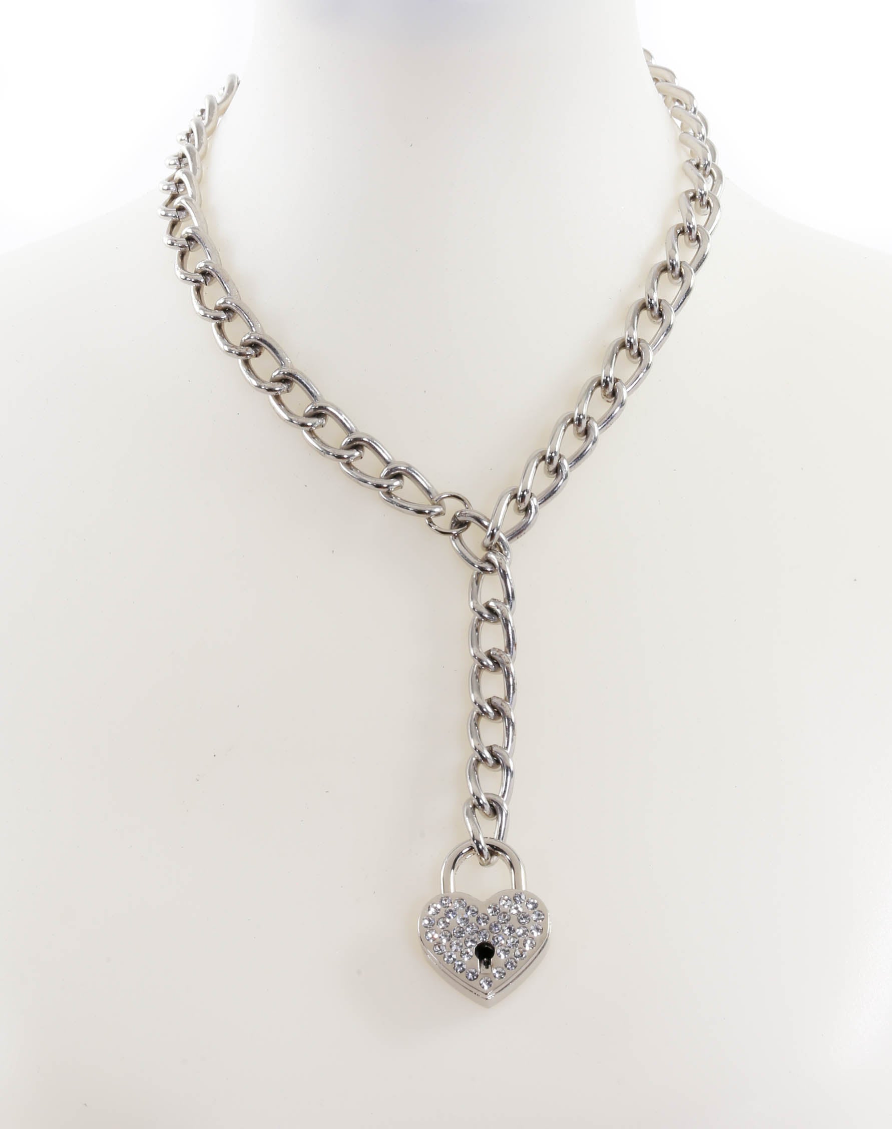 Hanging Rhinestone Heart Lock Pendant Silver Steel Cain Choker Necklace