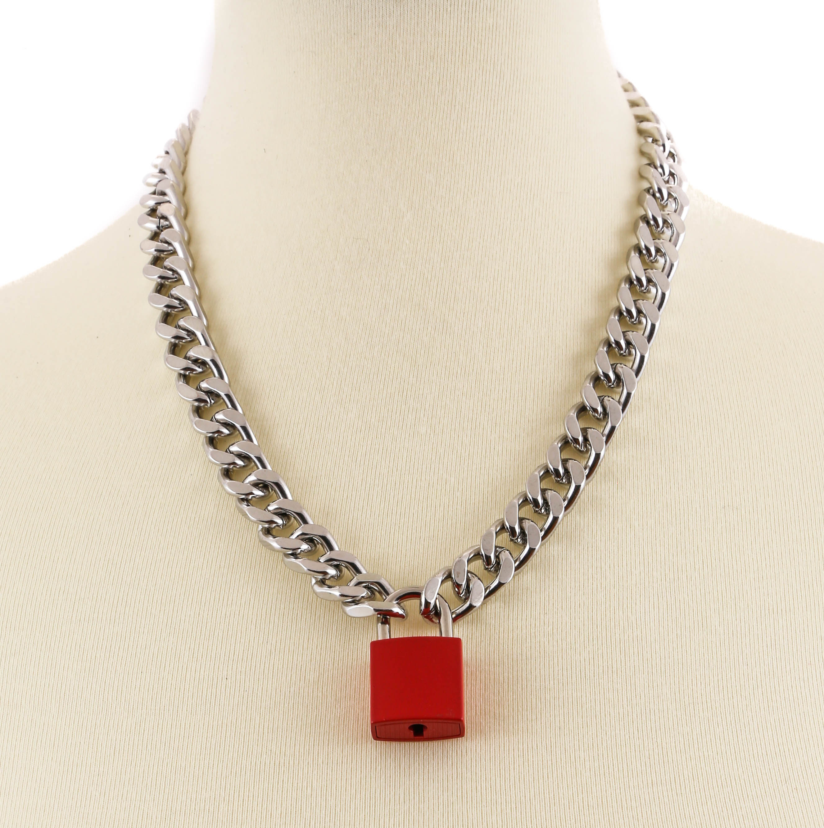 Red Square Padlock Silver Cuban Chain Pendant Choker