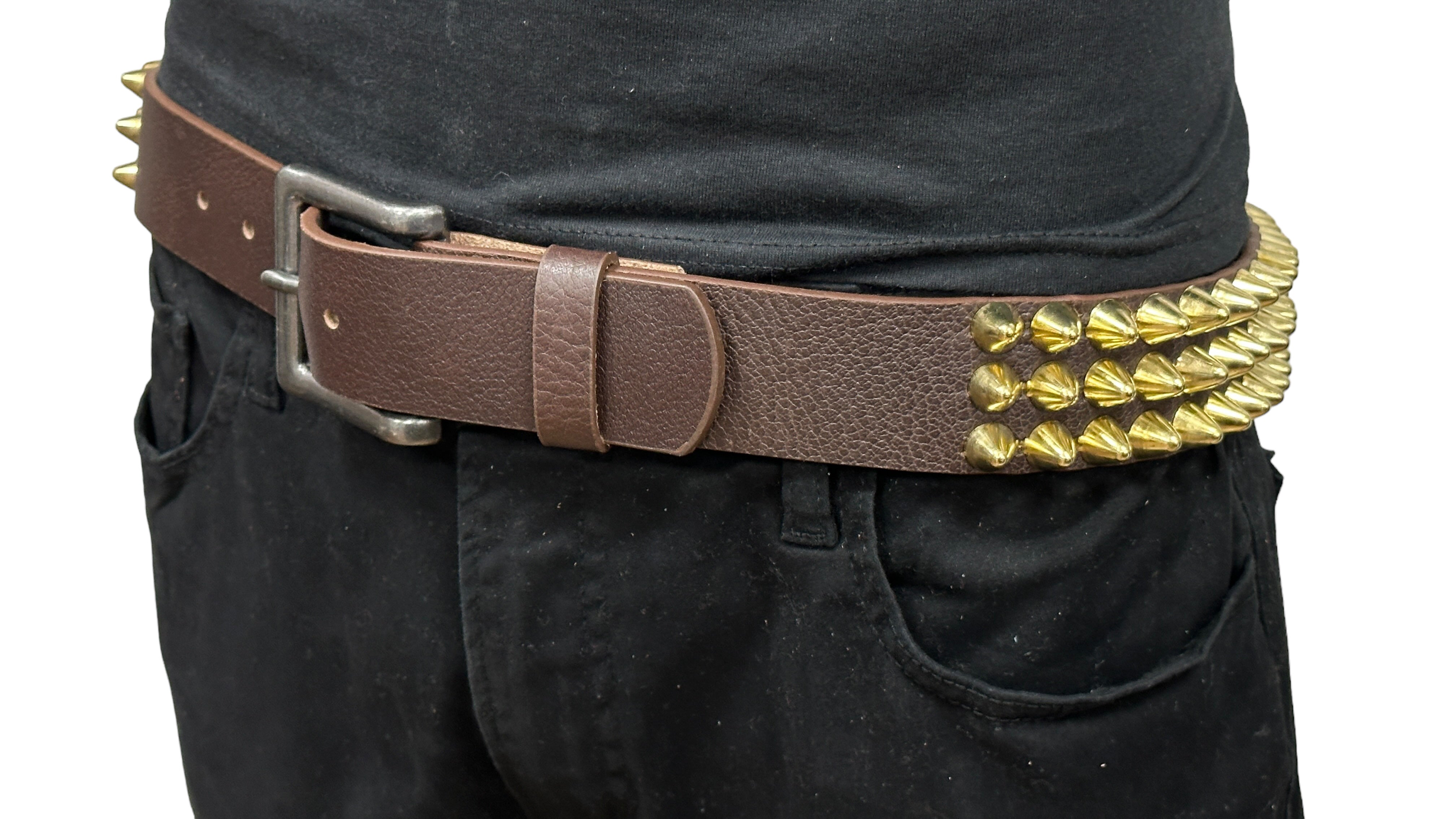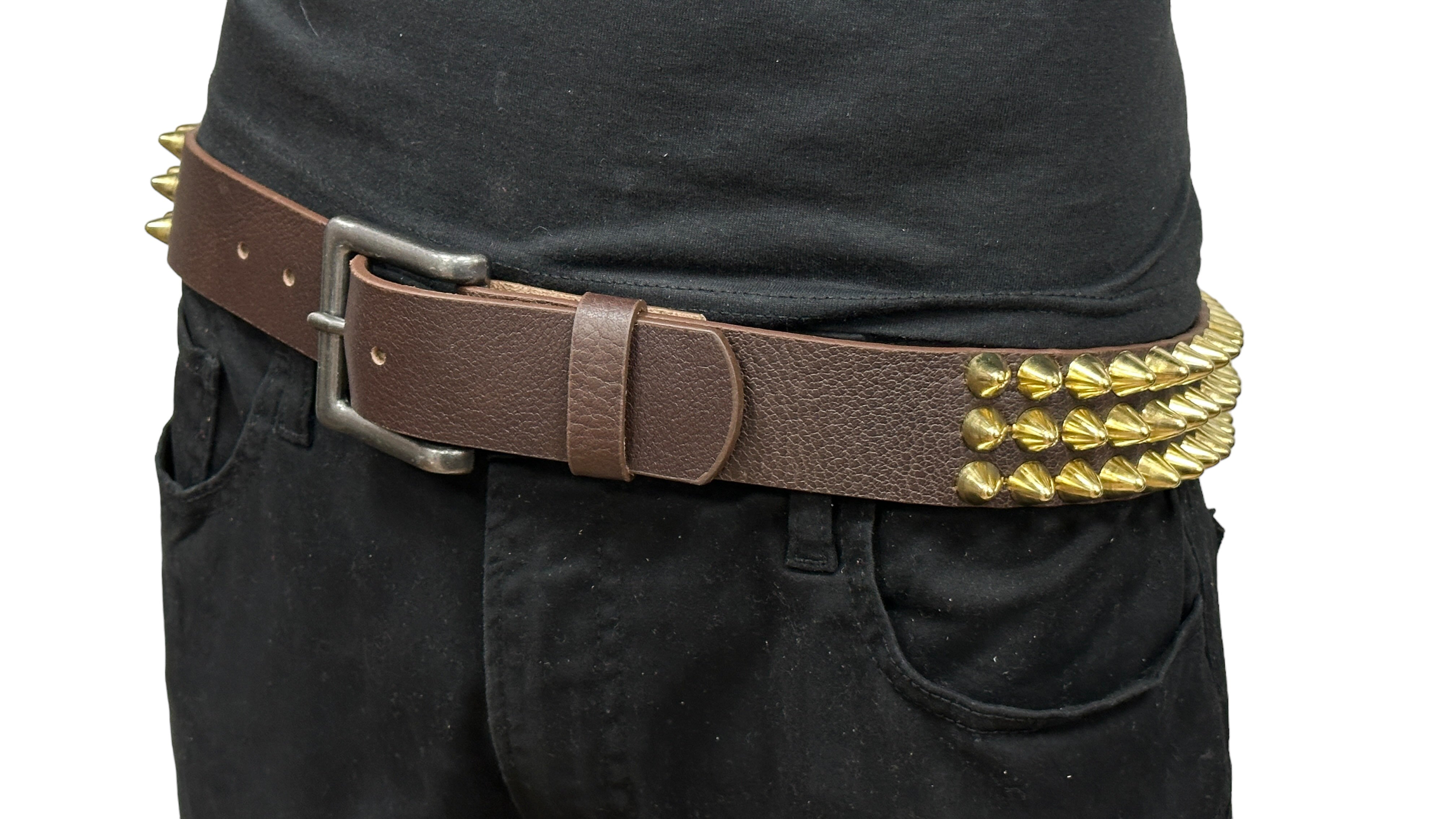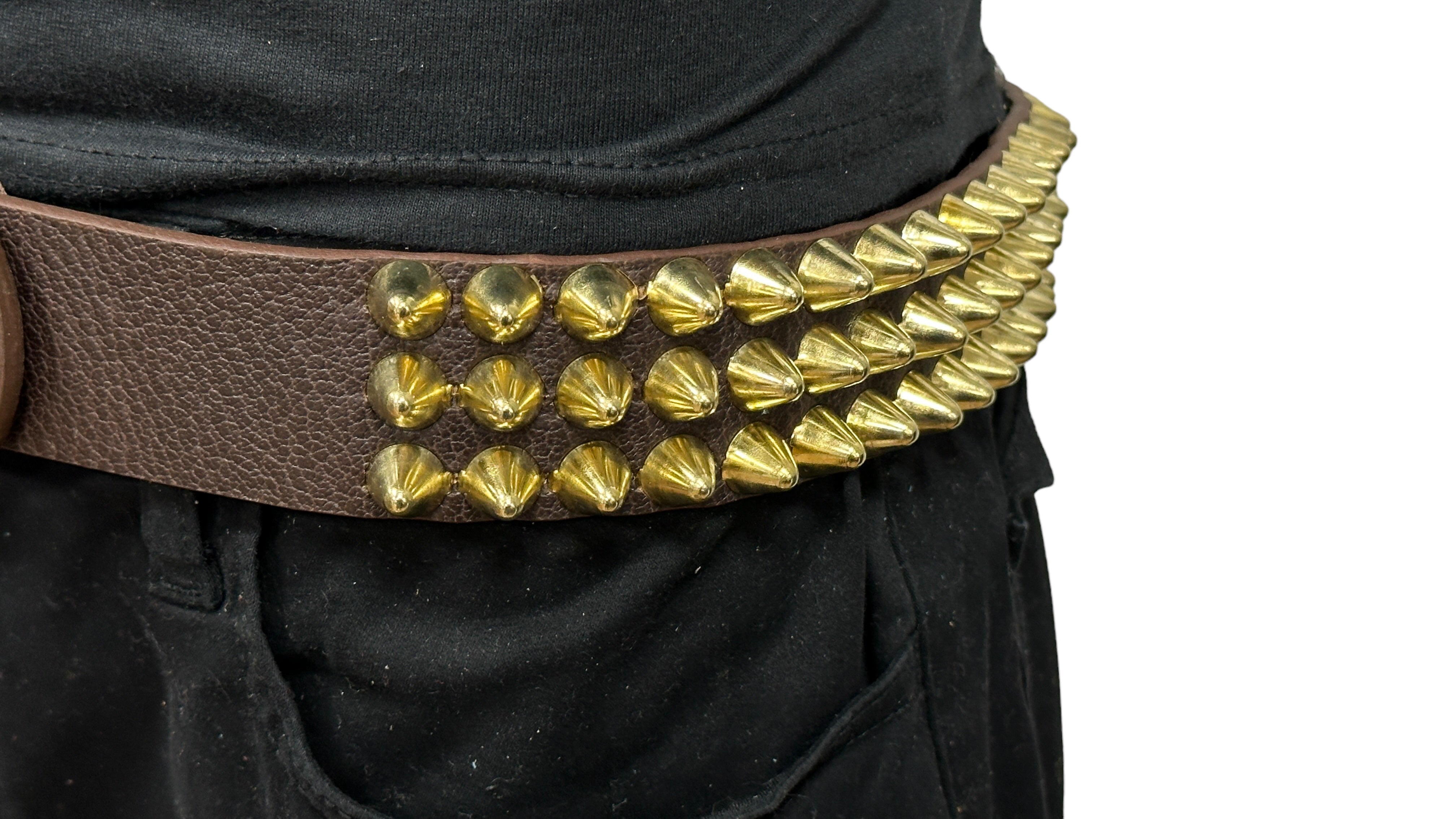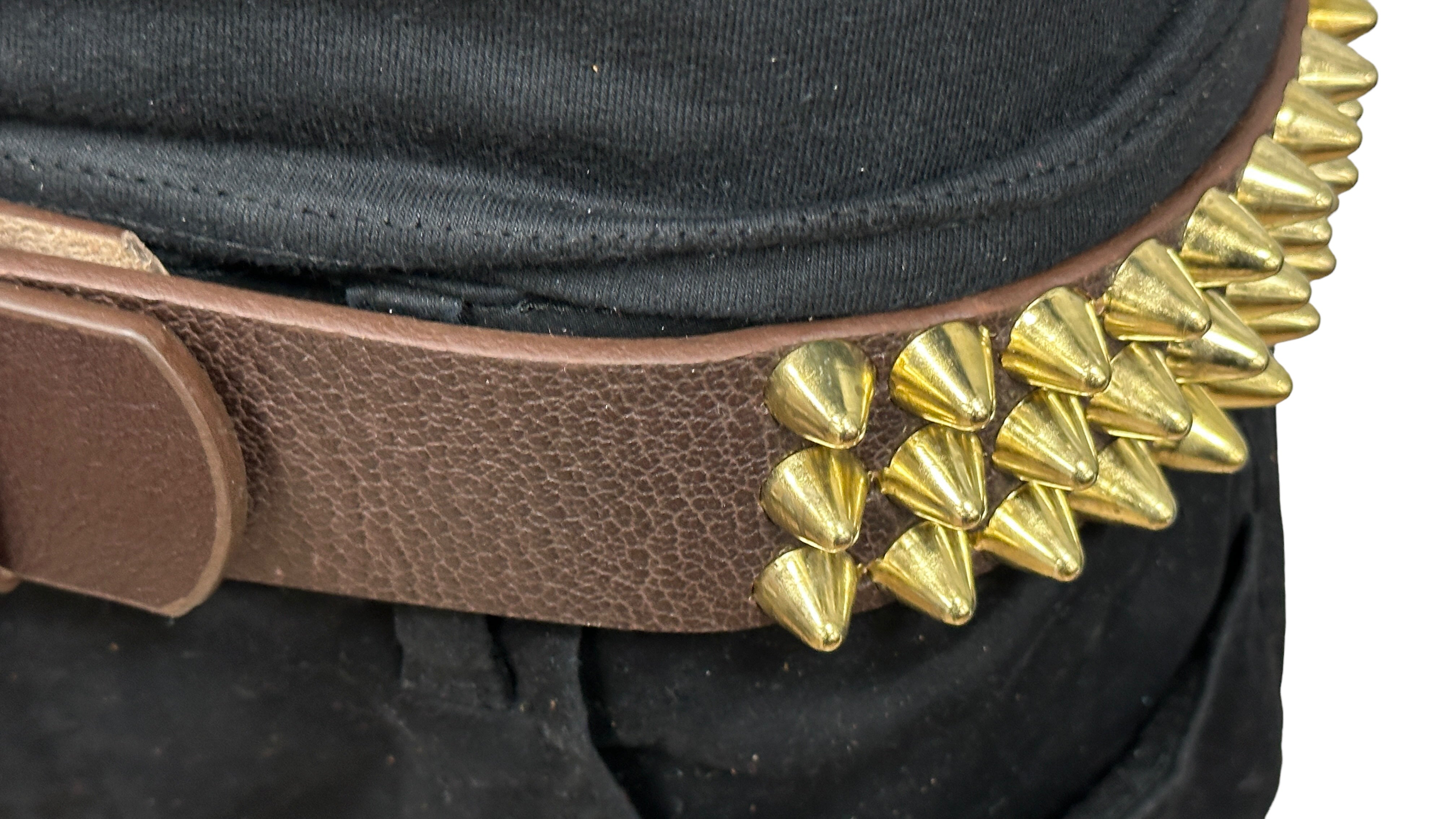 BROWN LEATHER THREE ROW UK77 CONE STUDDED GENUINE LEATHER BELT