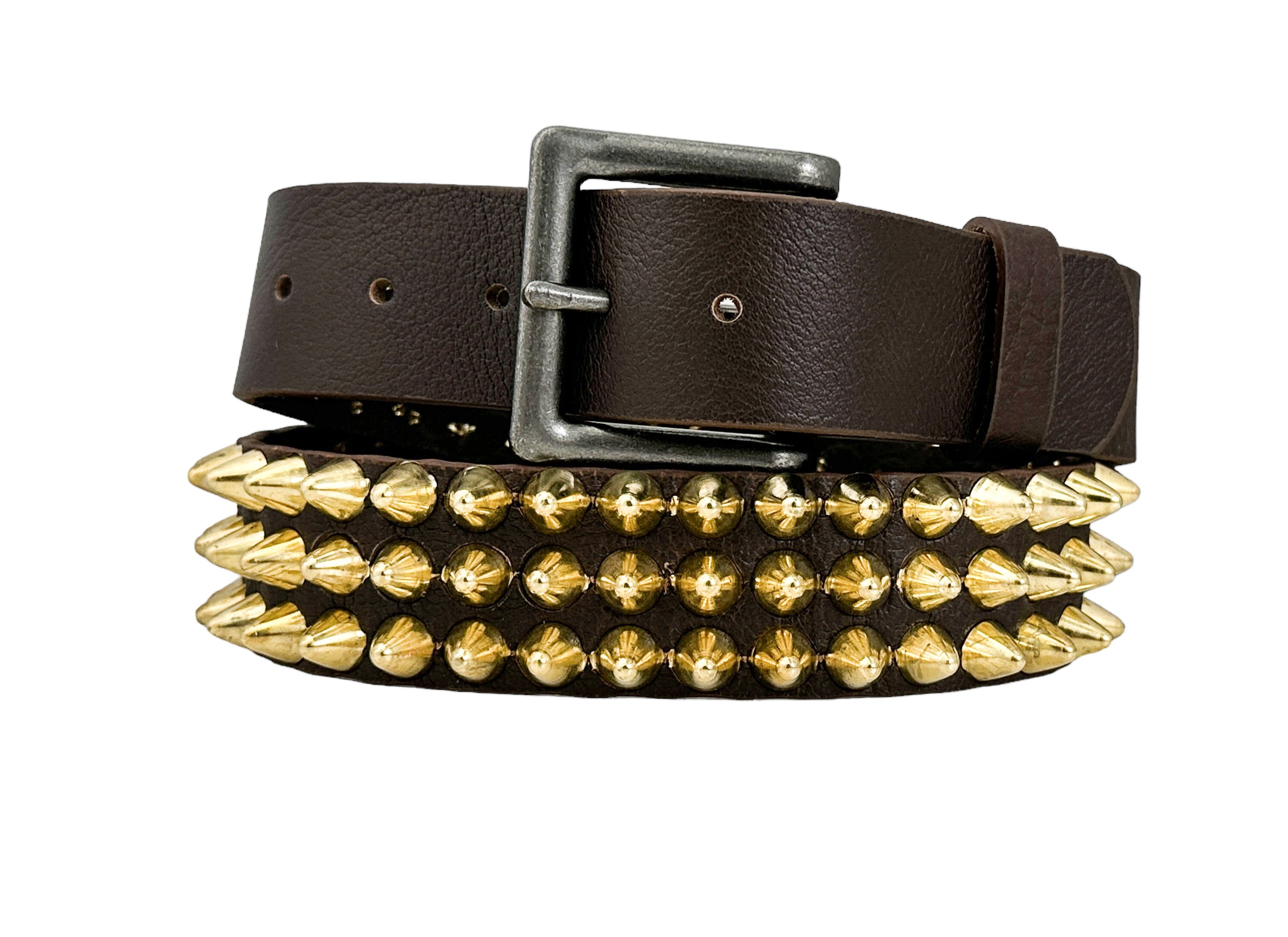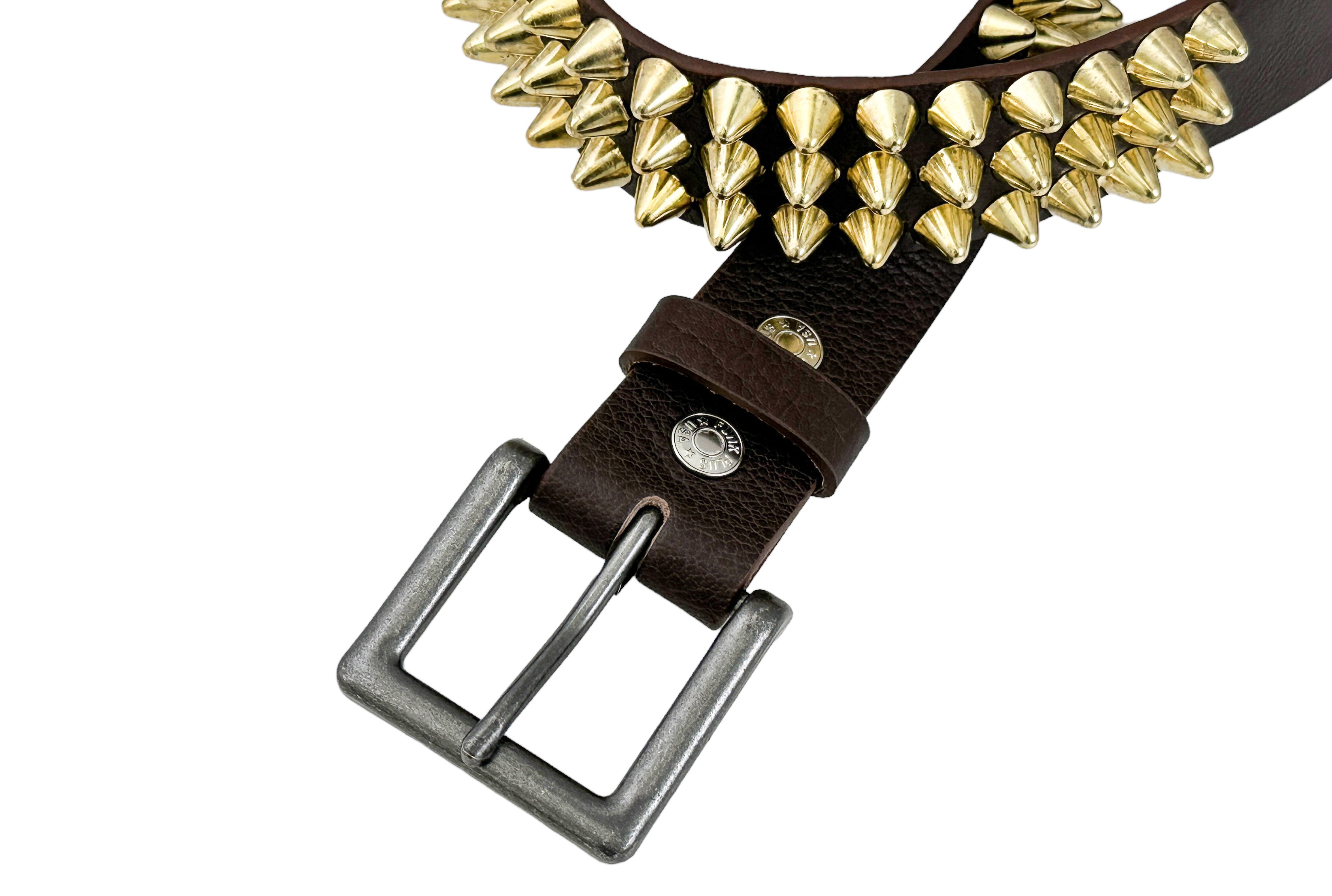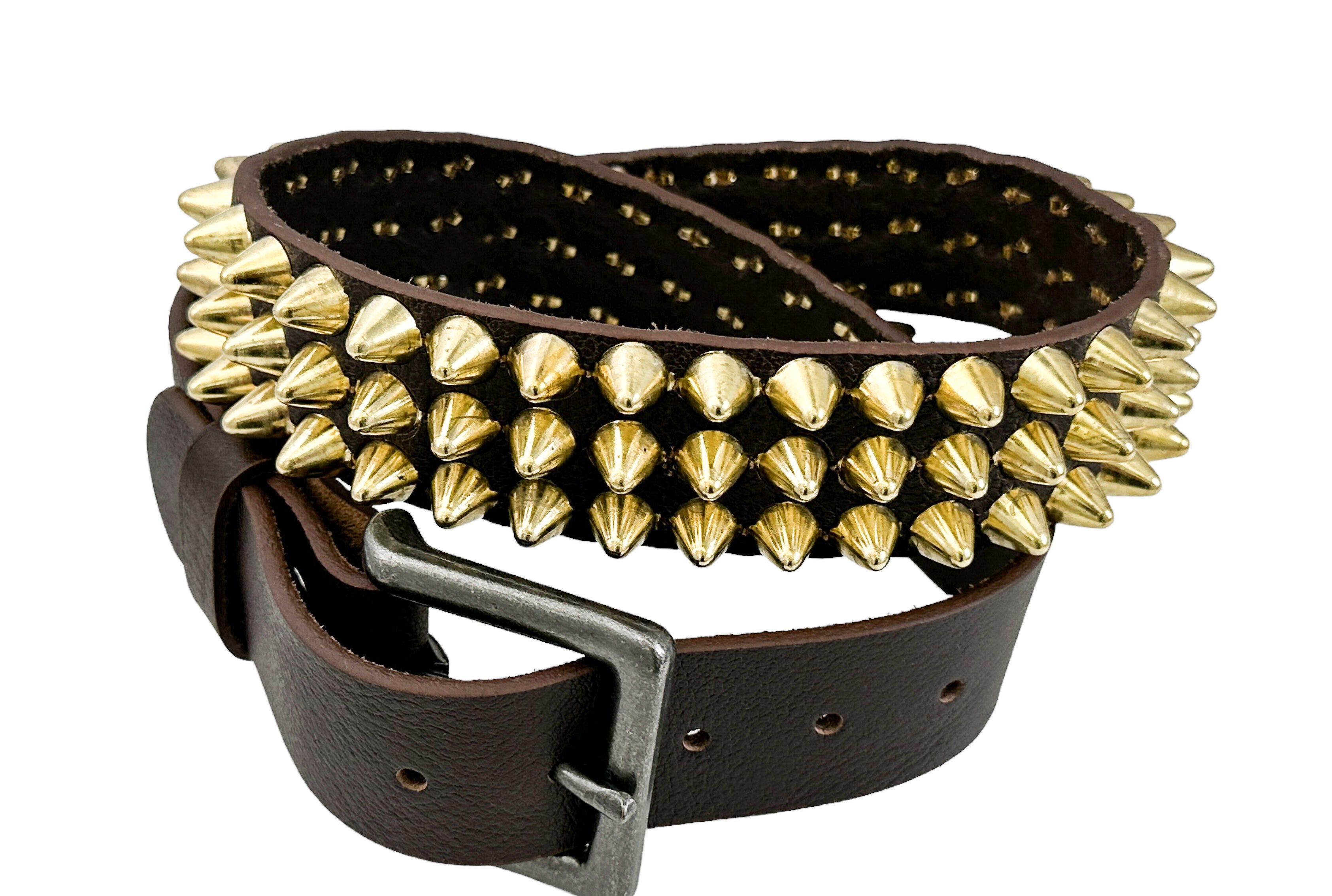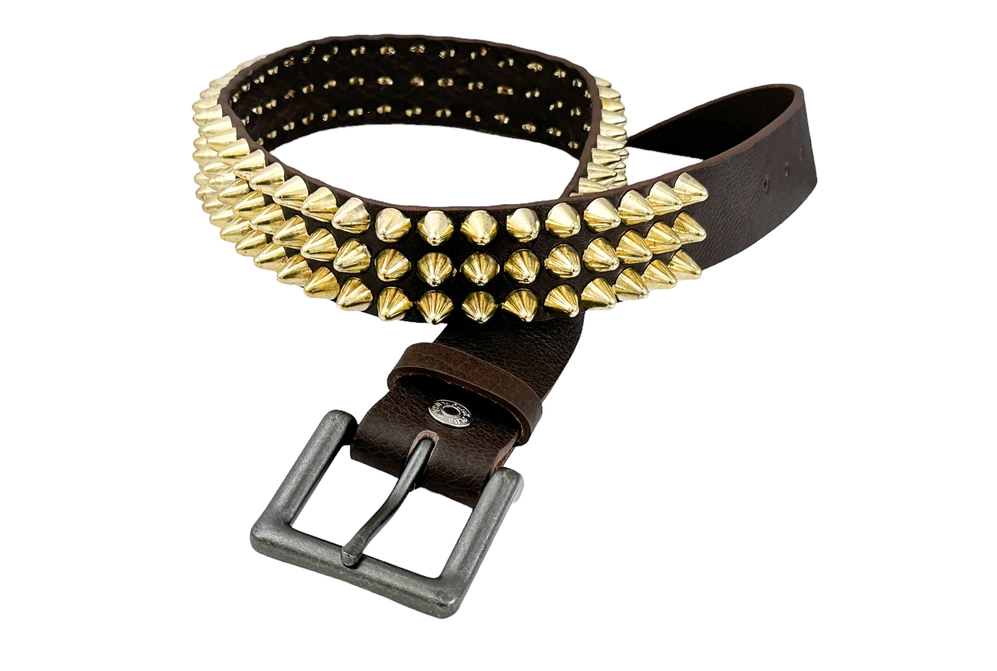 BROWN LEATHER THREE ROW GOLD UK77 CONE STUDDED GENUINE LEATHER BELT