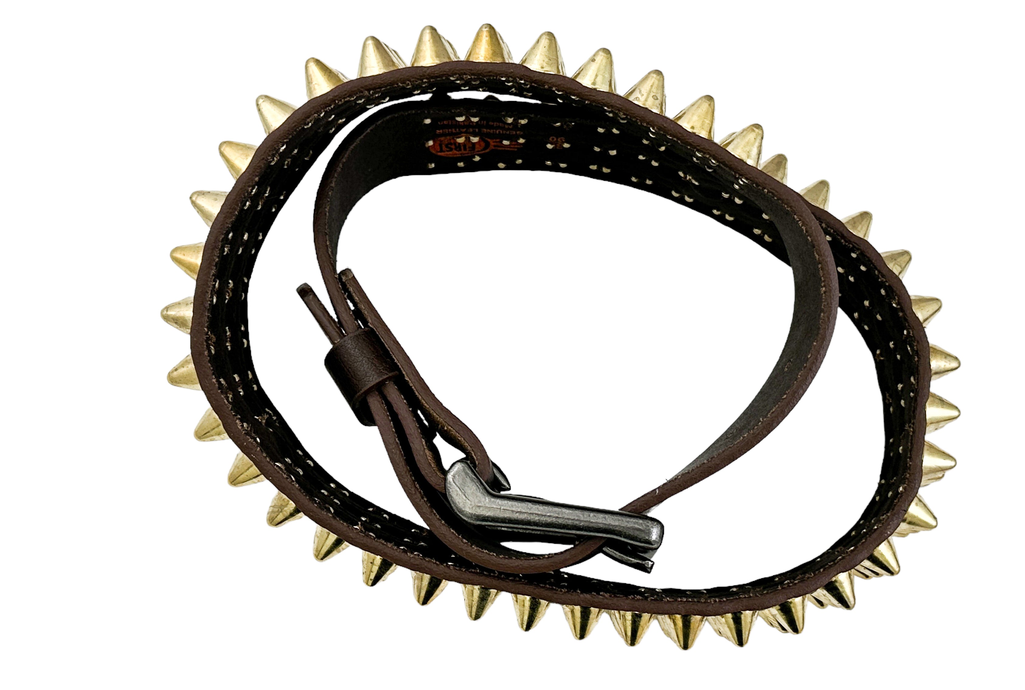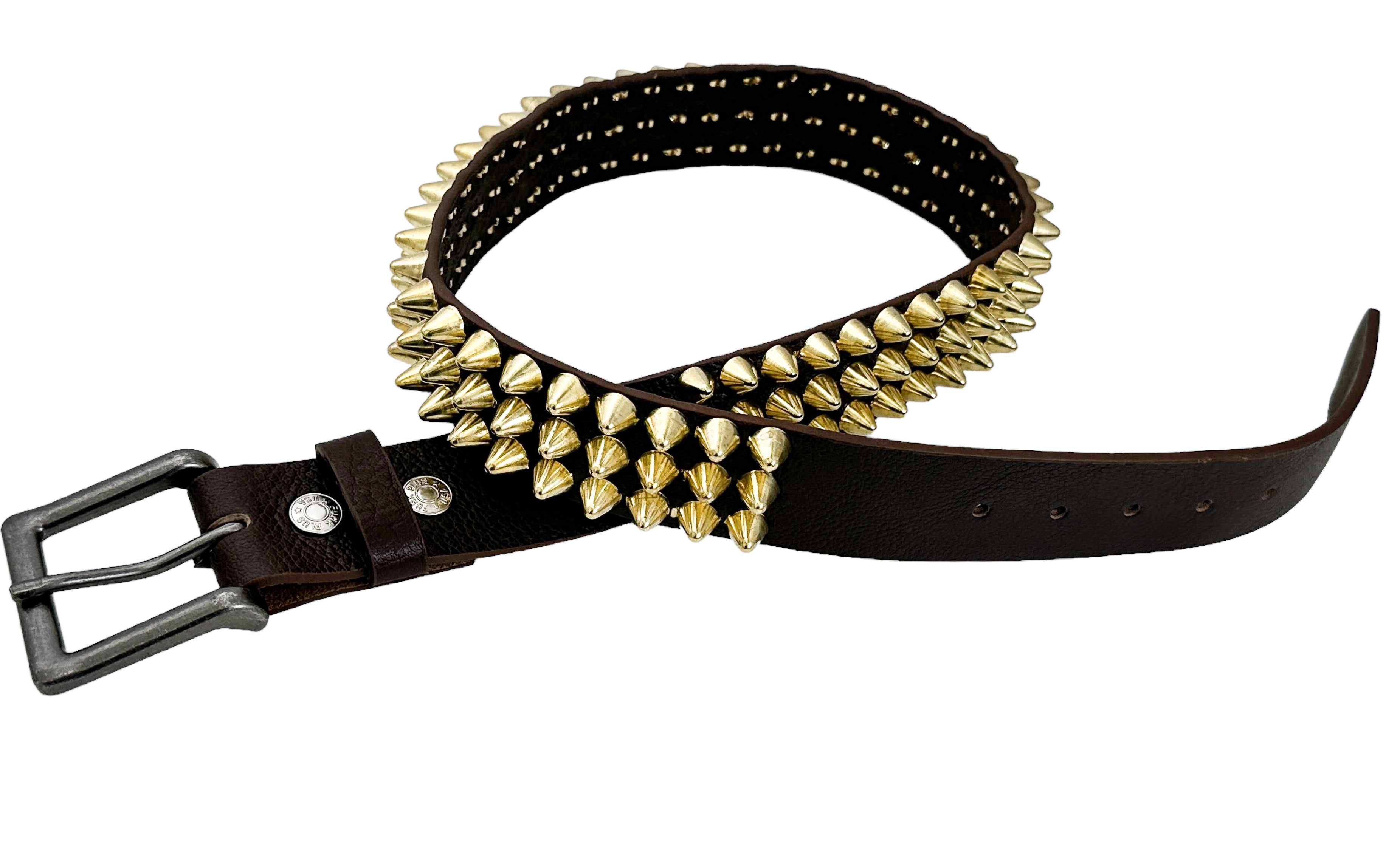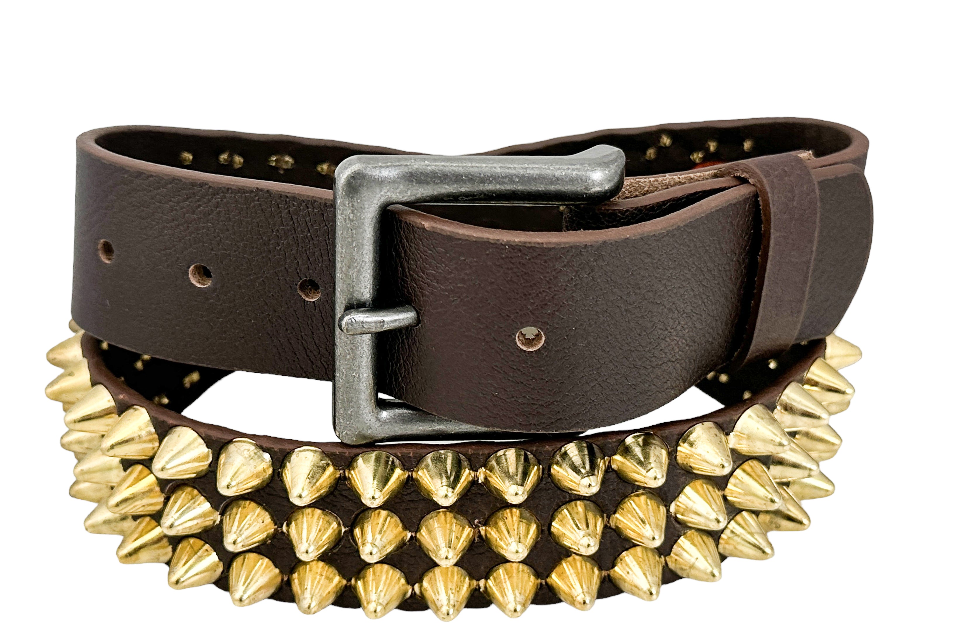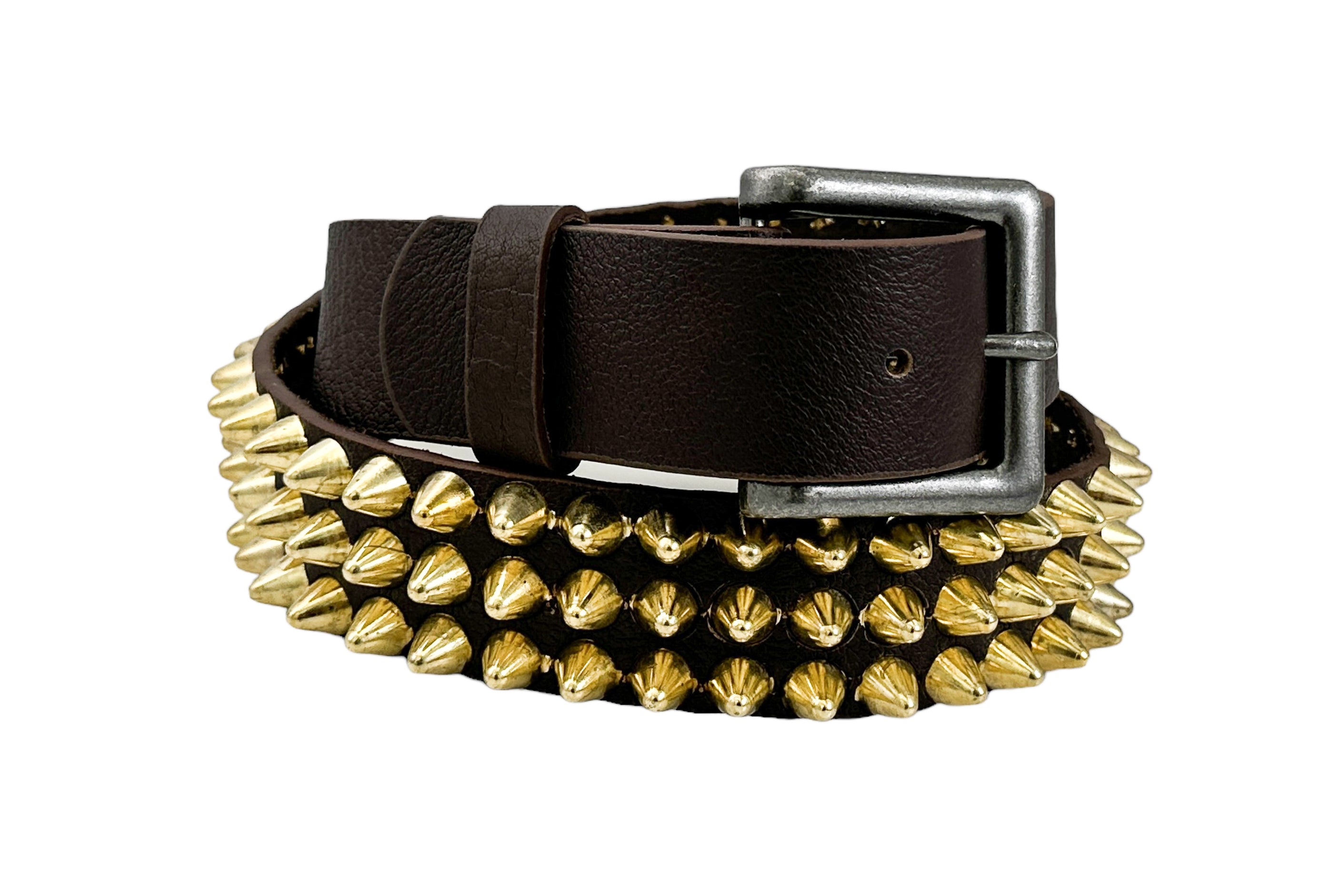BROWN LEATHER THREE ROW GOLD UK77 CONE STUDDED GENUINE LEATHER BELT