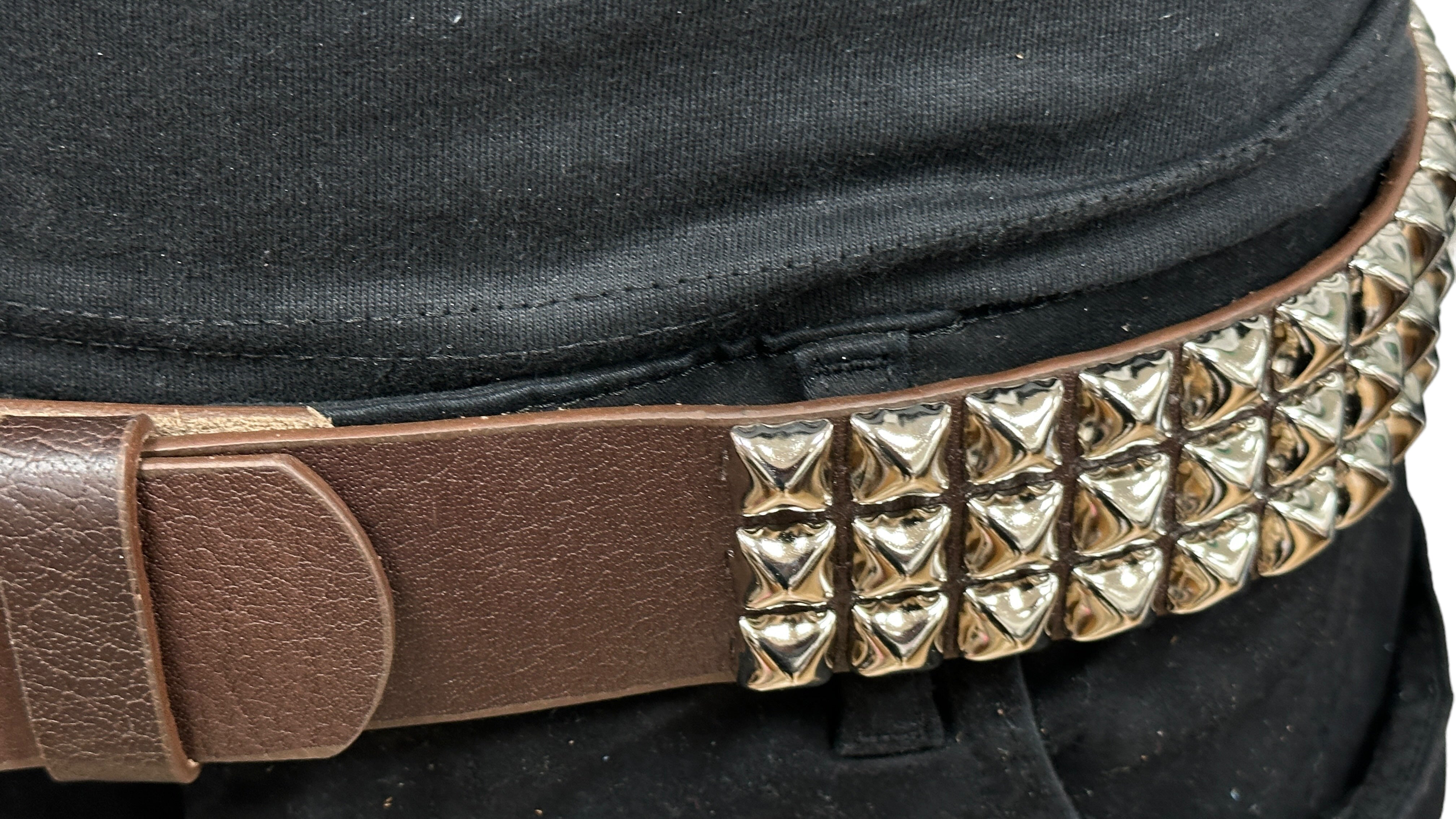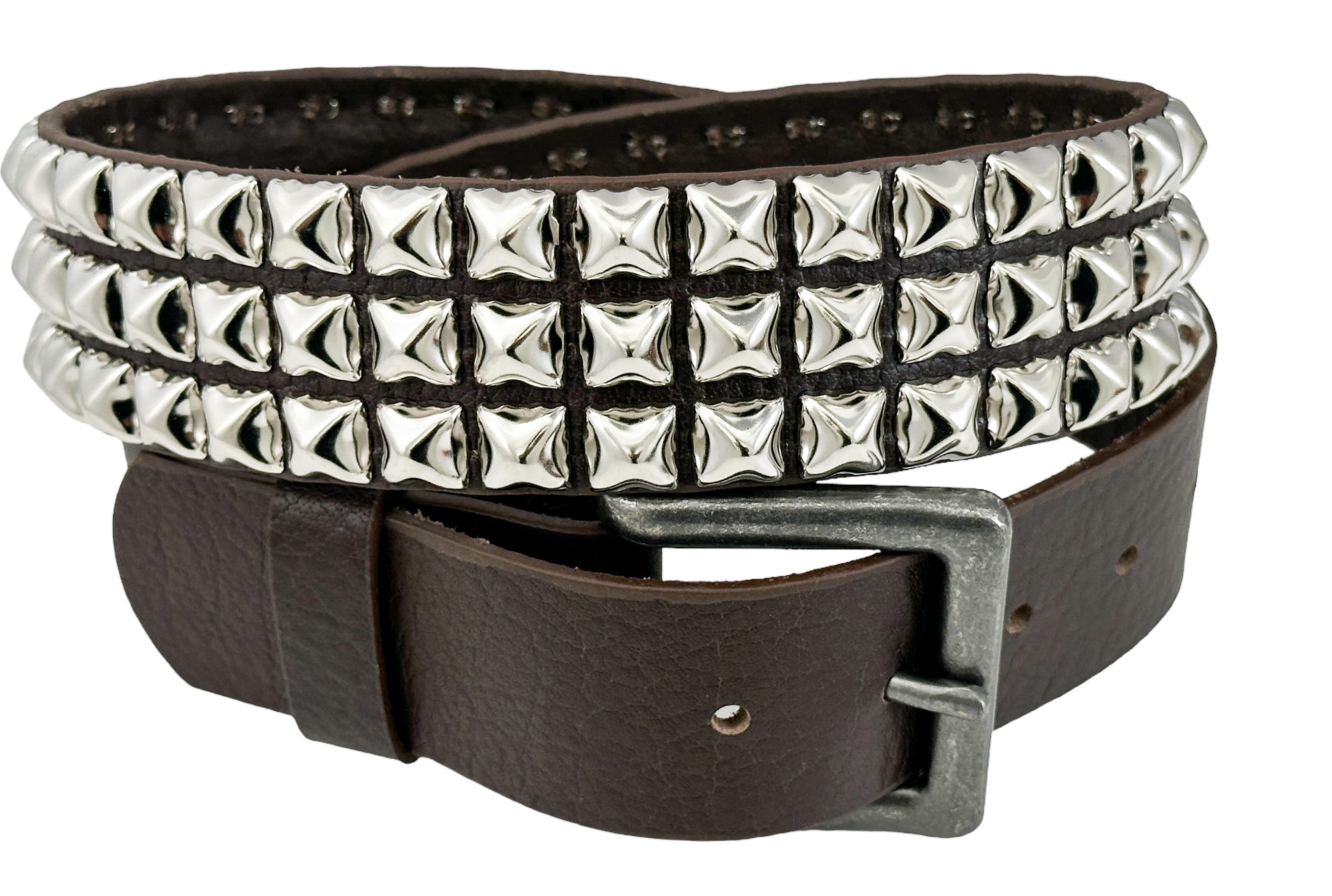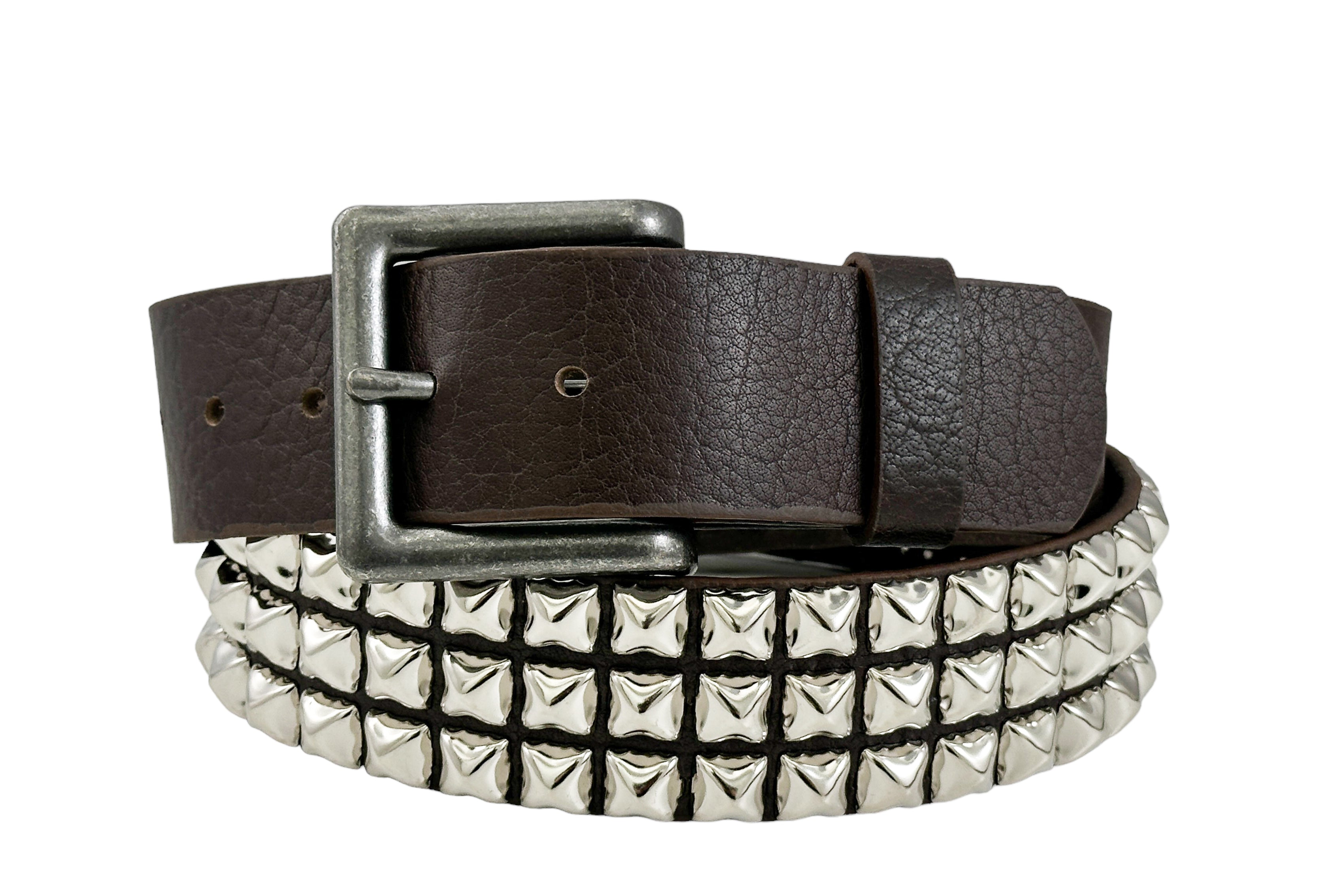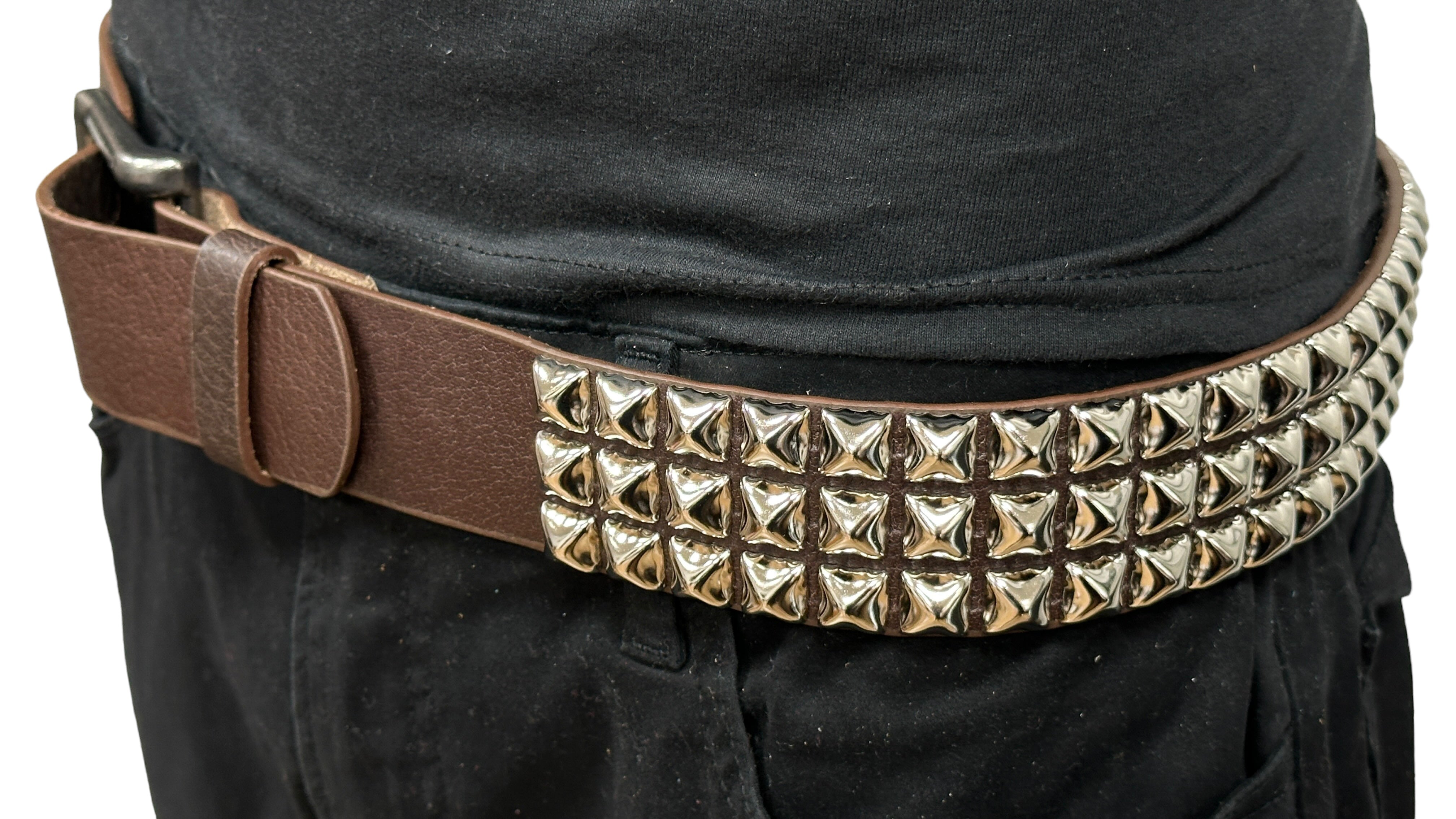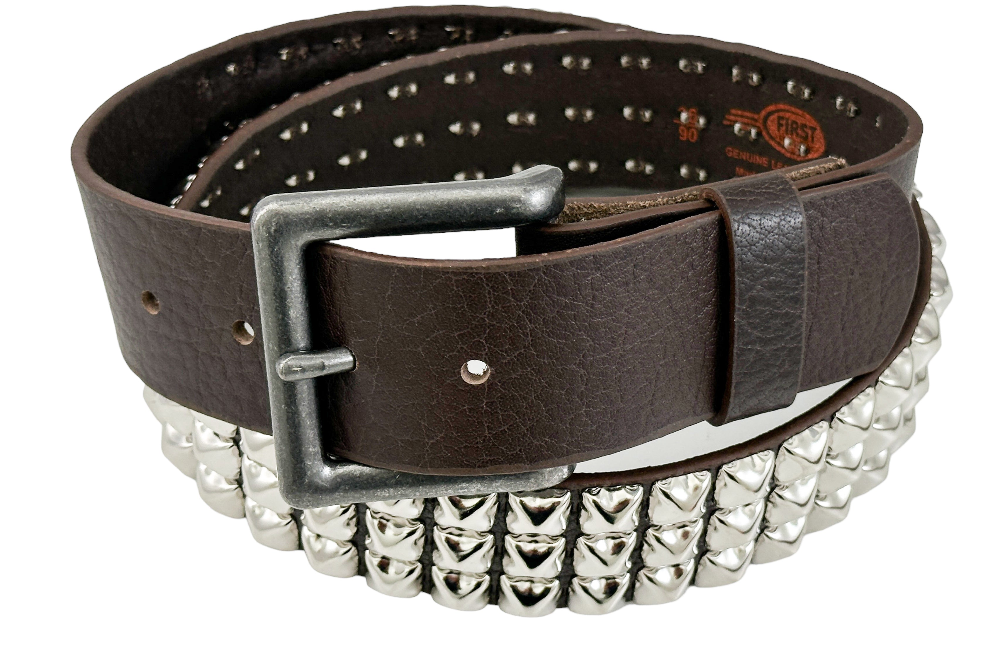 BROWN LEATHER THREE ROW STUDDED GENUINE LEATHER BELT
