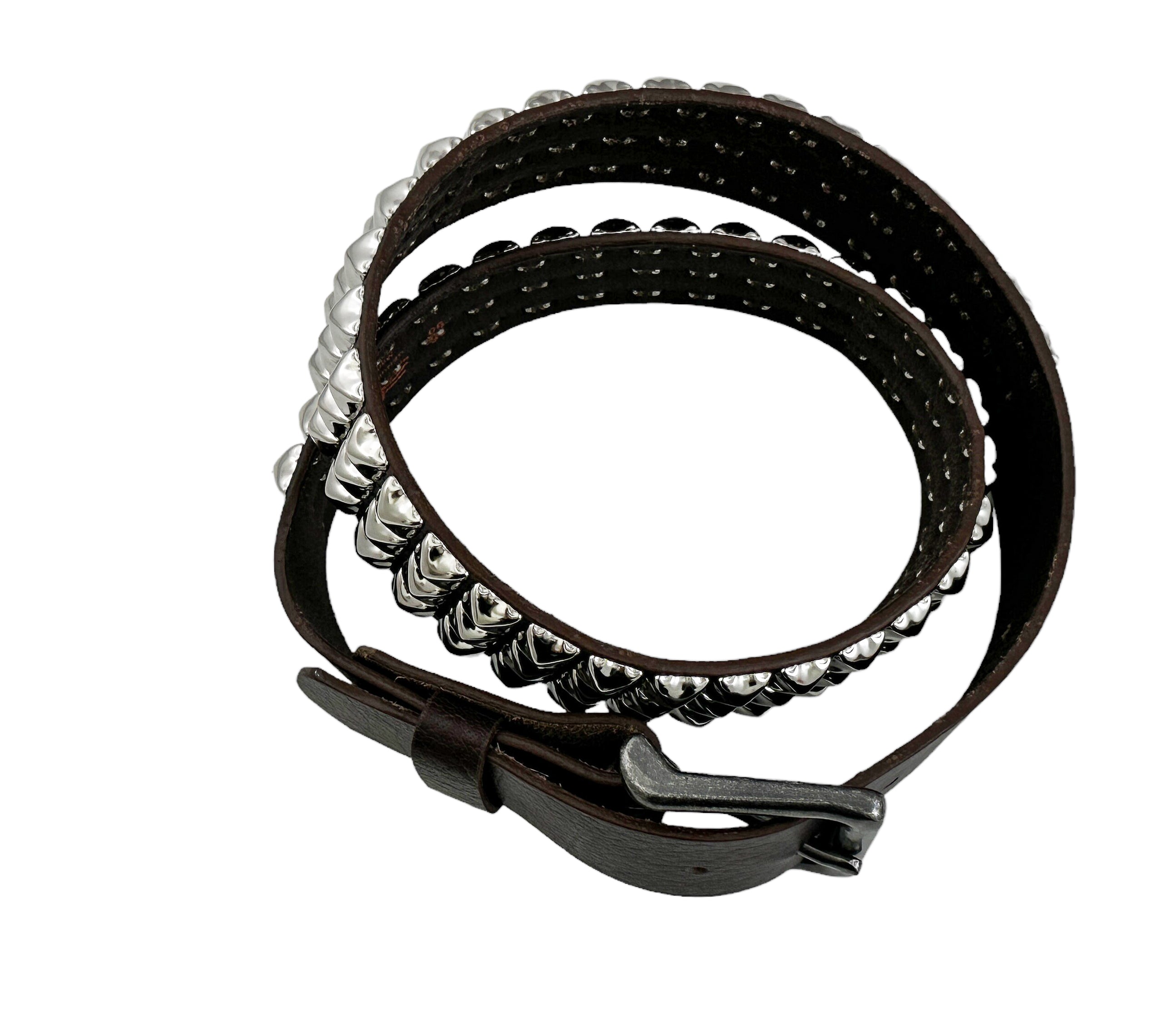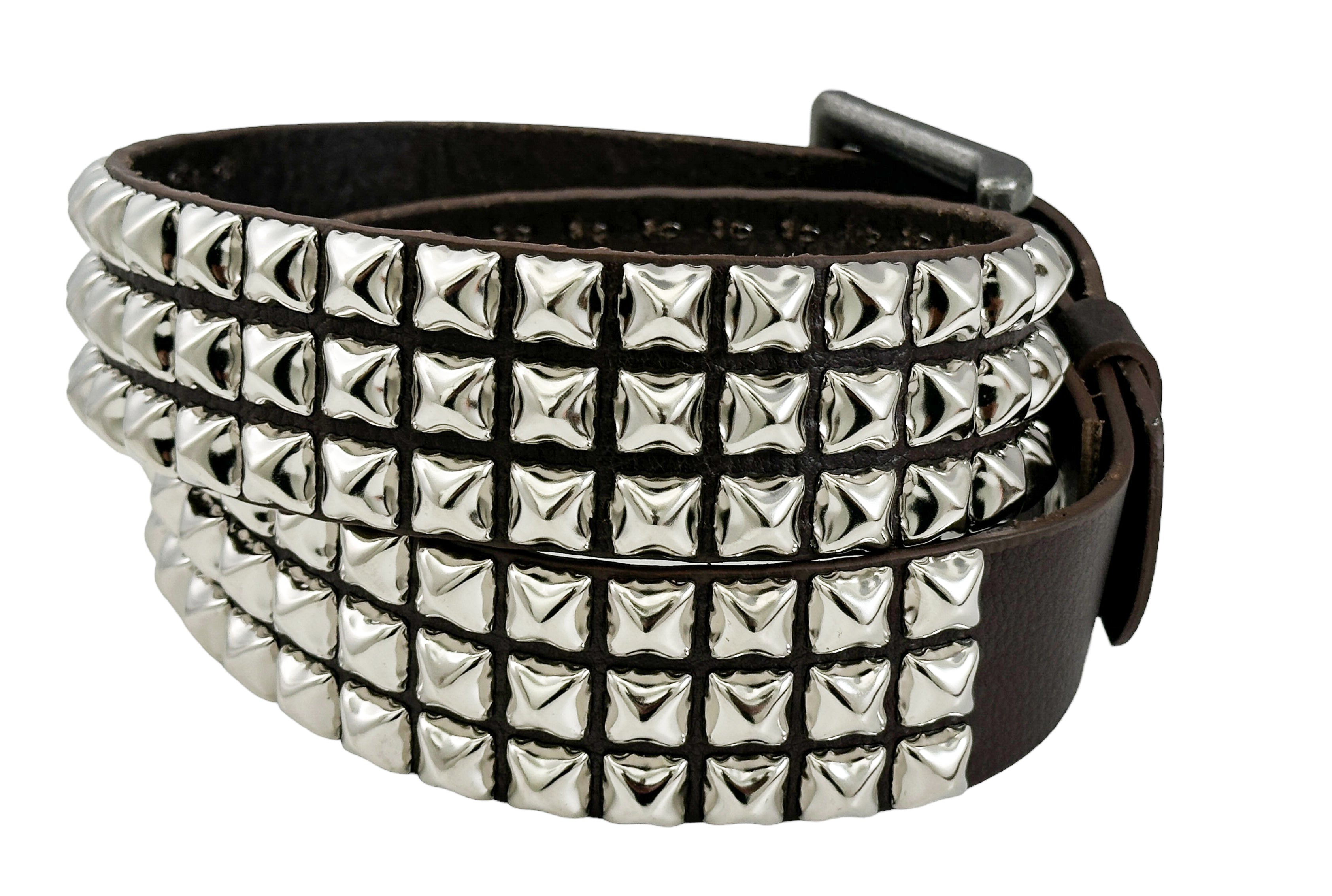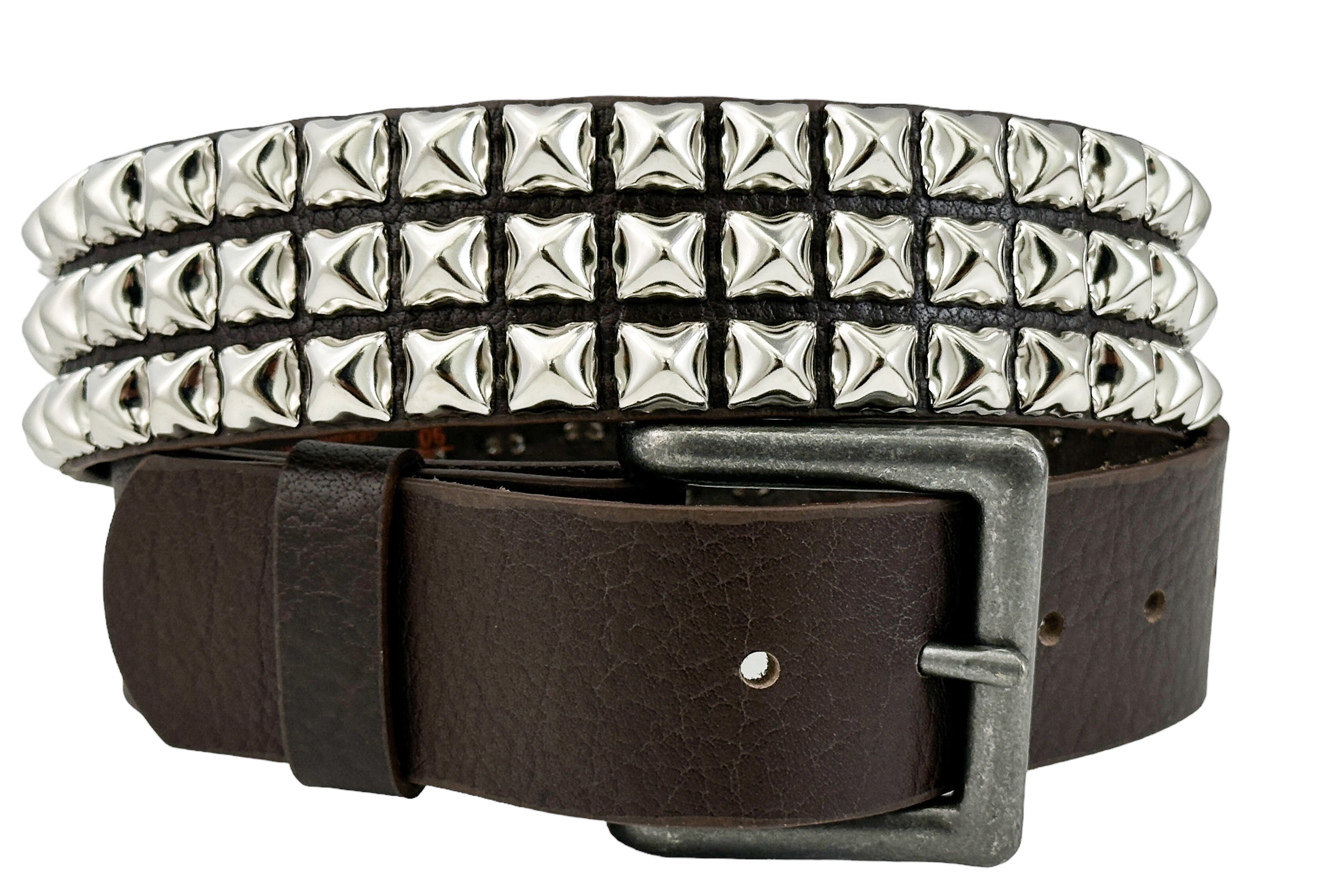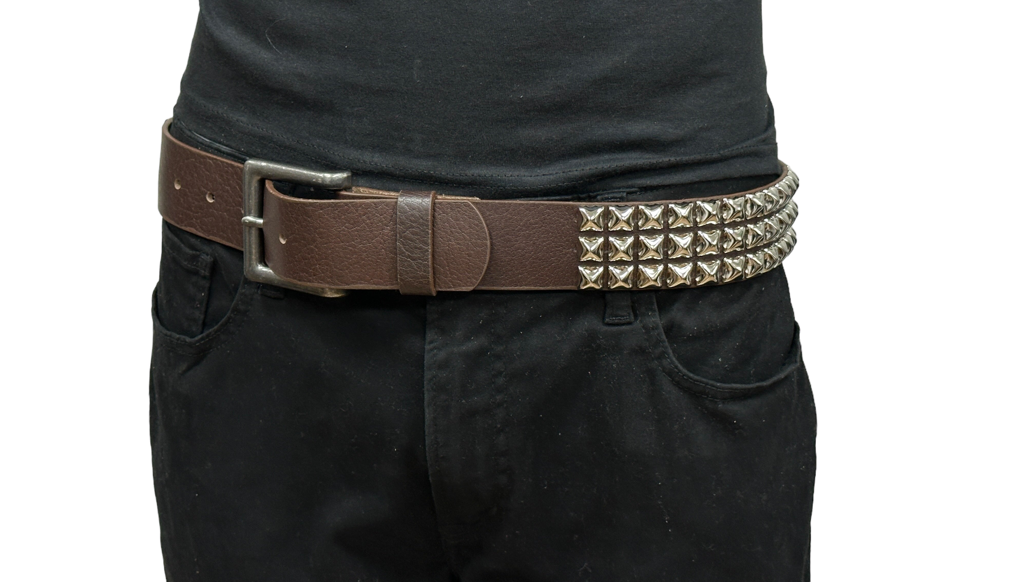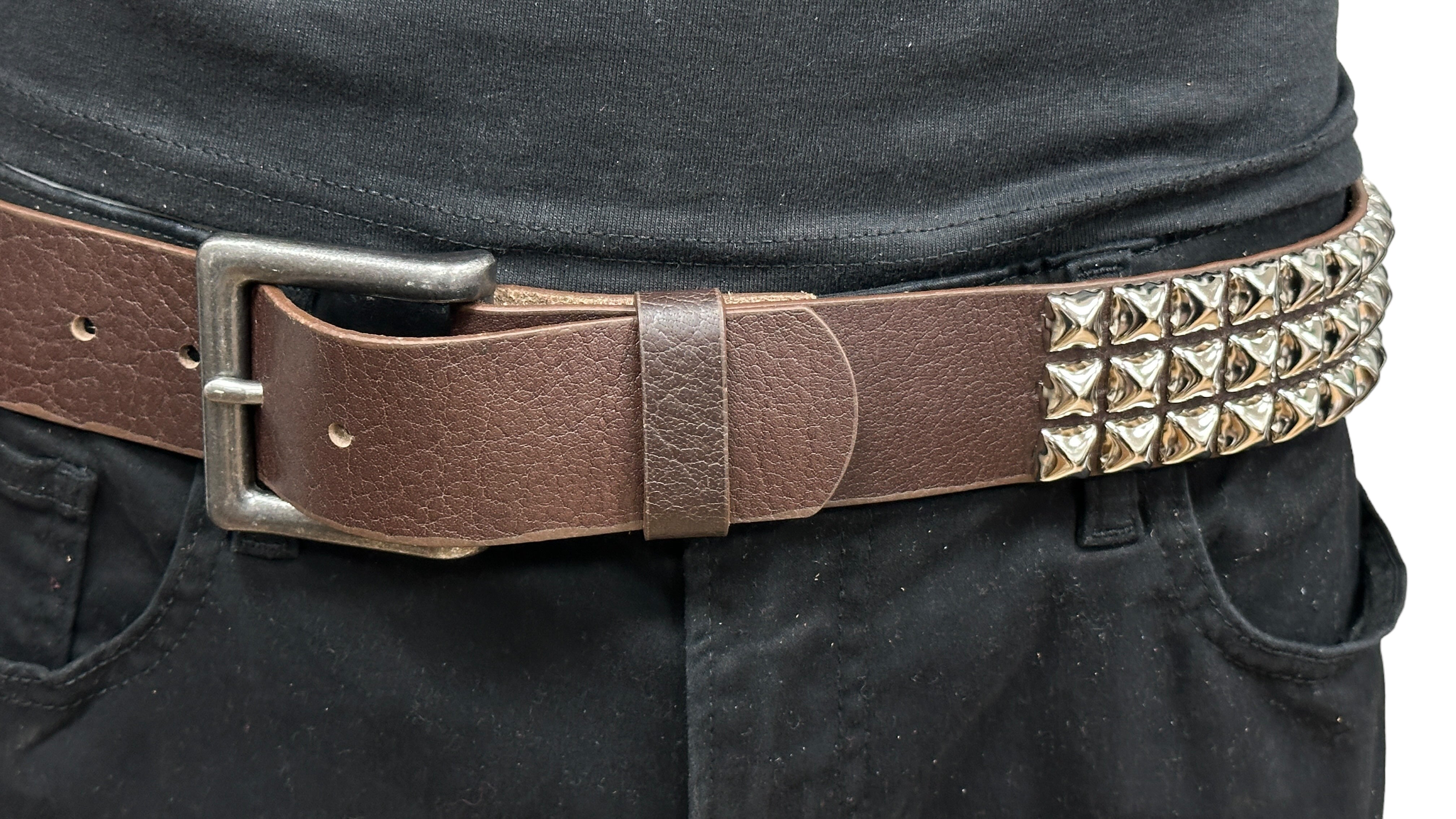 BROWN LEATHER THREE ROW STUDDED GENUINE LEATHER BELT