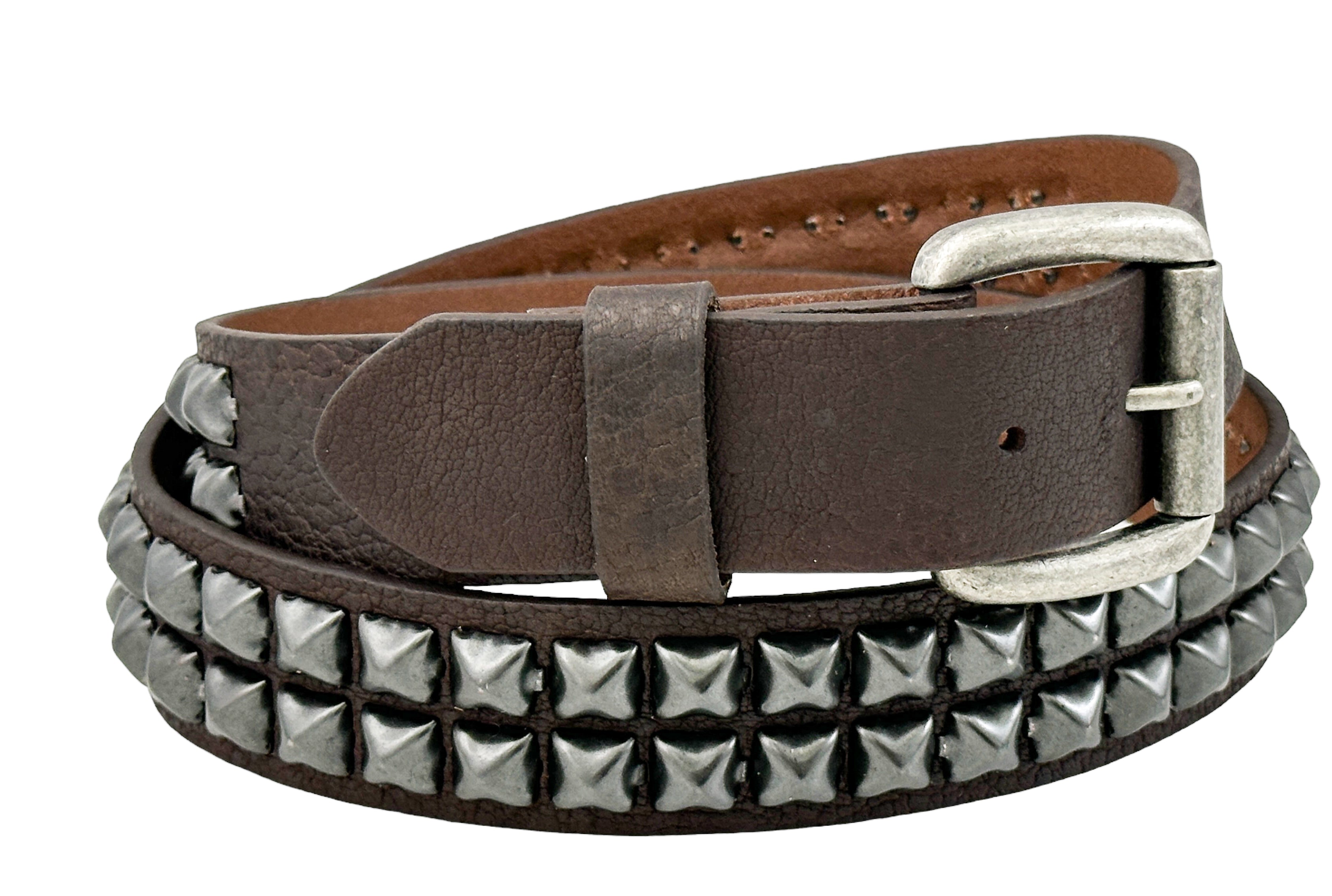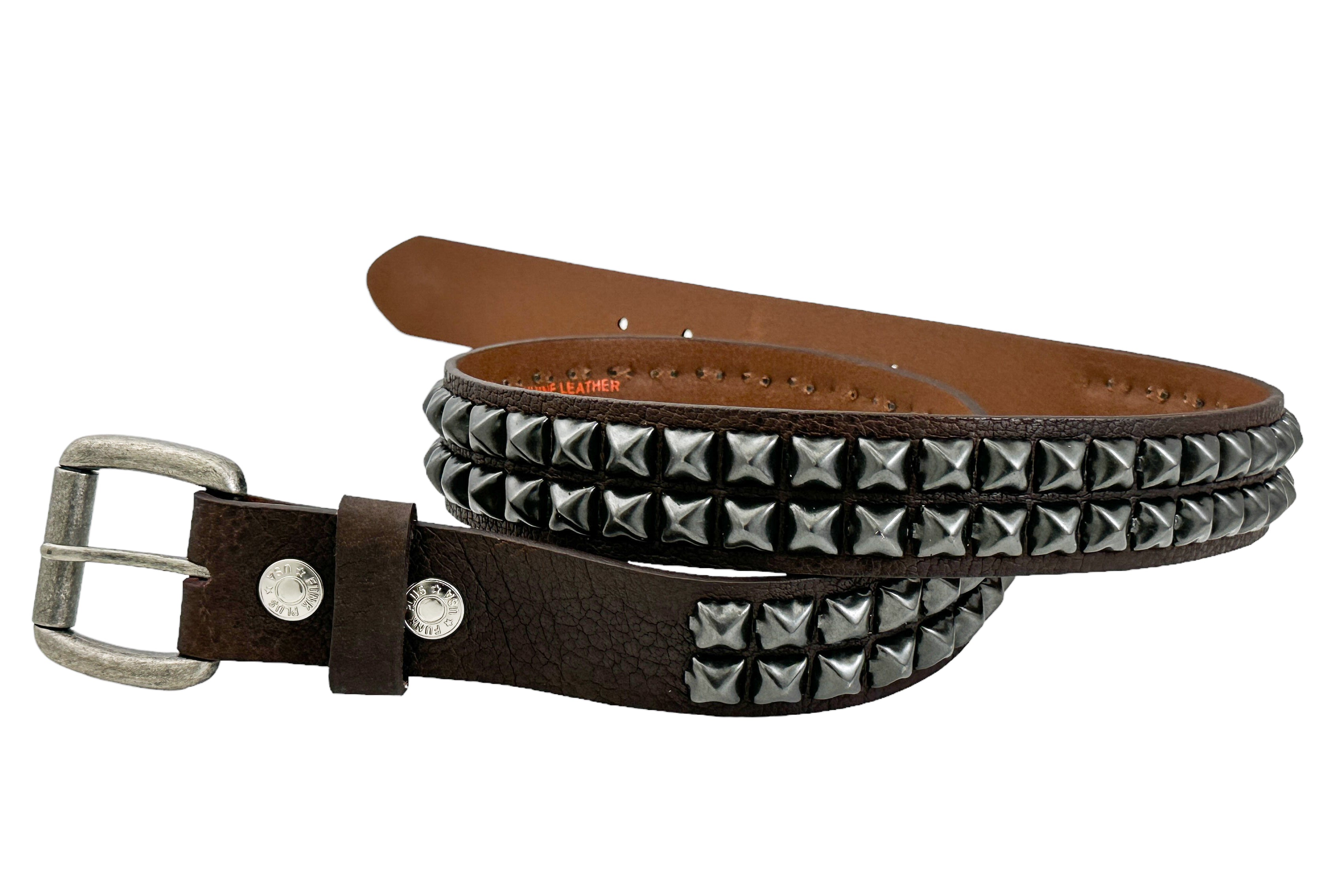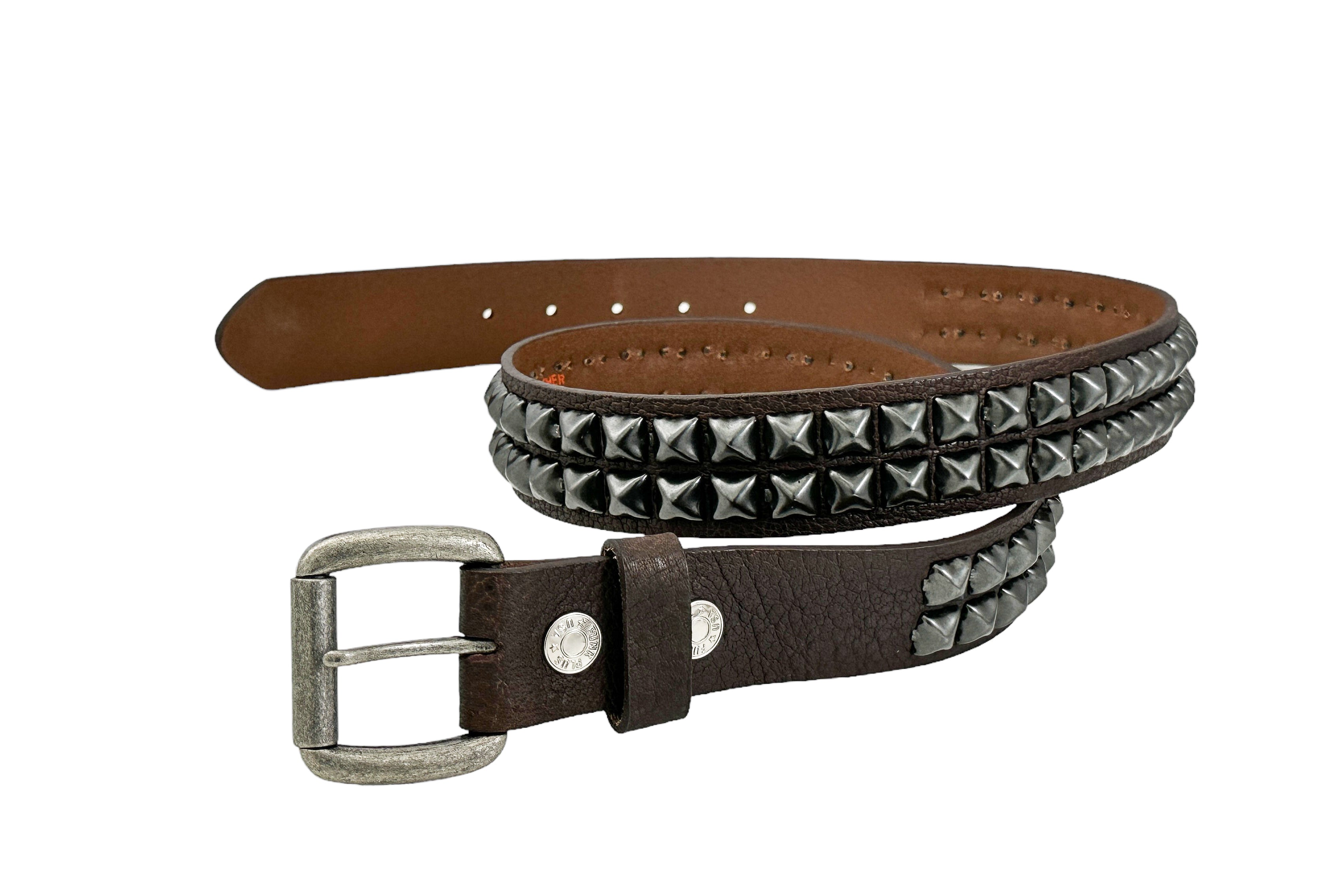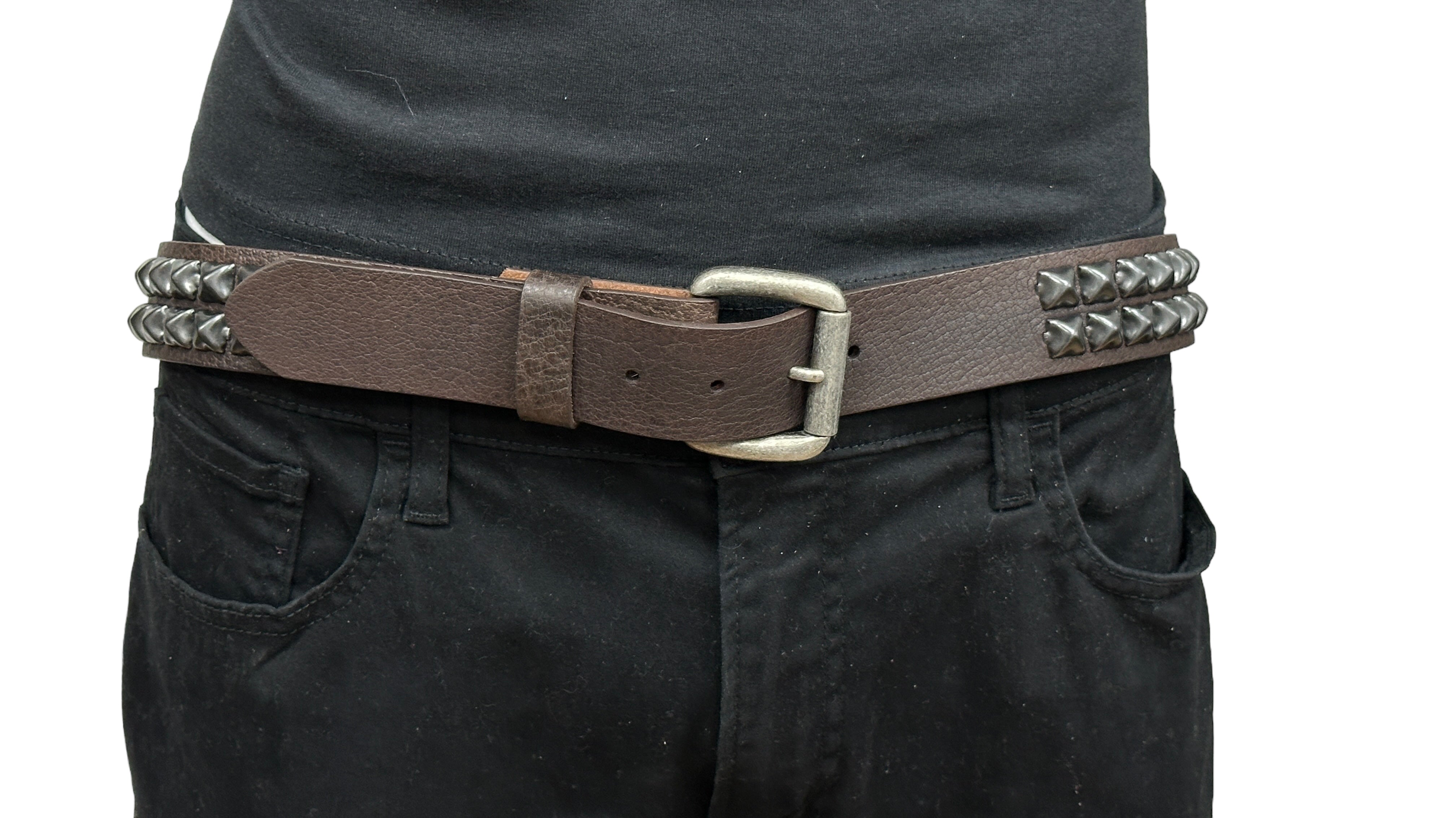 BROWN LEATHER TWO ROW STUDDED GENUINE LEATHER BELT