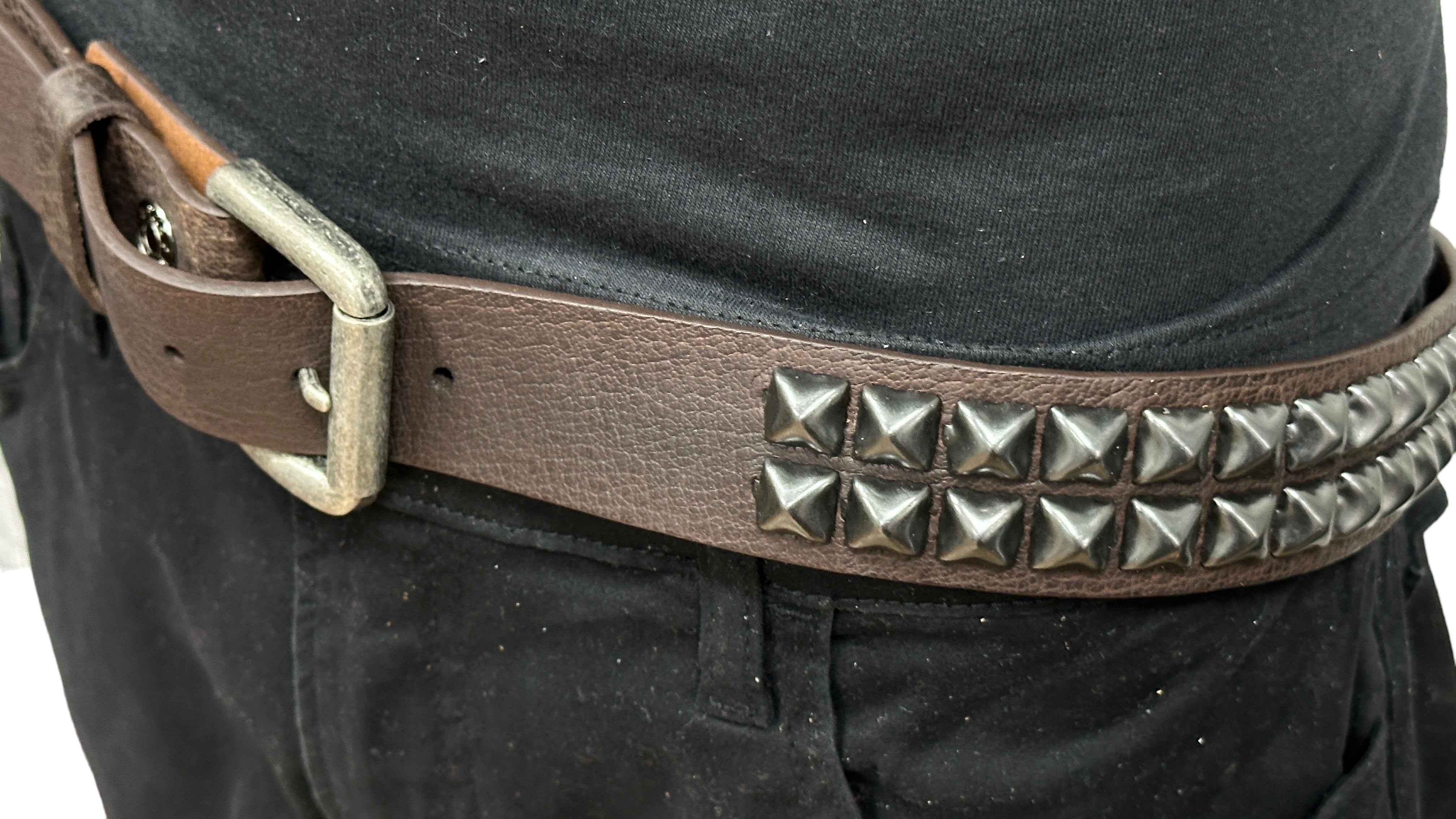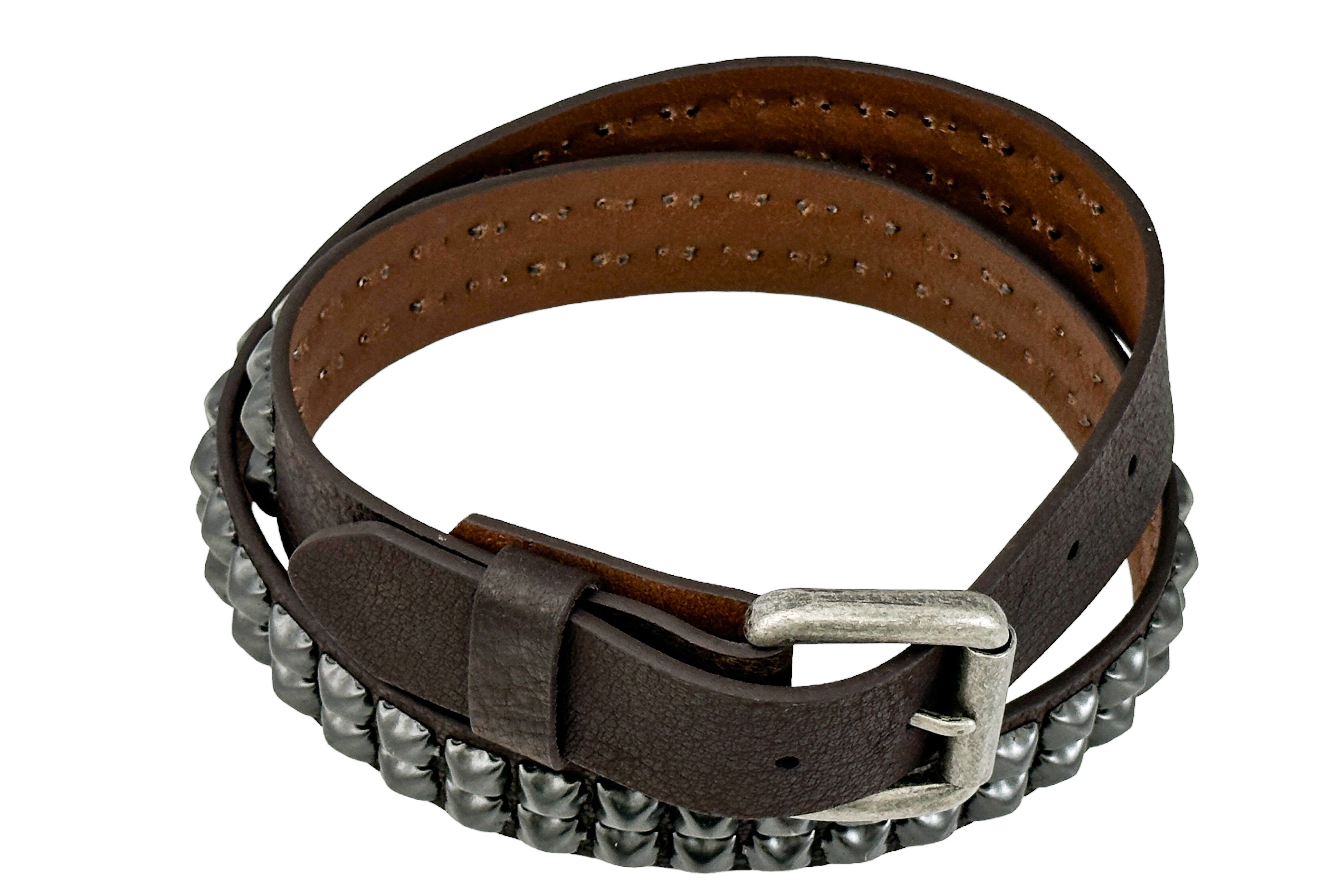 TWO ROW BLACK STUDDED GENUINE LEATHER BROWN BELT