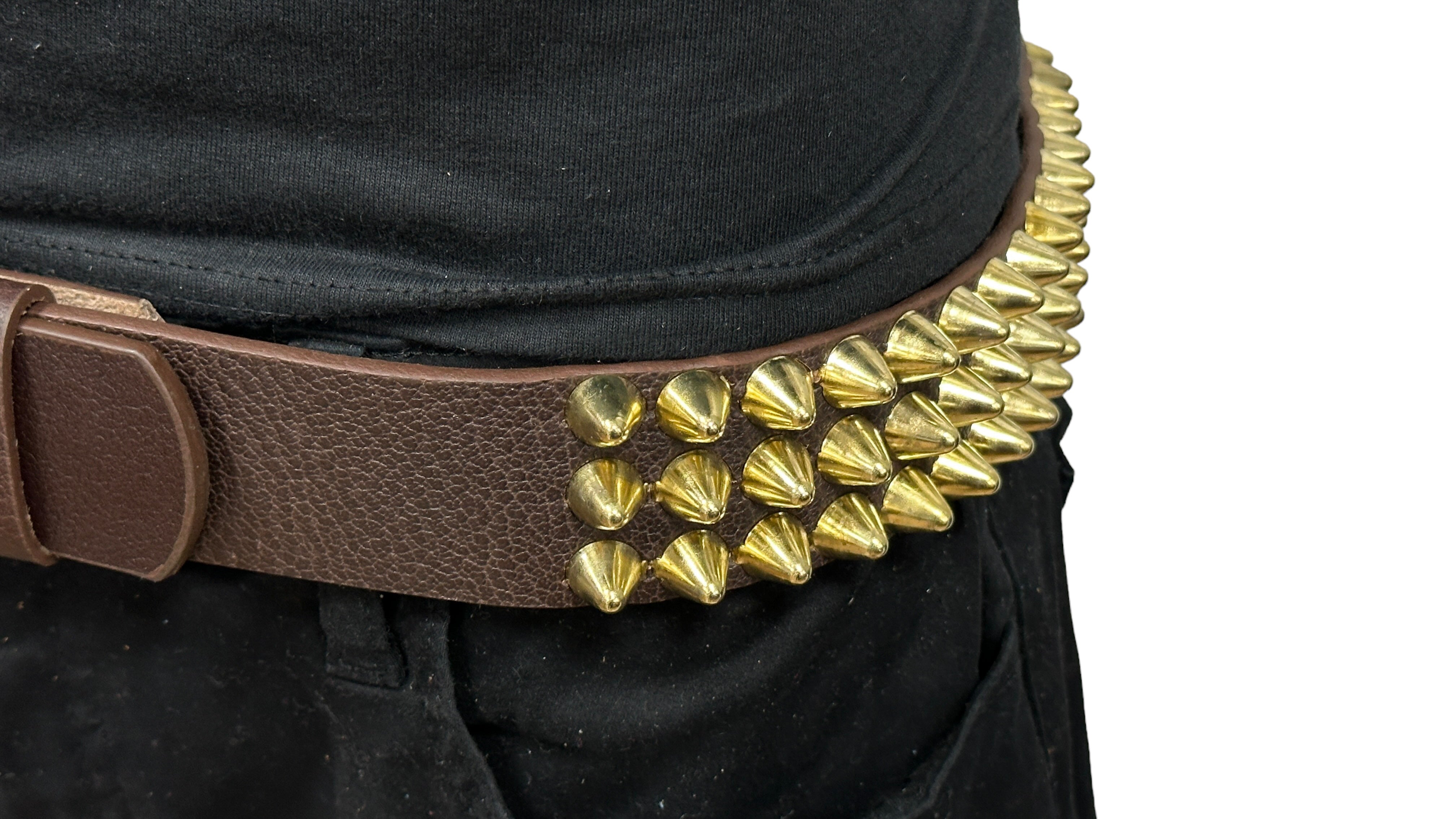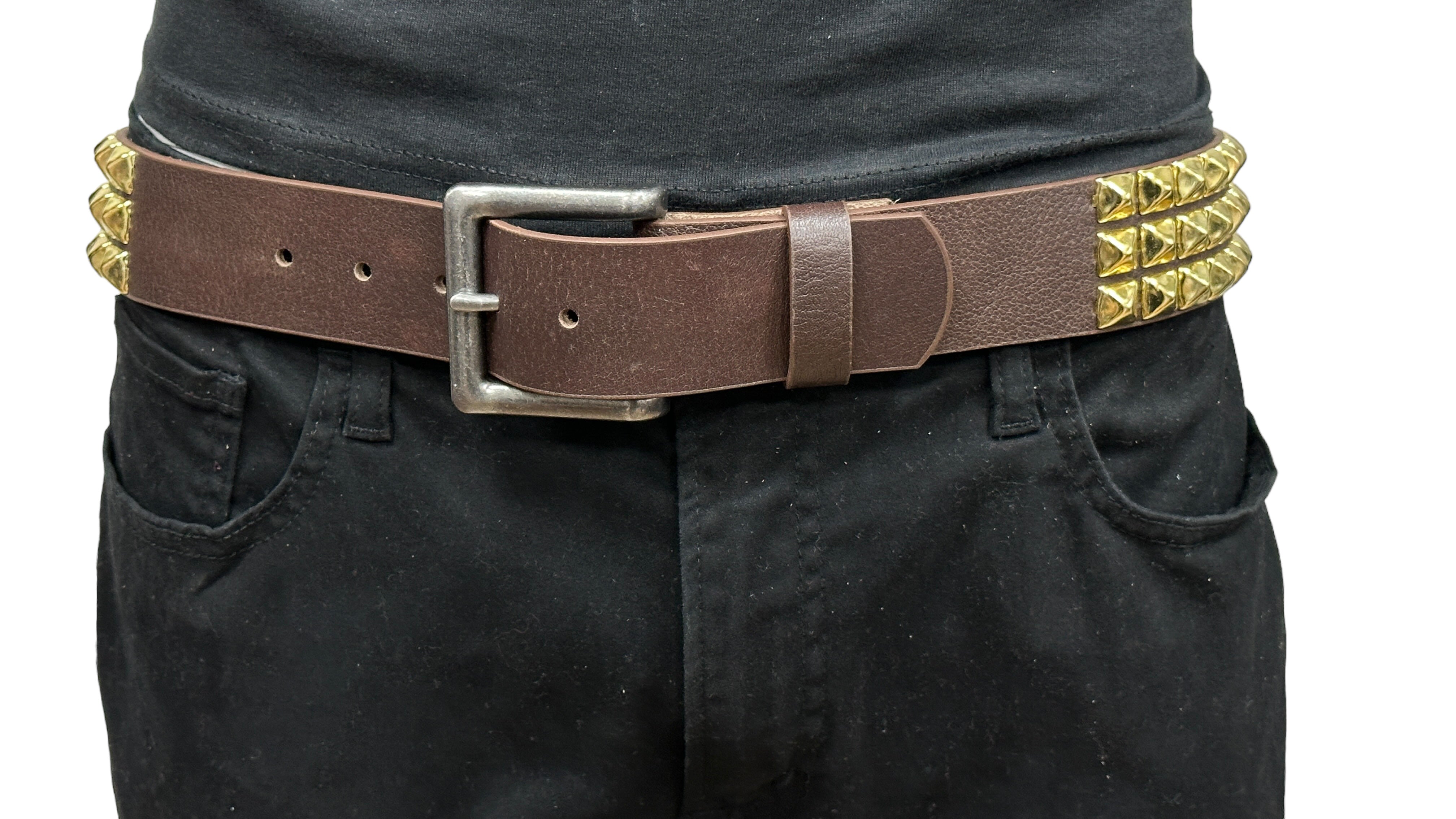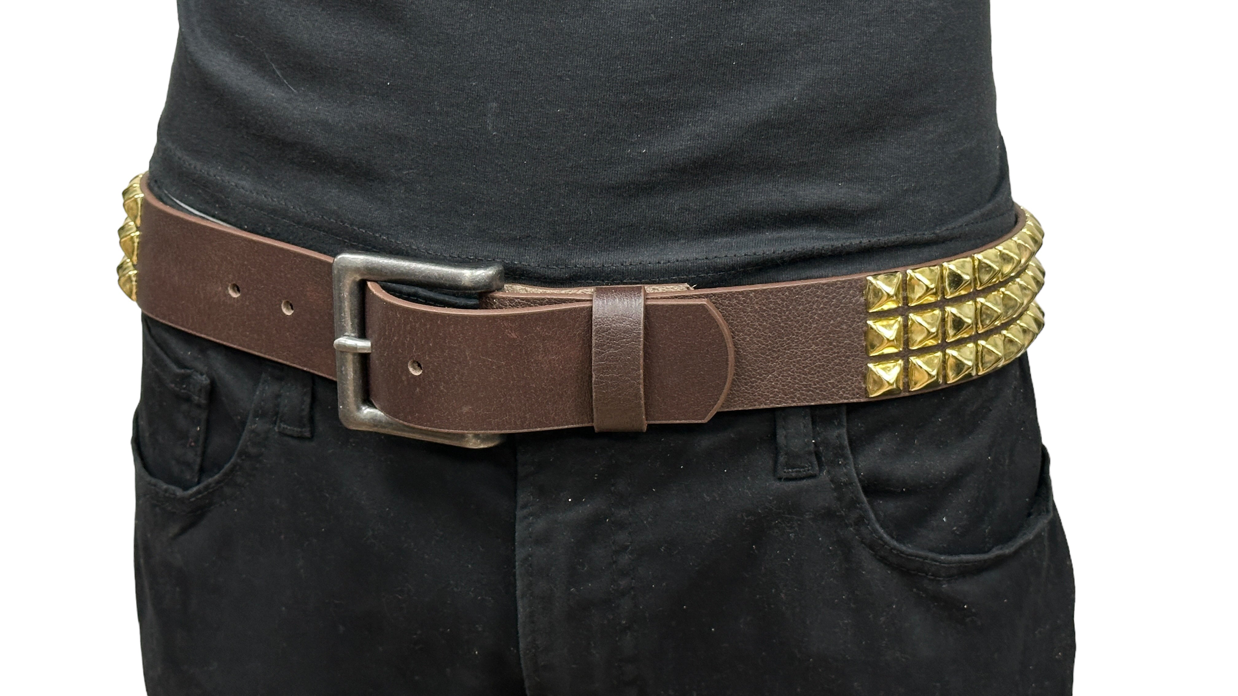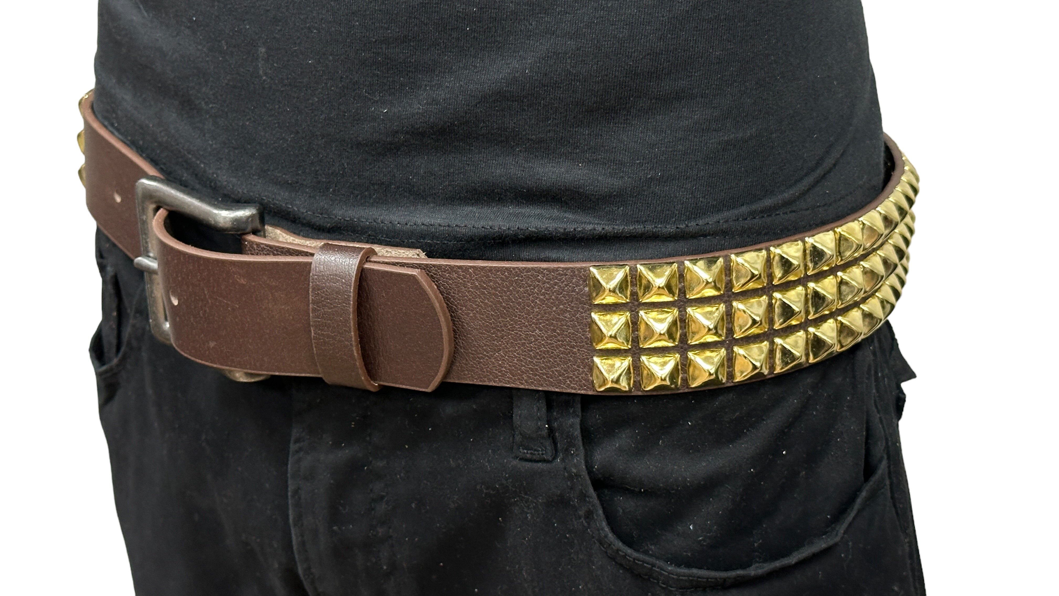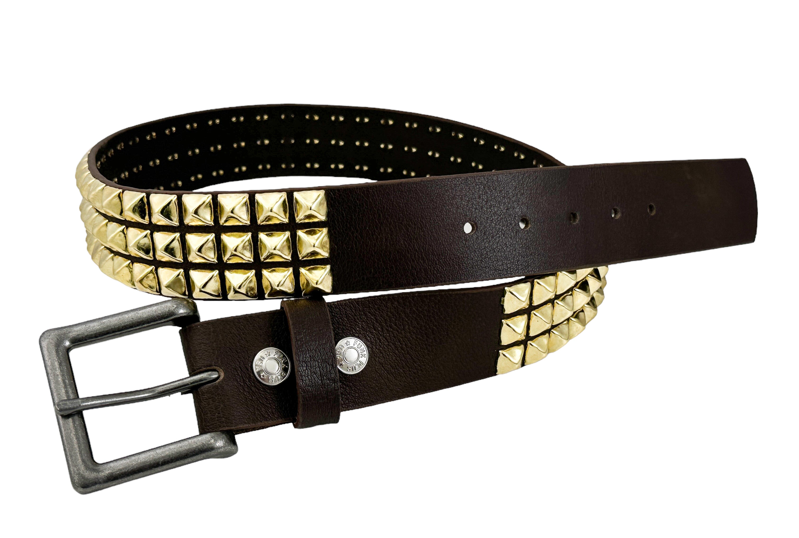 BROWN LEATHER THREE ROW STUDDED GENUINE LEATHER BELT