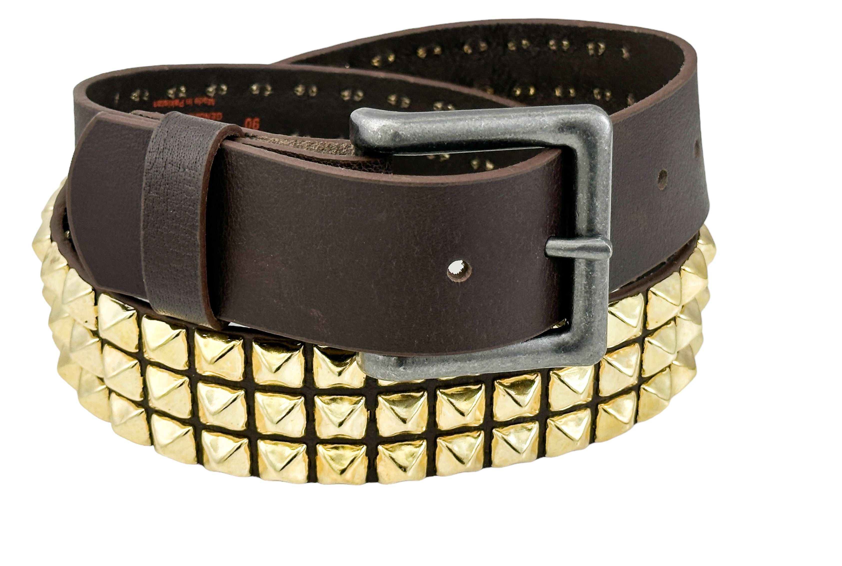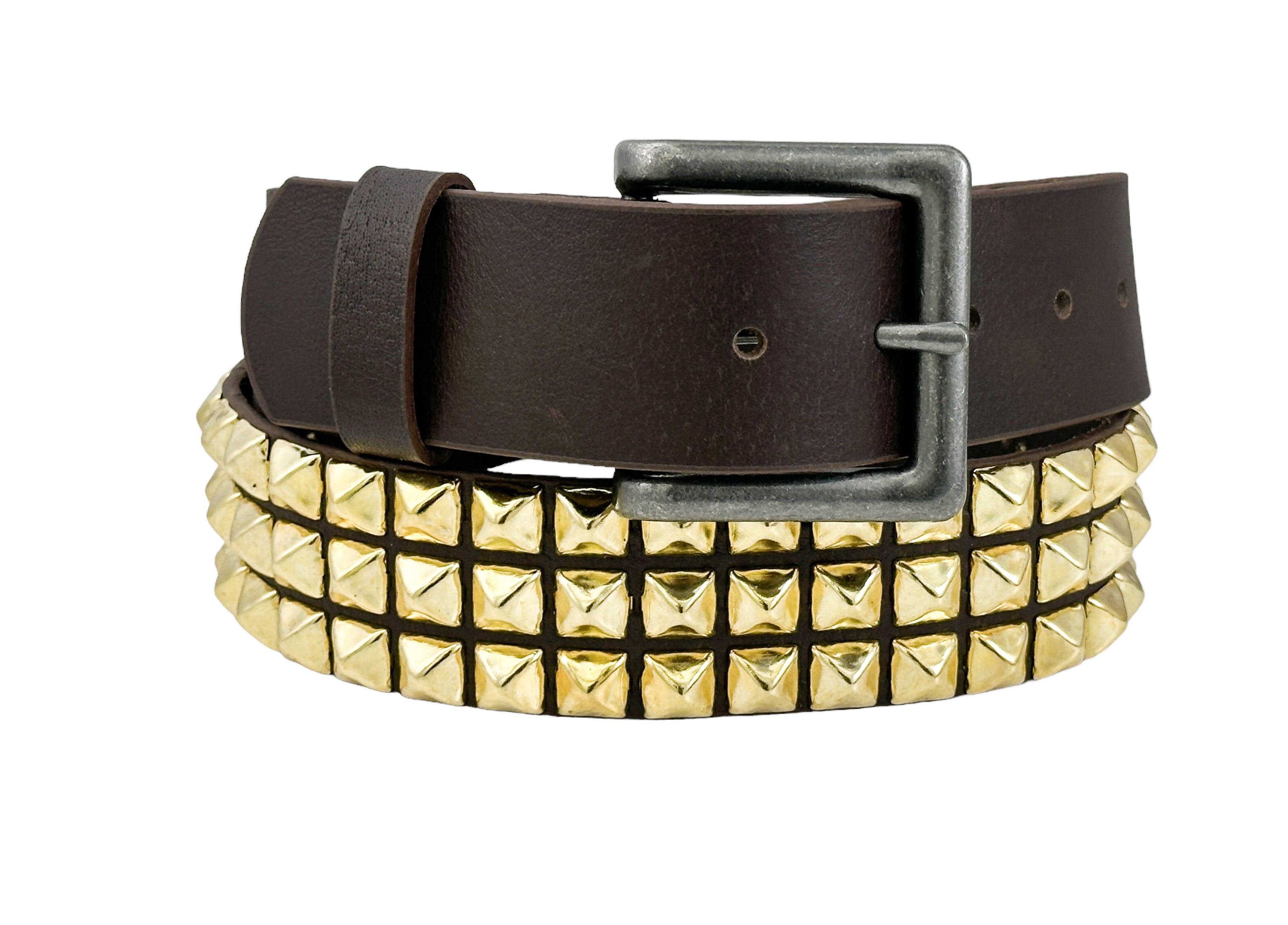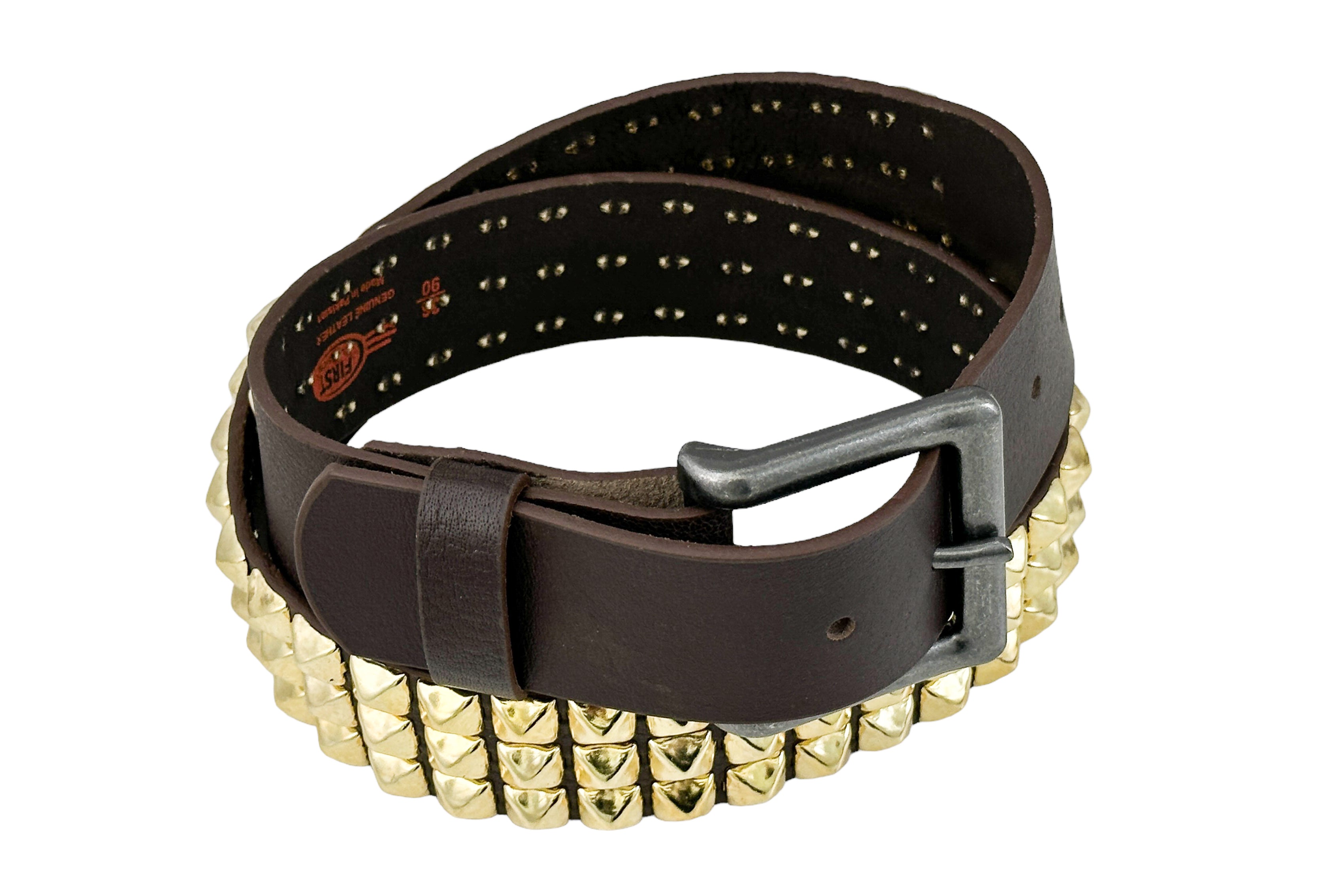 THREE ROW GOLD STUDDED GENUINE LEATHER BROWN BELT