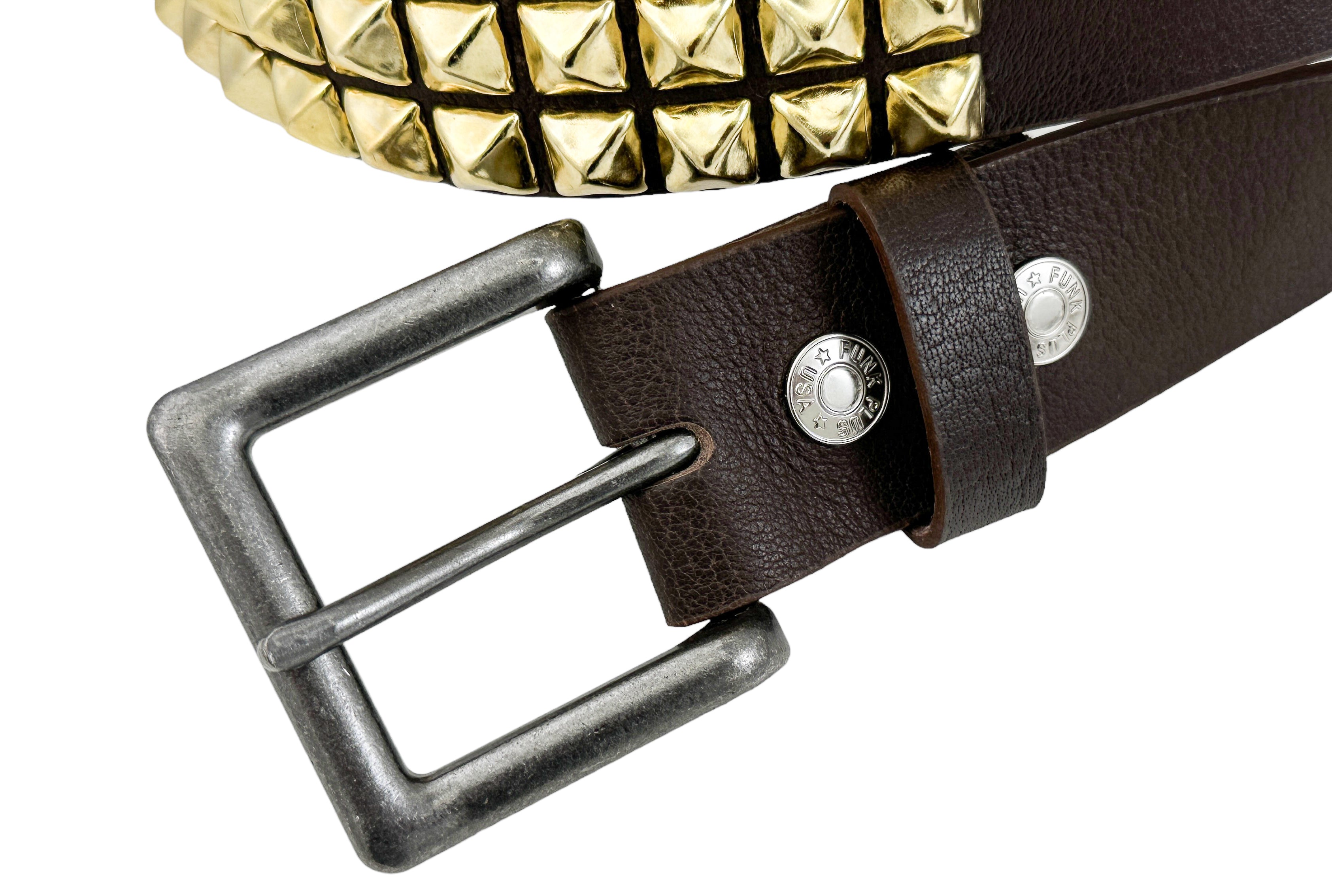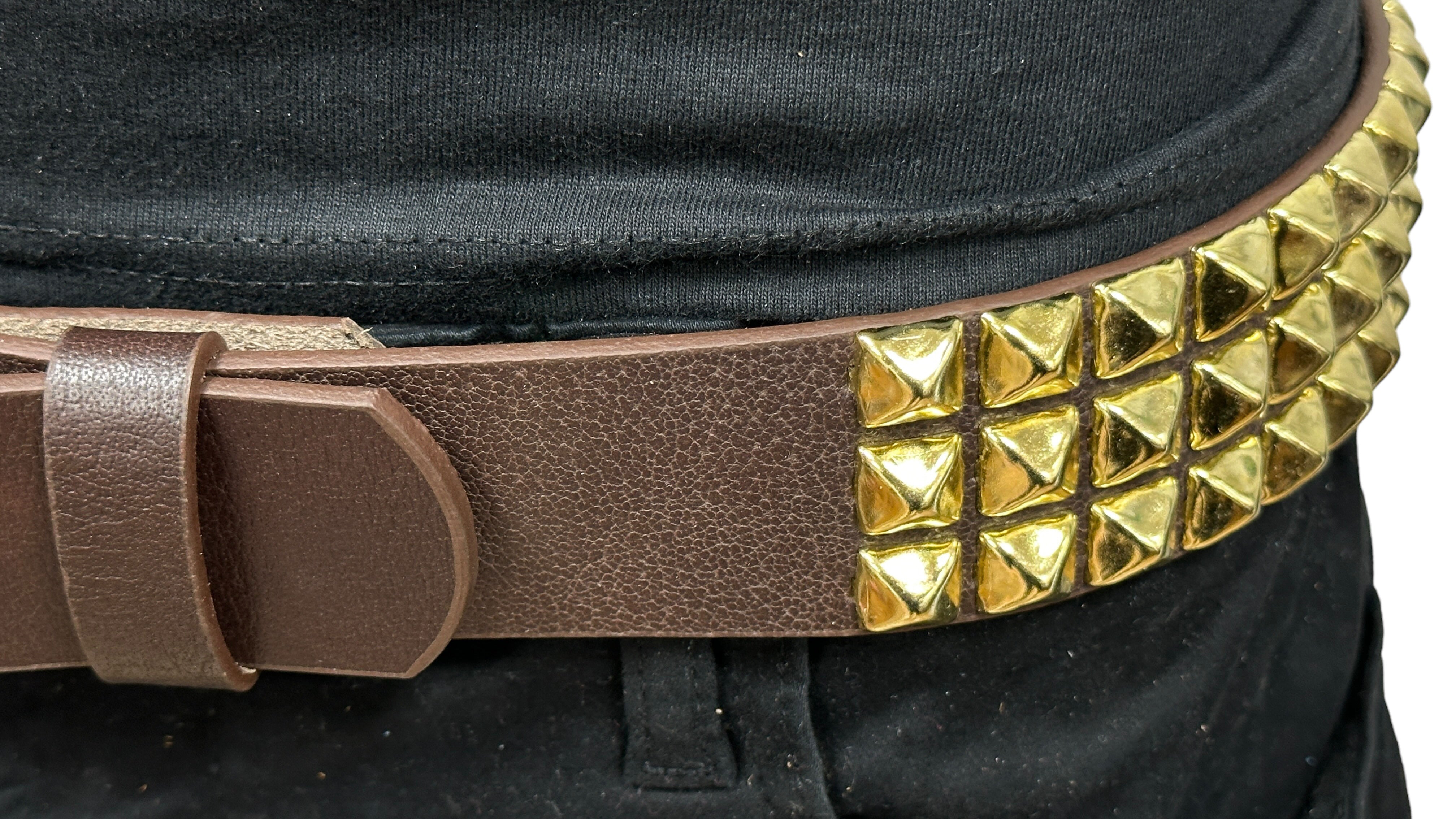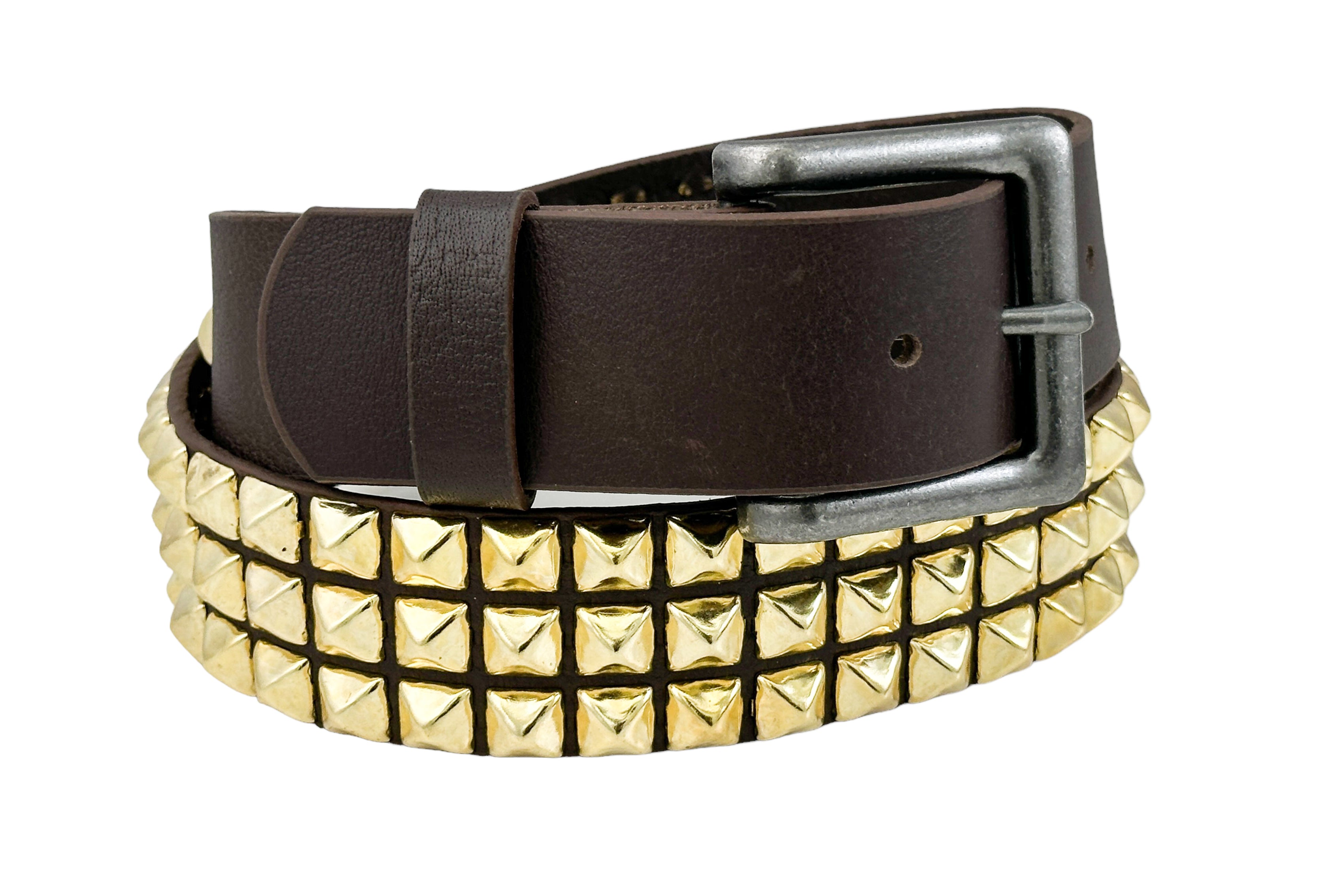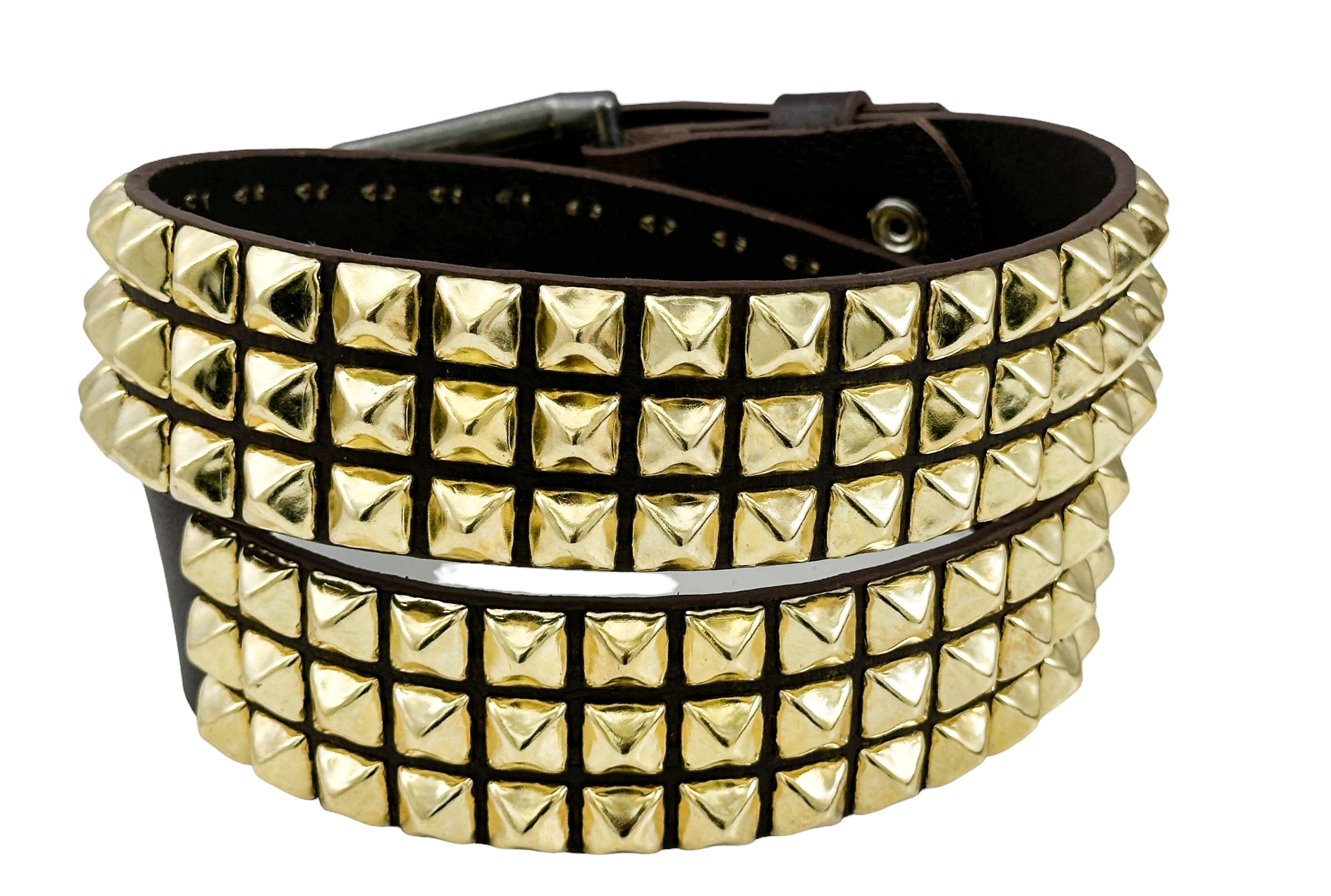 THREE ROW GOLD STUDDED GENUINE LEATHER BROWN BELT