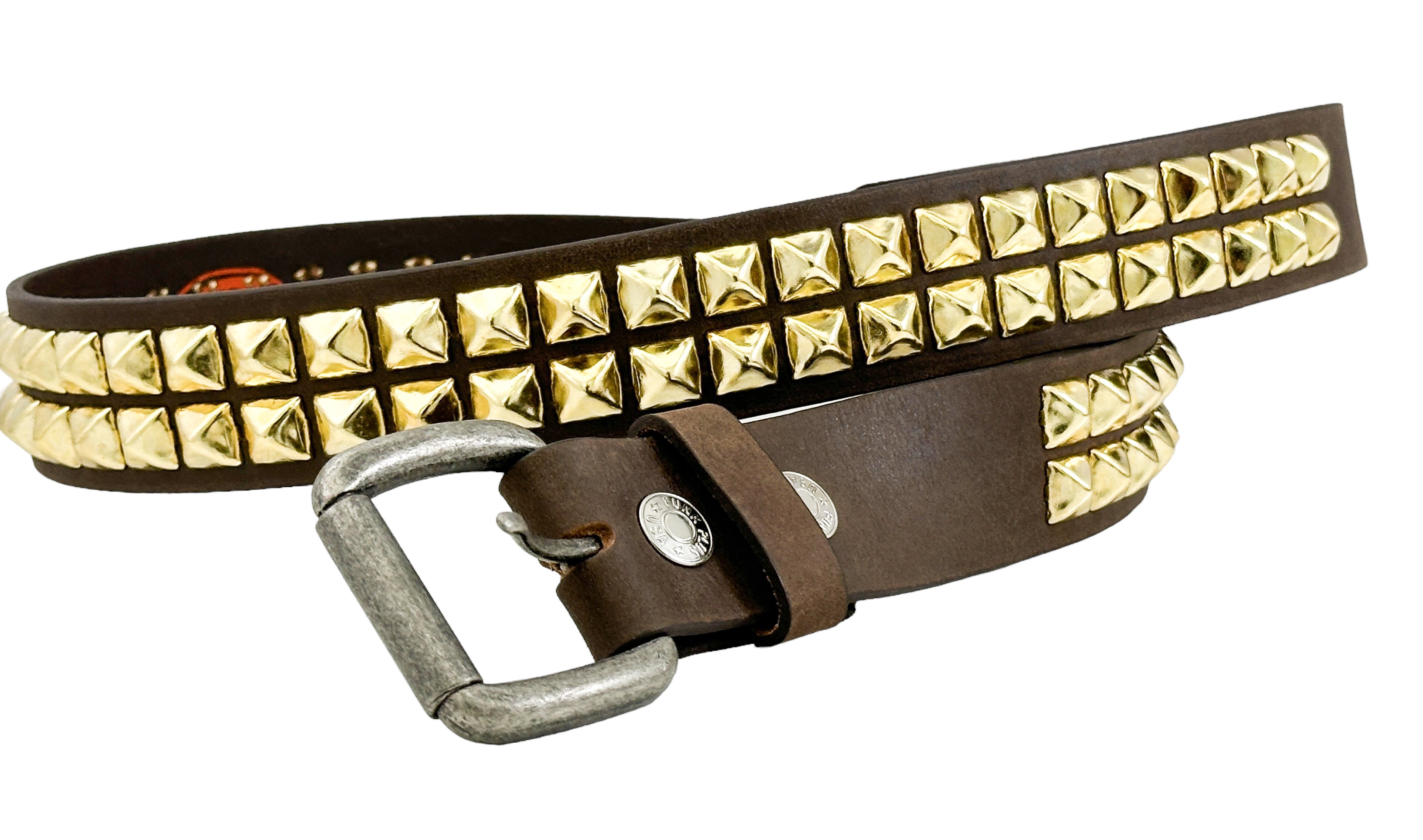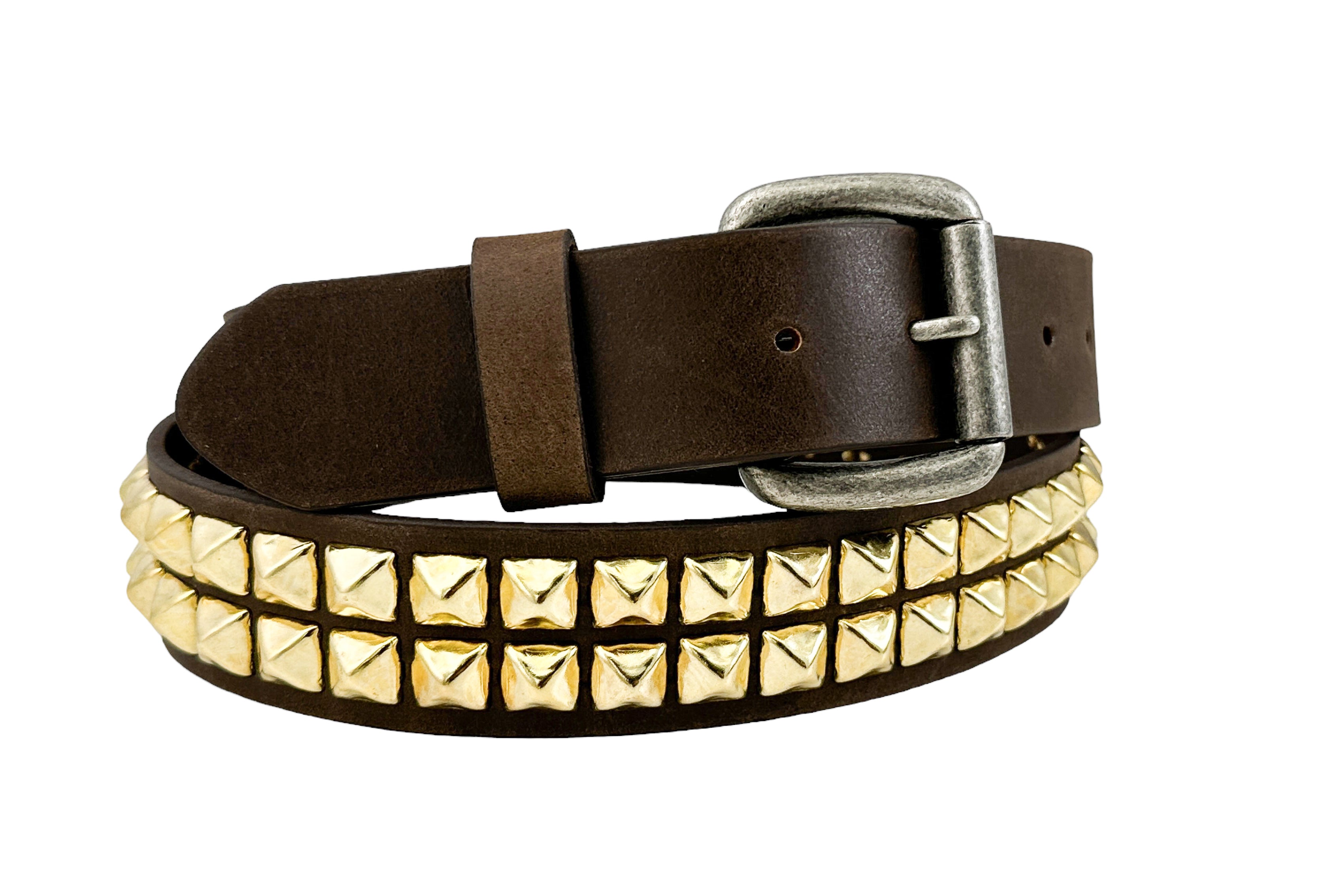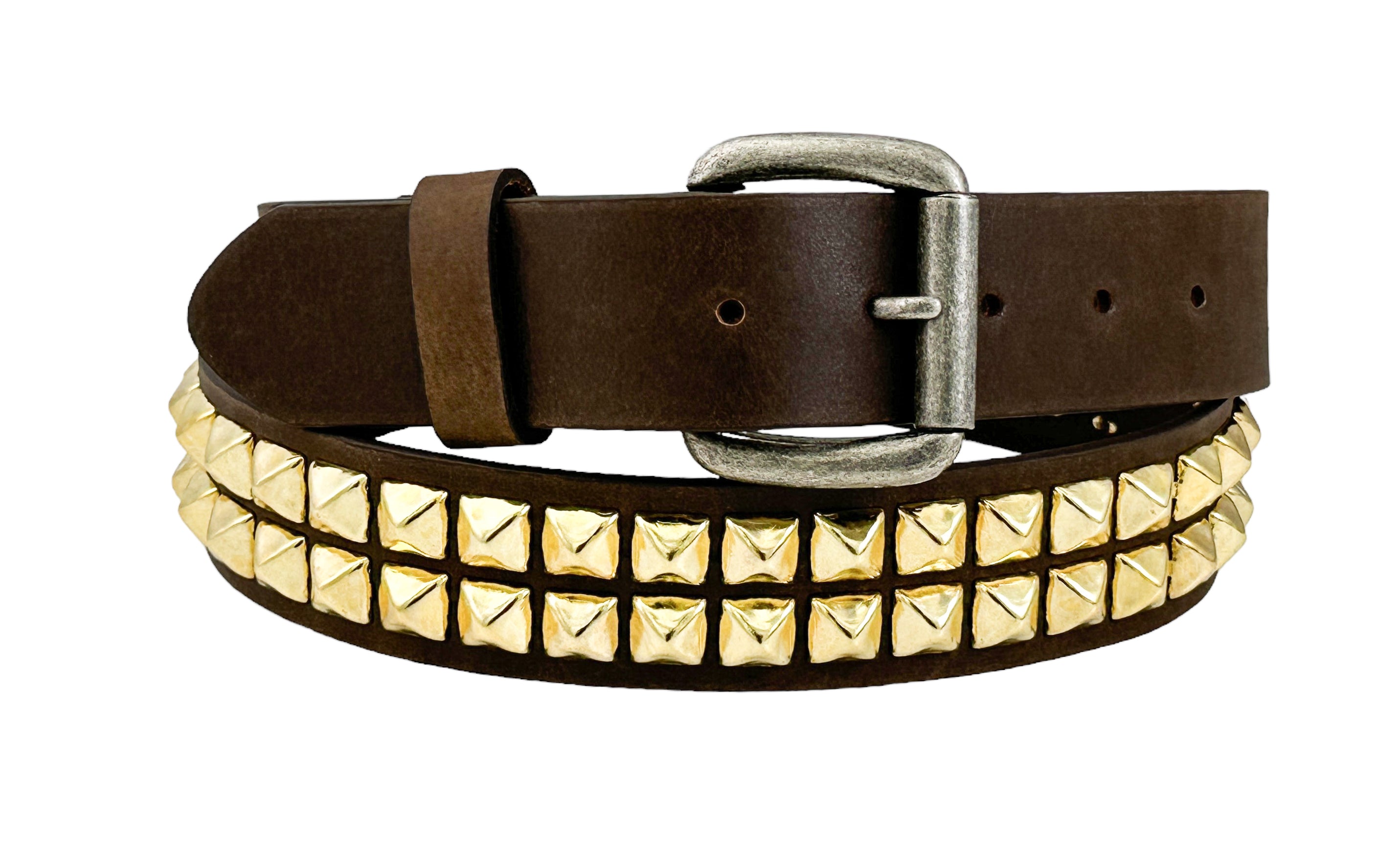 BROWN LEATHER TWO ROW STUDDED GENUINE LEATHER BELT
