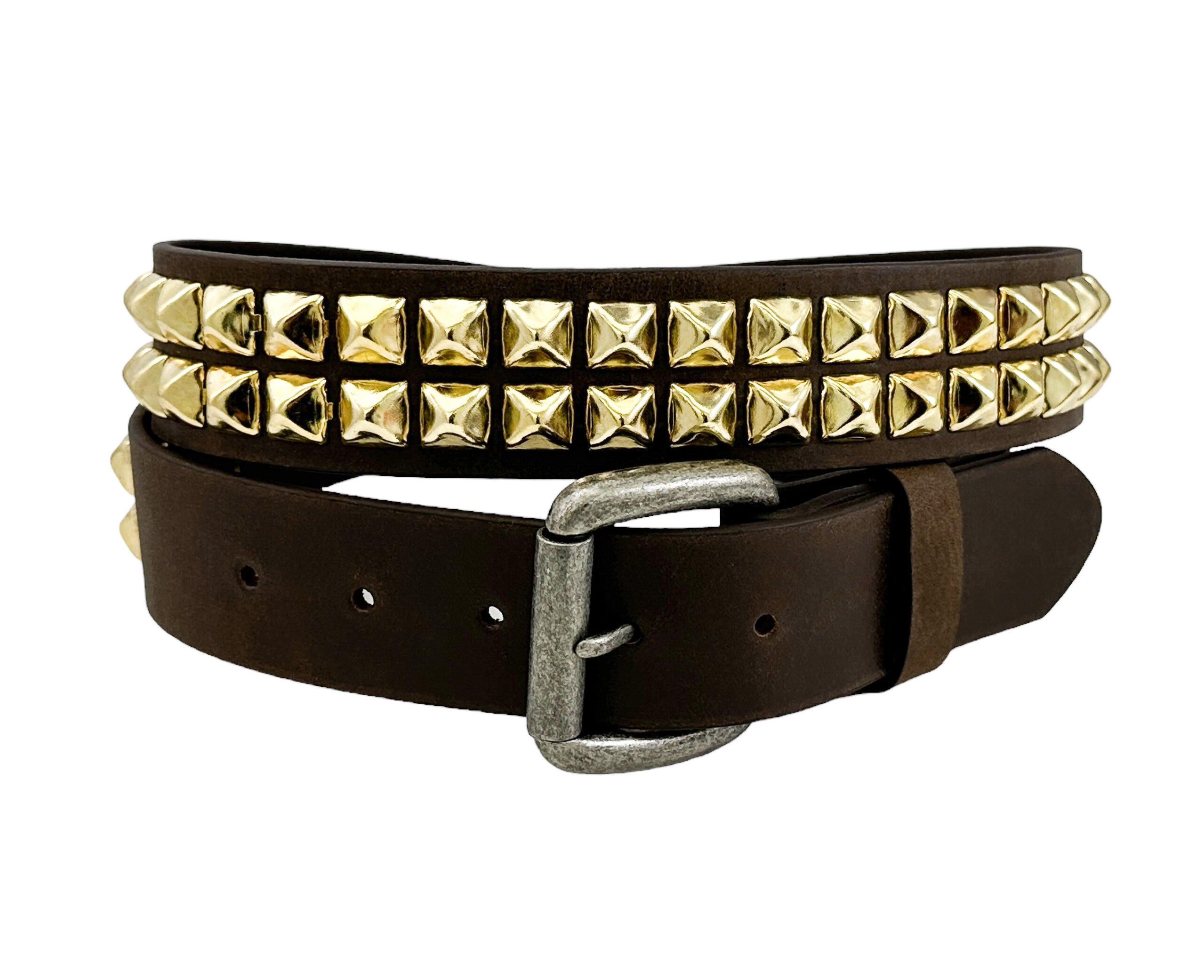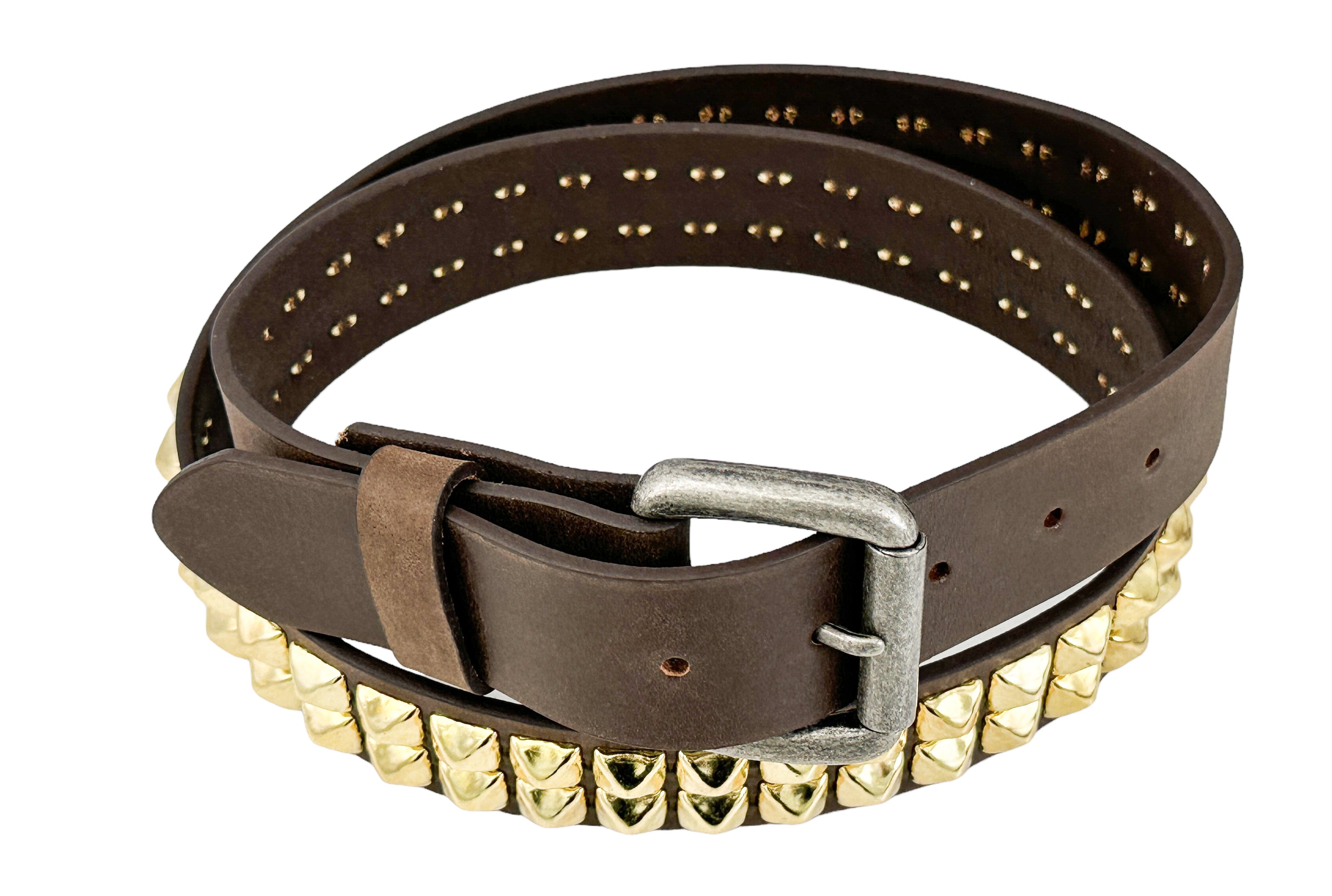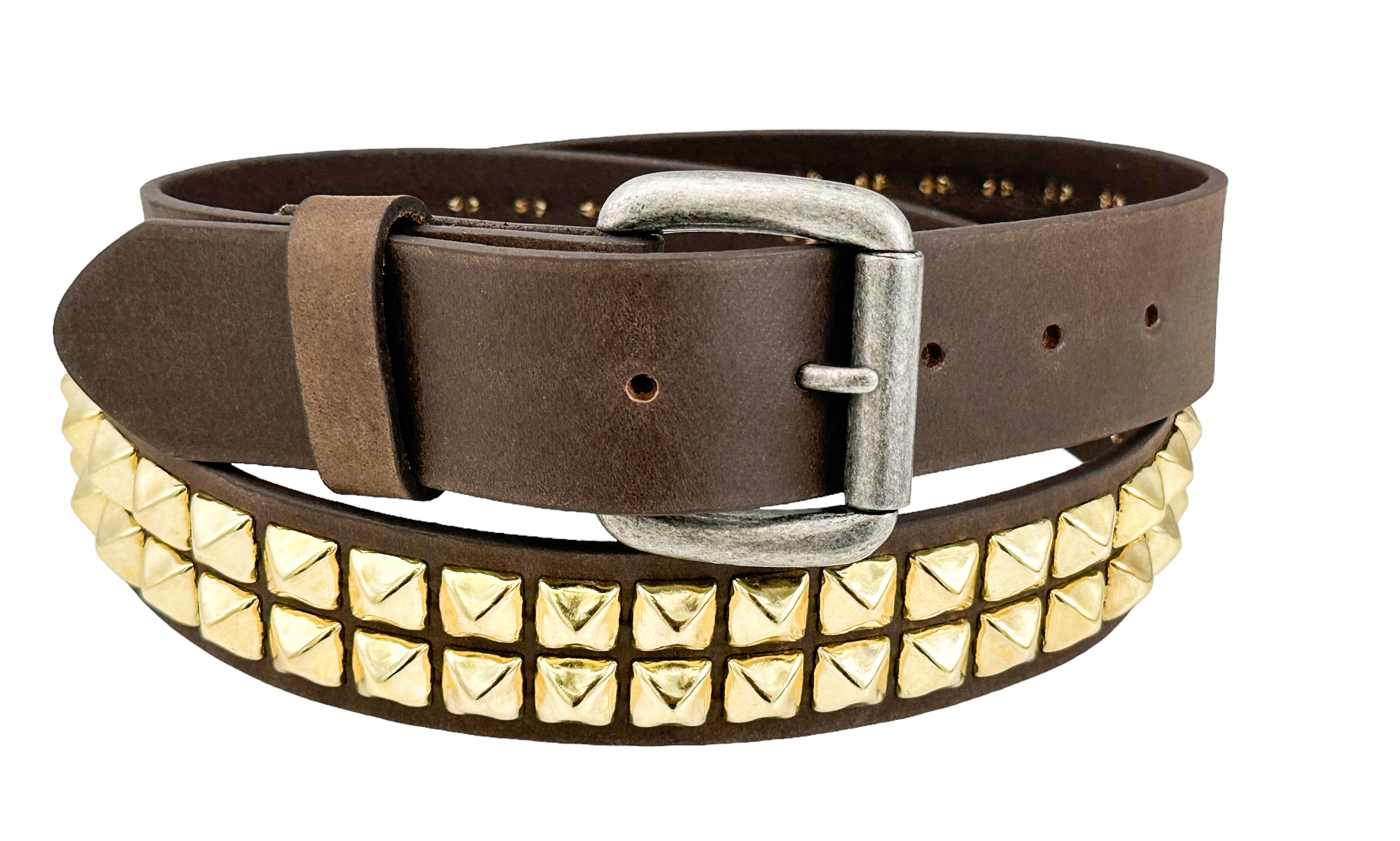 BROWN LEATHER TWO ROW STUDDED GENUINE LEATHER BELT