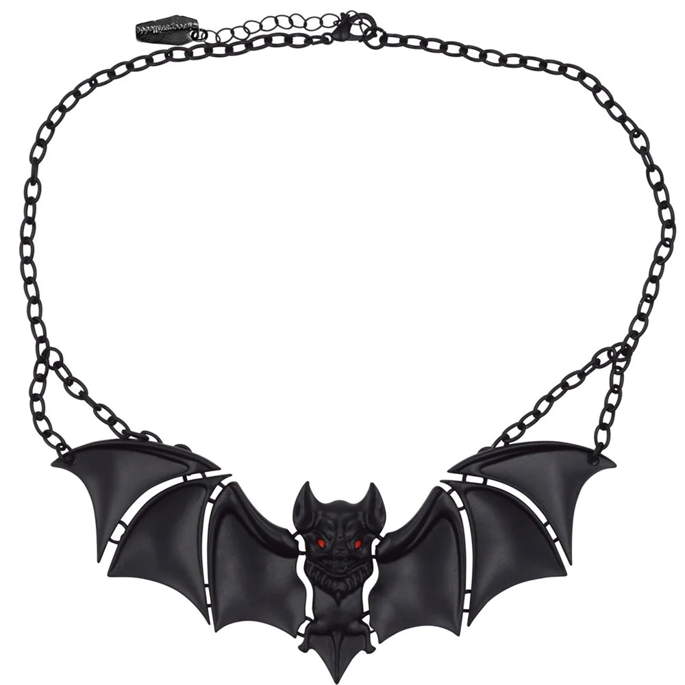 A bat shaped necklace with moon phase cut out and inlaid mirror center piece.