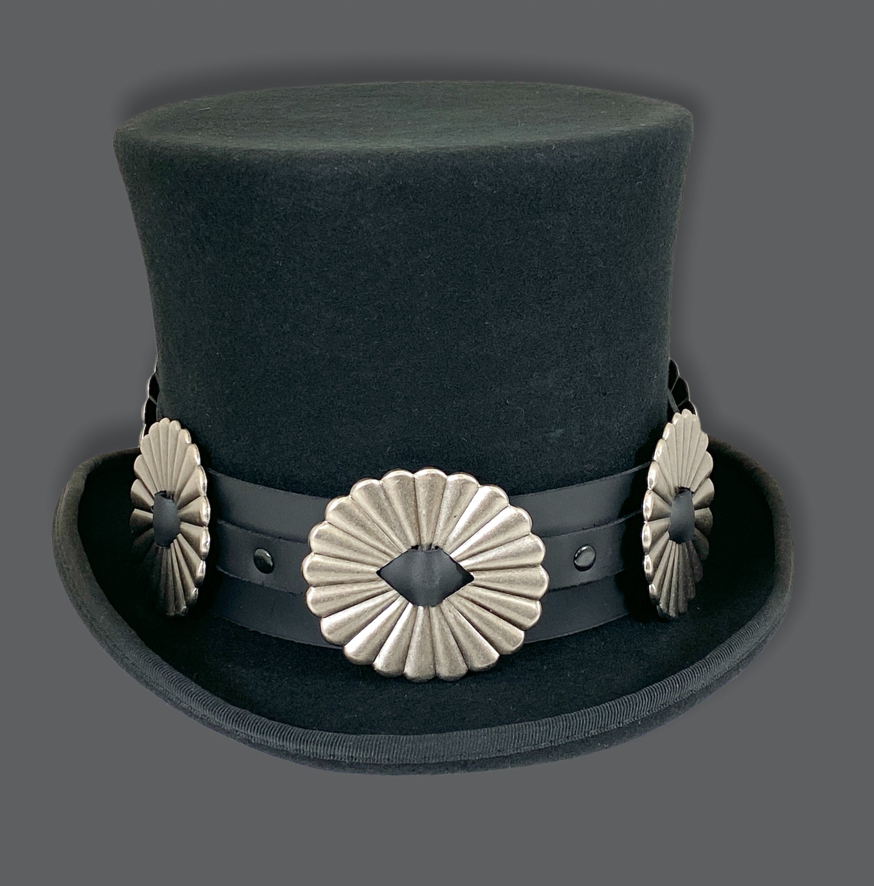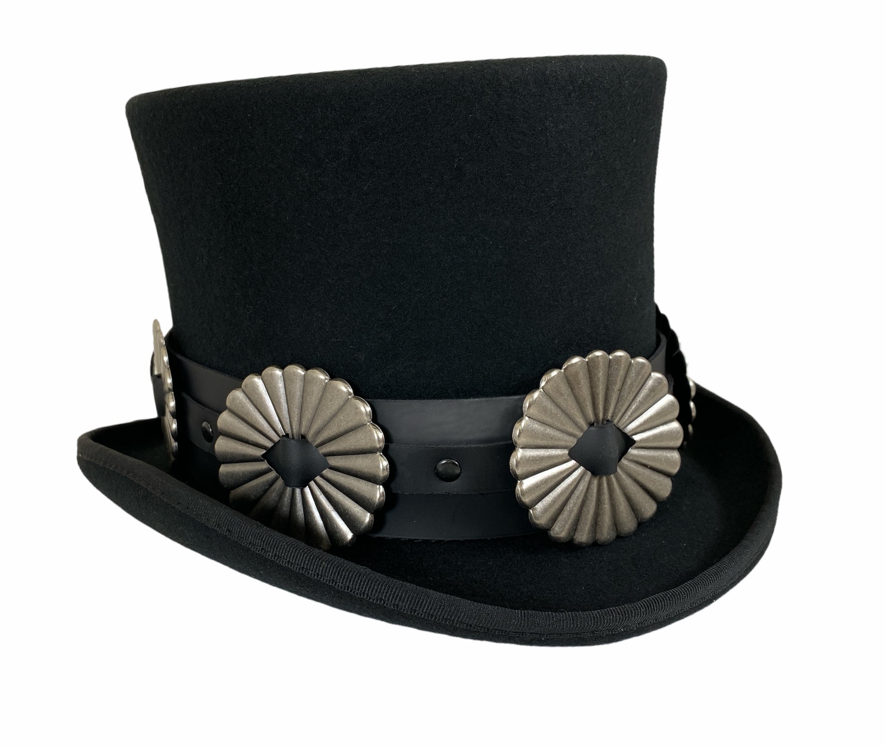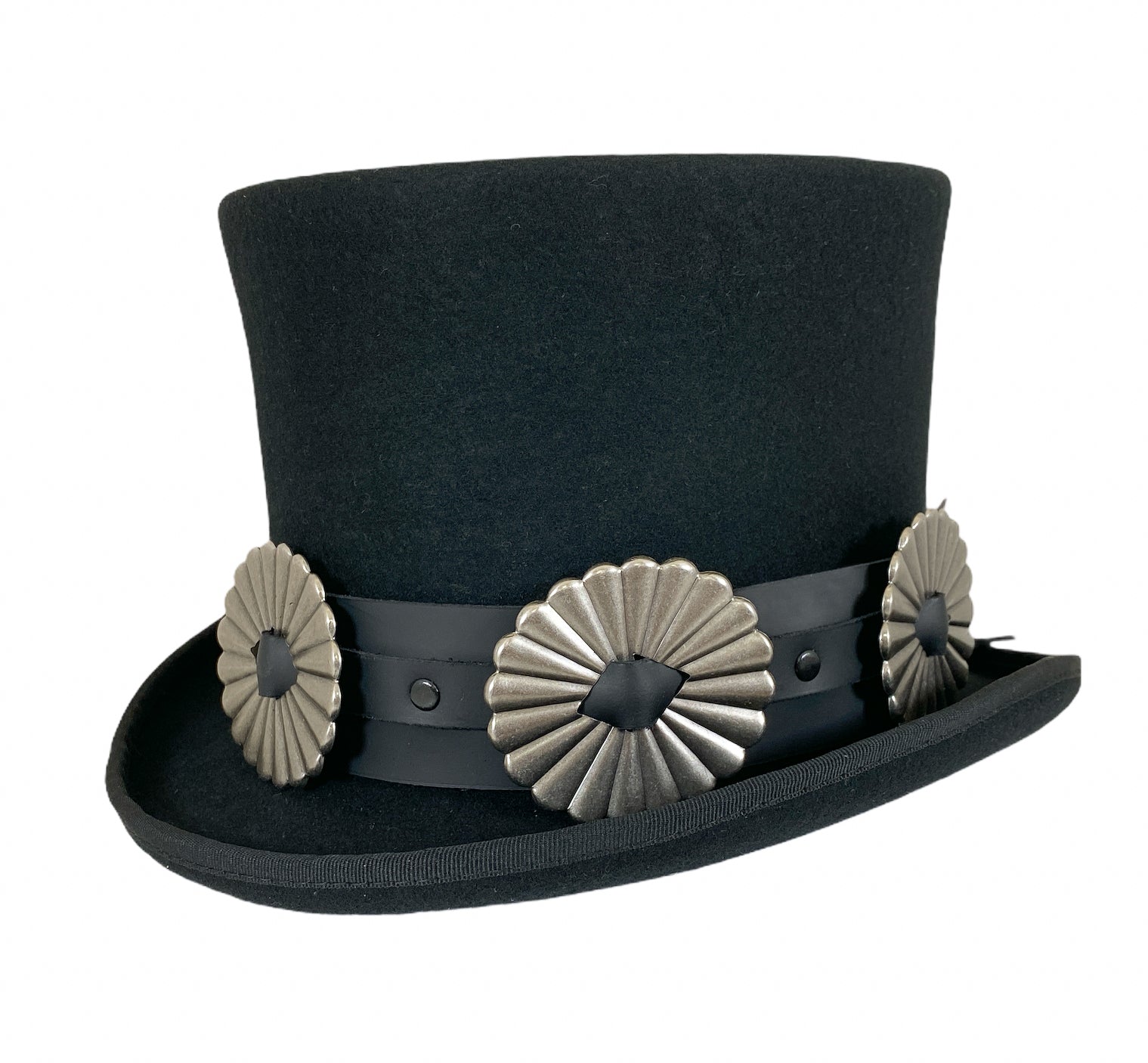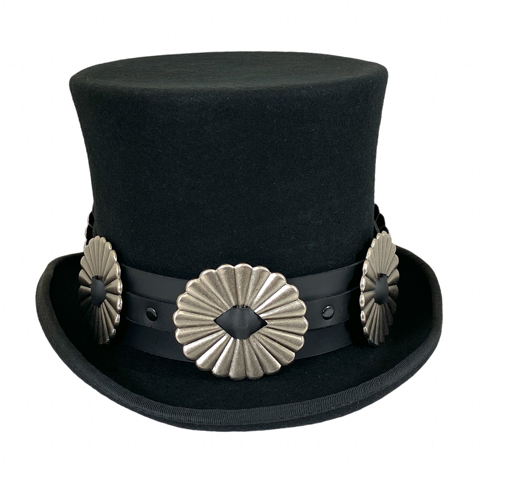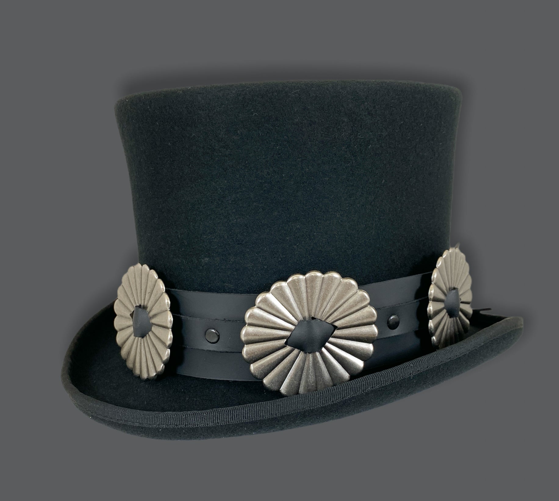 • Premium 100% Wool Felt Top Hat With Leather Hat Band With Steel Concho
