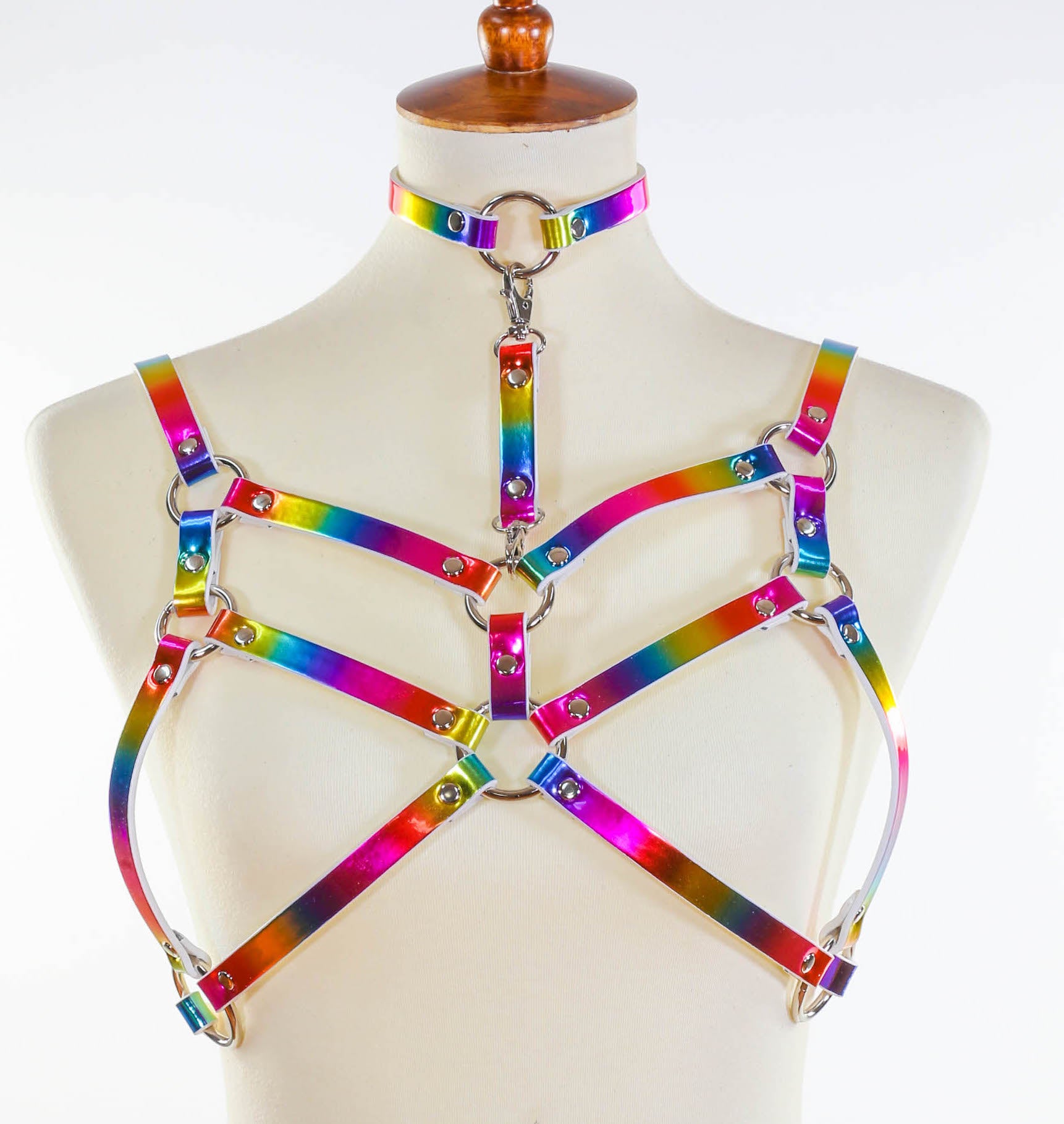 Multi Rainbow Bra Straps Style Vegan Leather Harness