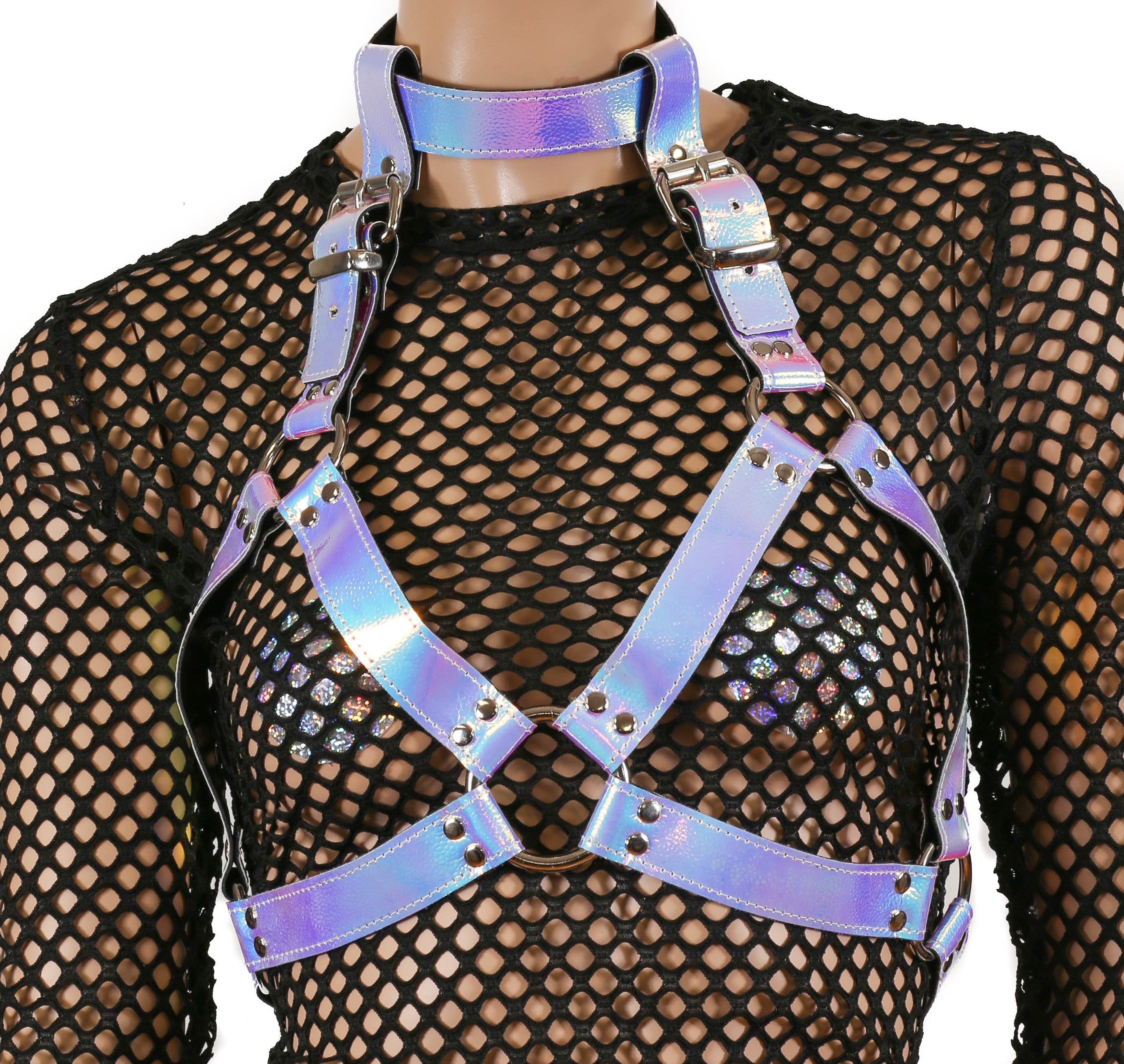 Silver Rainbow Leather Wide Bra Style Vegan Leather Harness