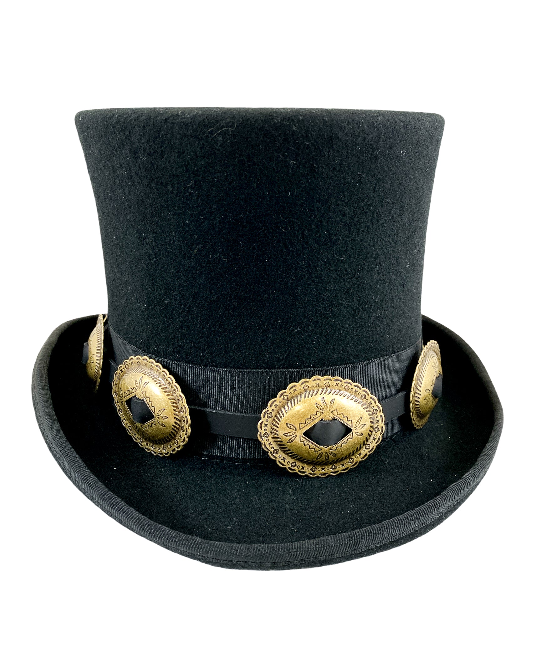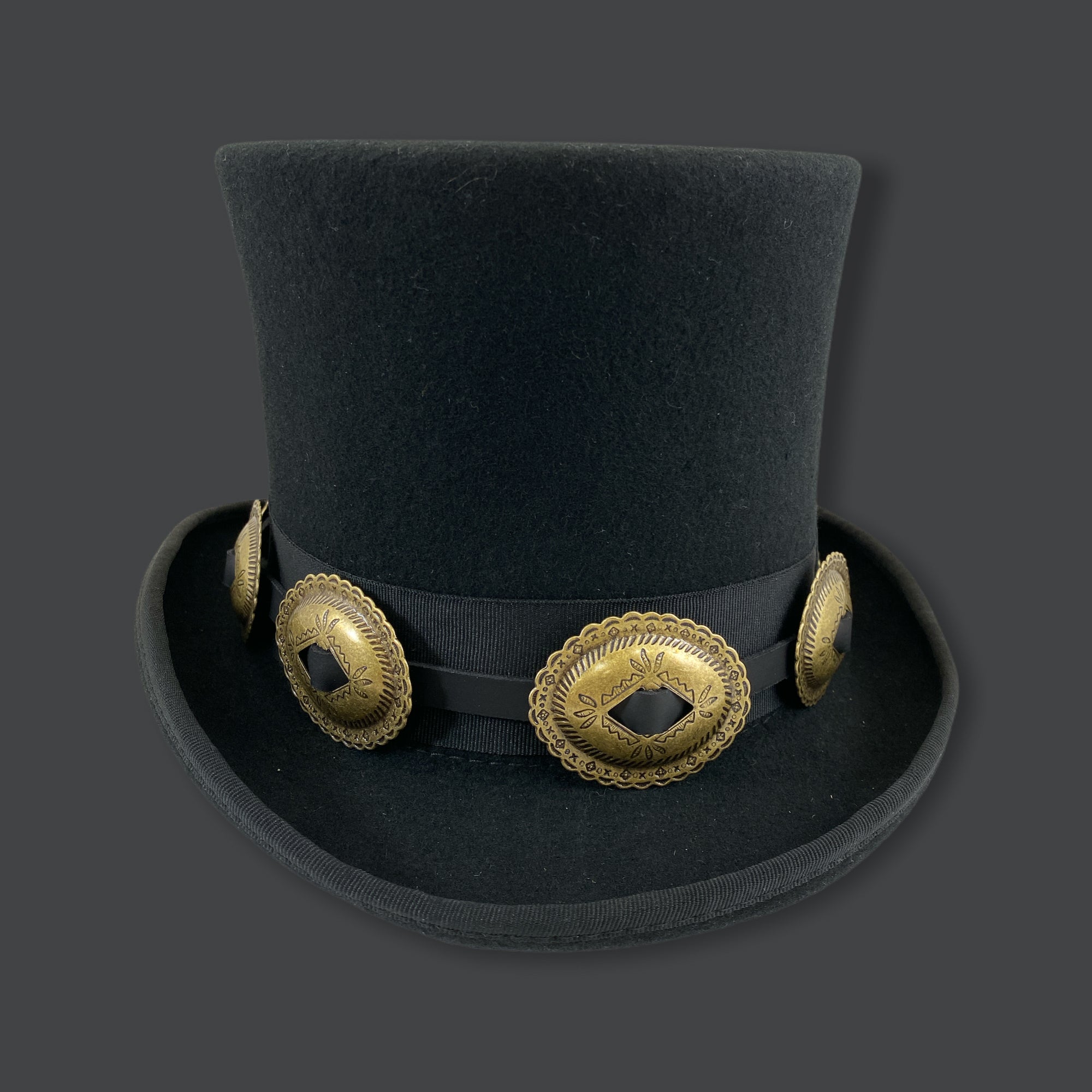 • Premium 100% Wool Felt Top Hat With Leather Hat Band With Steel Concho