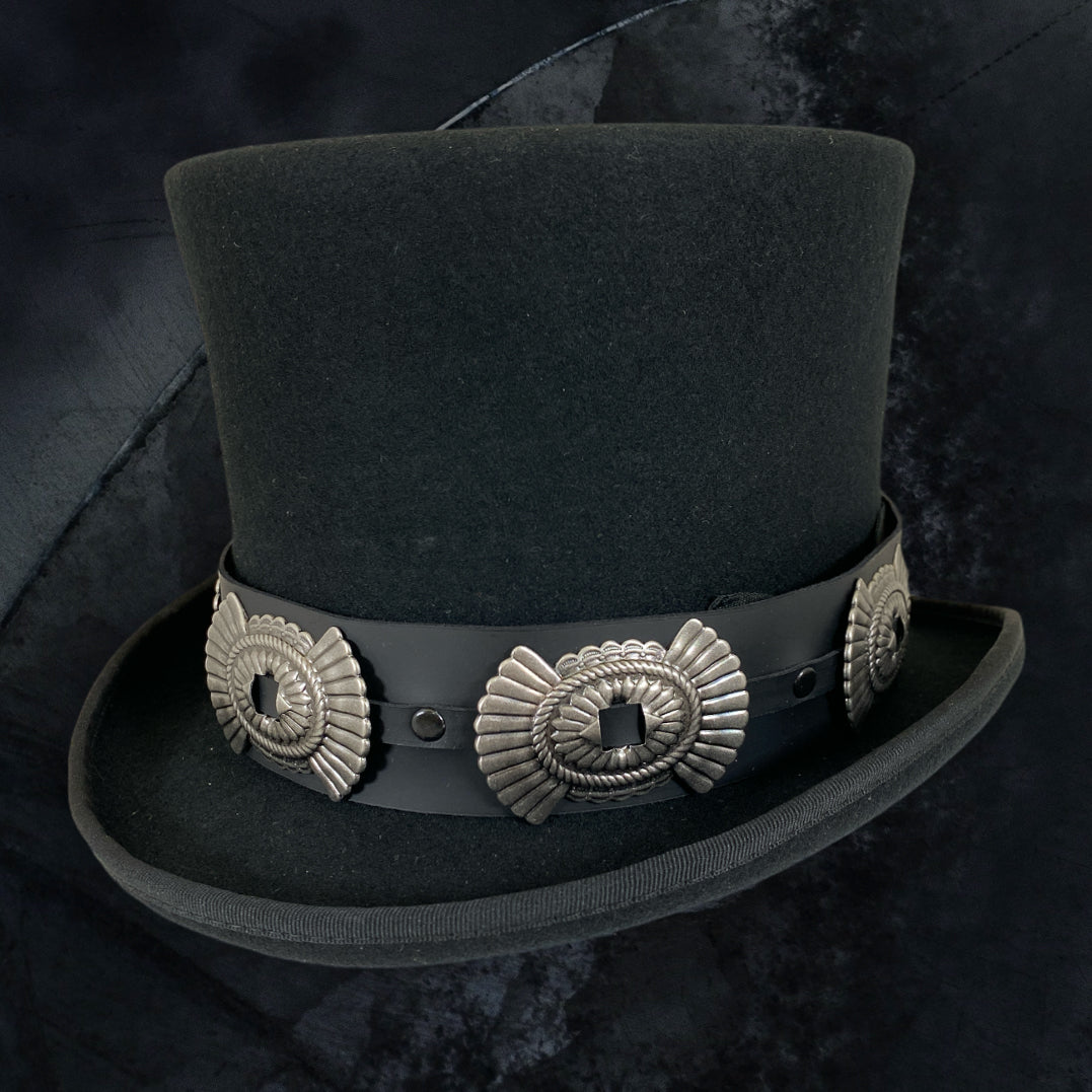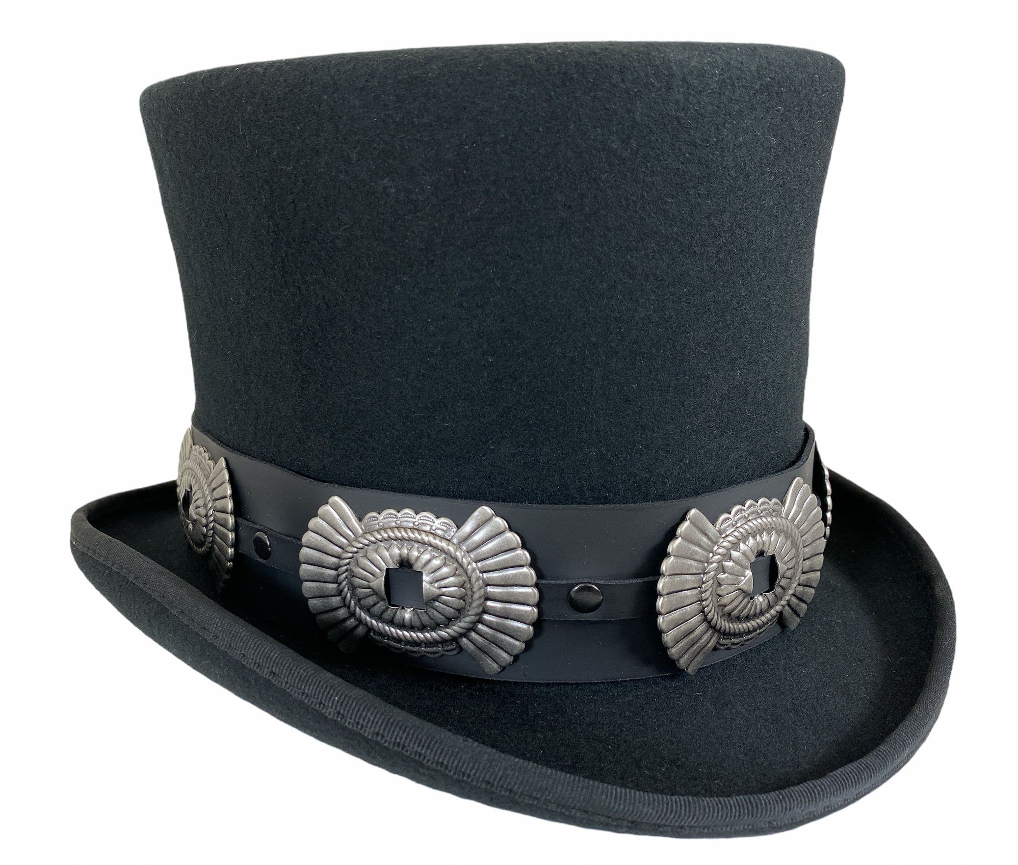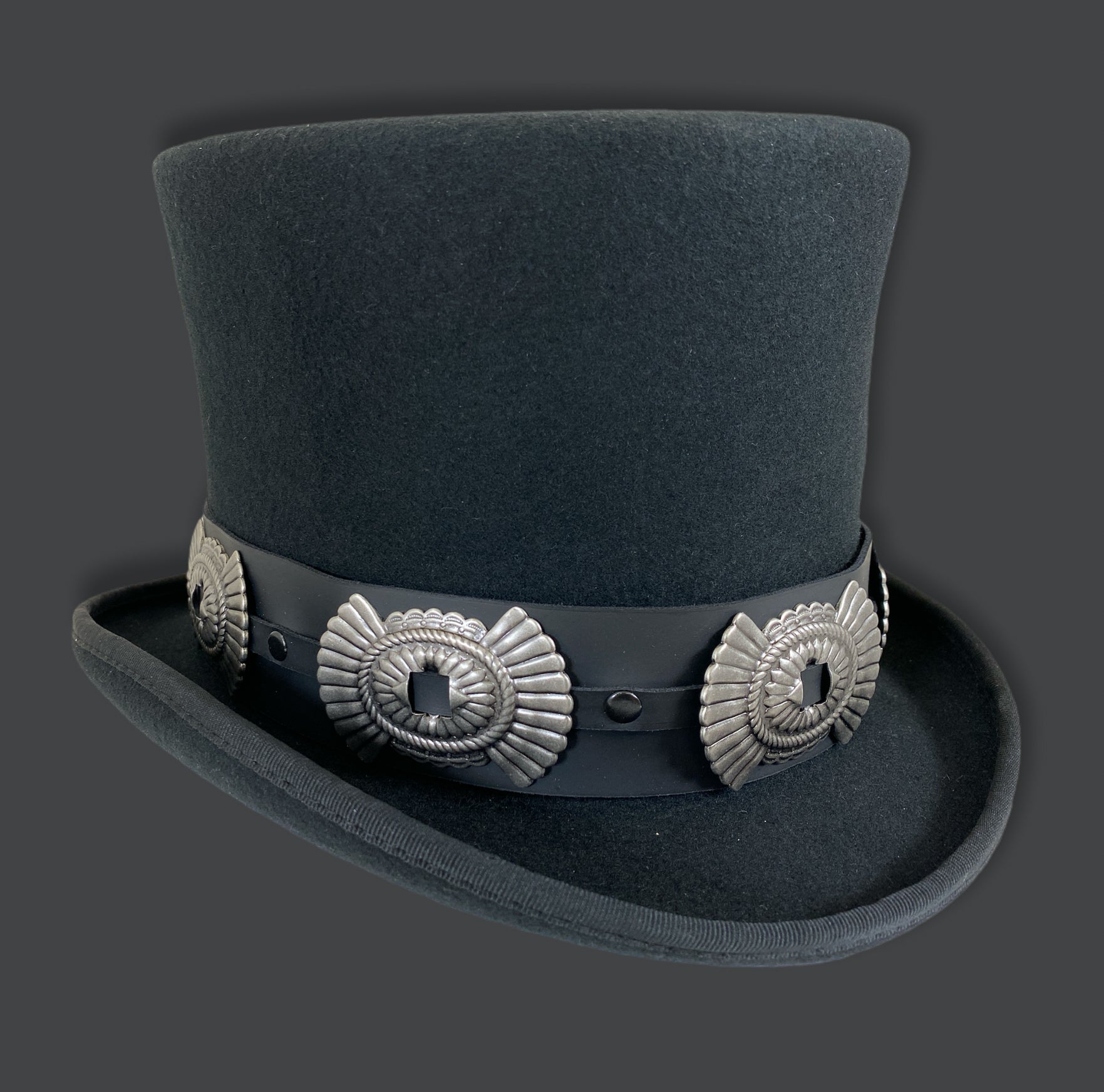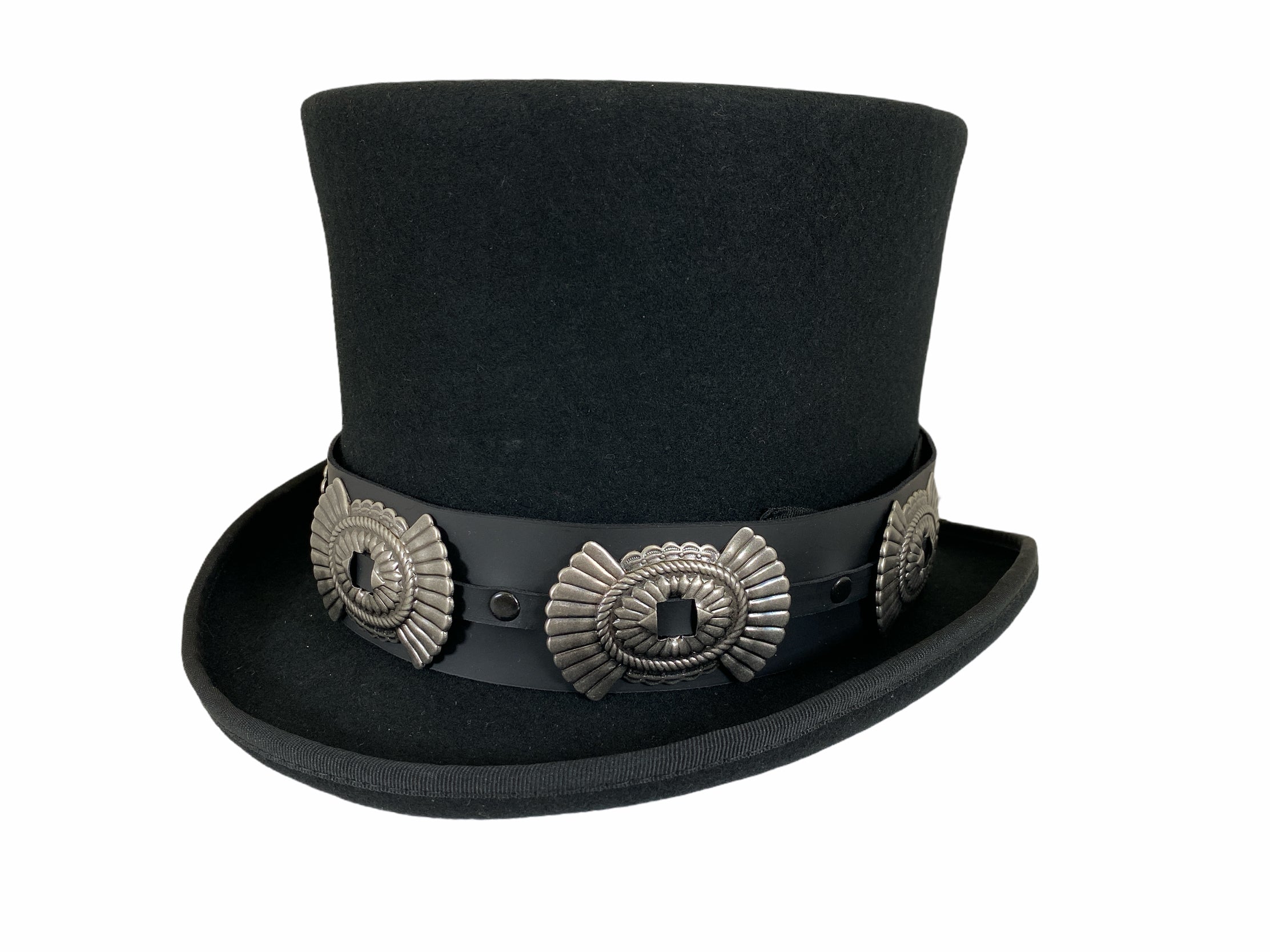 • Premium 100% Wool Felt Top Hat With Leather Hat Band With Steel Concho