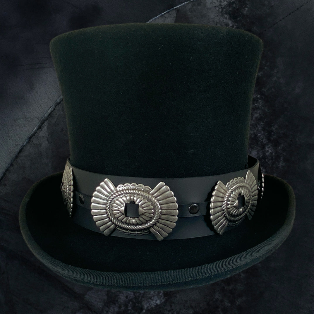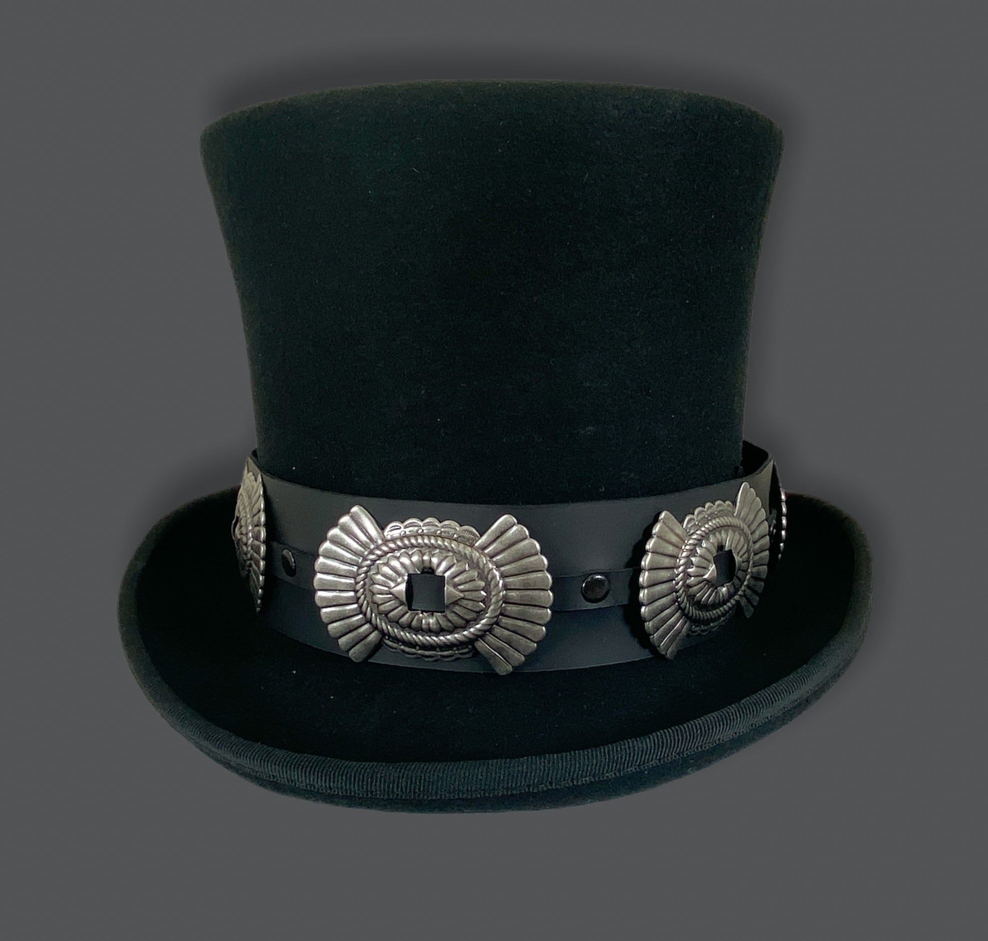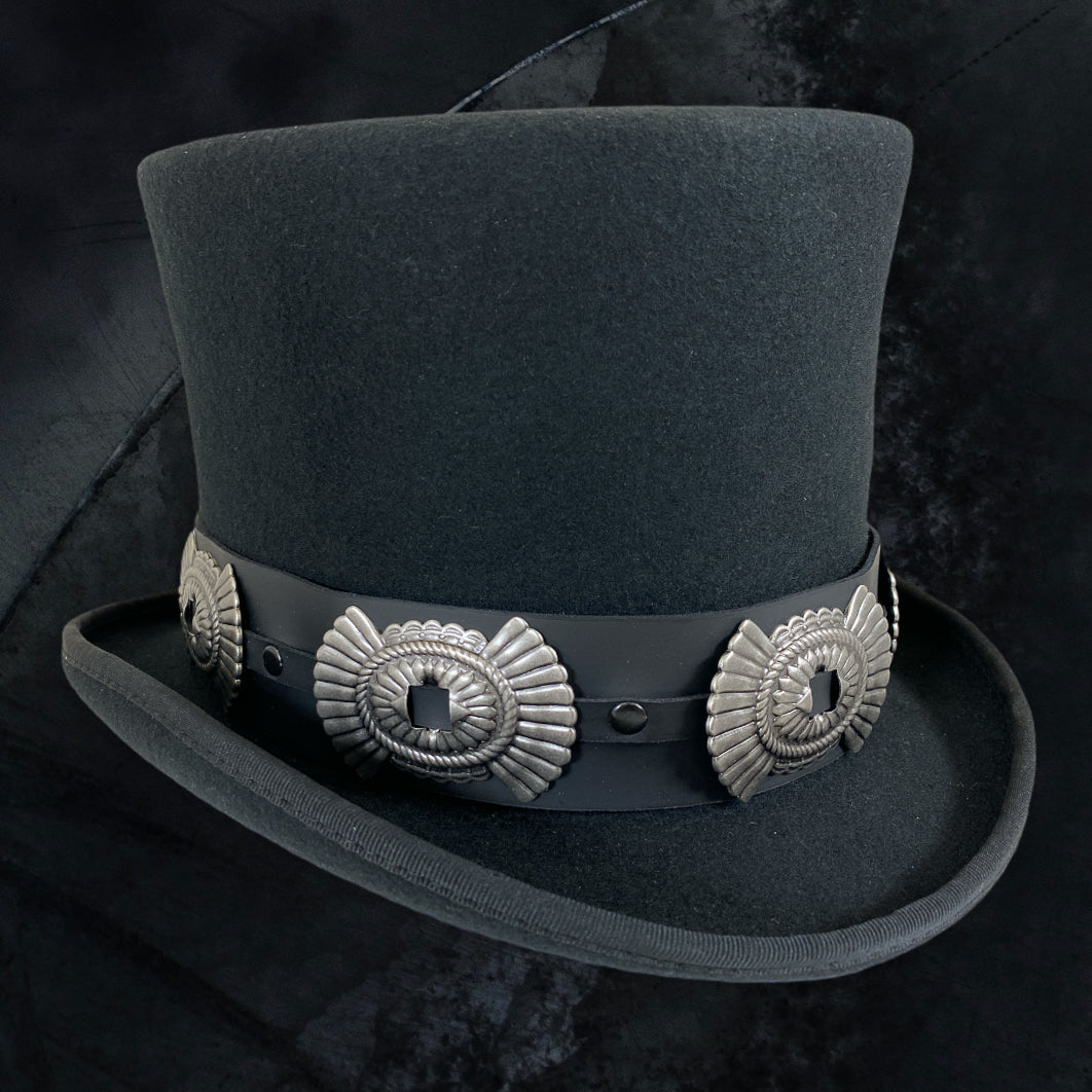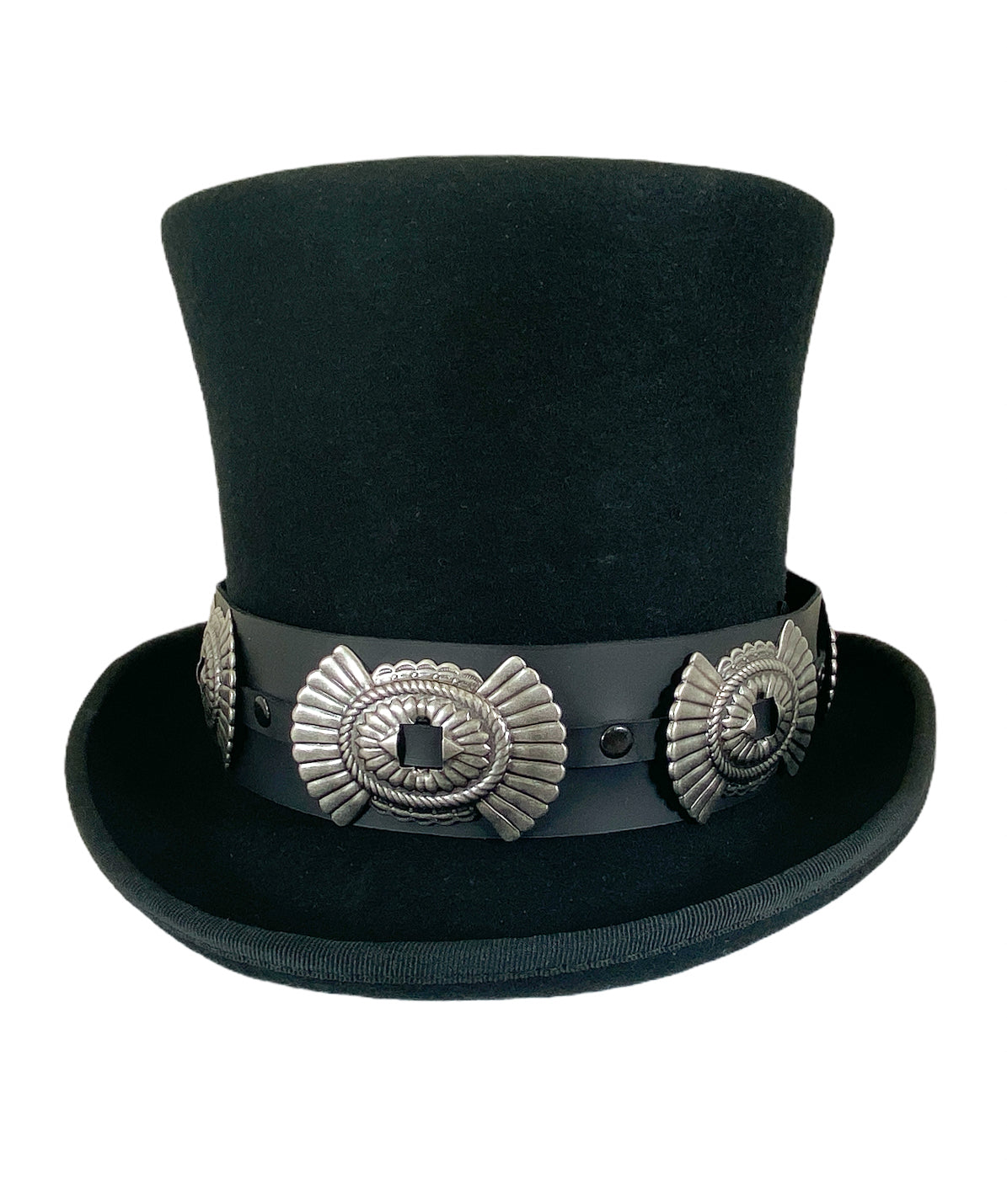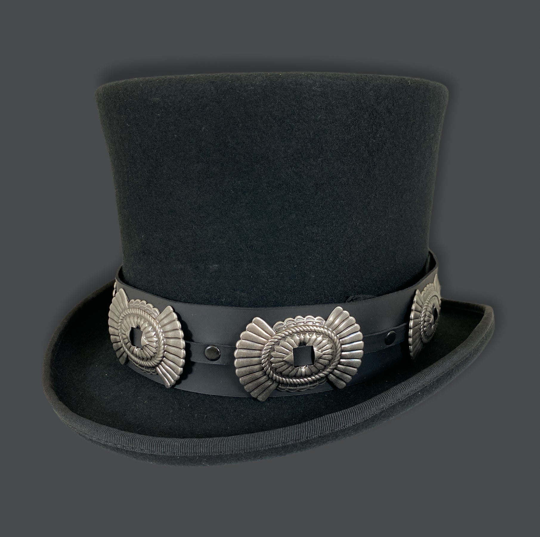 • Premium 100% Wool Felt Top Hat With Leather Hat Band With Steel Concho