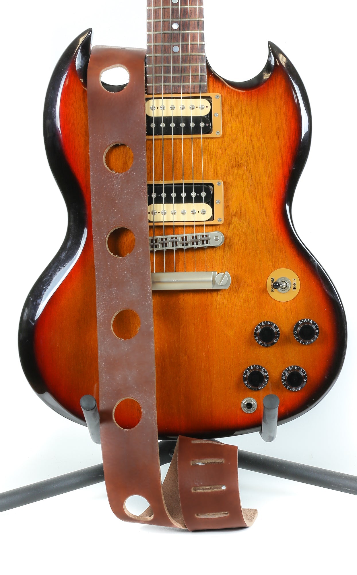 This 2 1/4" Wide Guitar Strap Has The Perfect Width For Anyone. Finest American Cowhide Military Grade Leather Used. Its Just A Raw Skin. No Color Or Chemical Dye Used. Edge Shaped And Sanded Properly So It Will Never Leave Stain Mark On Your Light Colored Shirts. Professionally & Carefully Handmade. Nickel Free Hardwares.