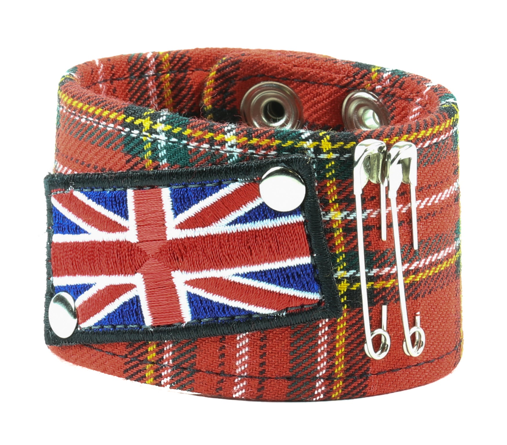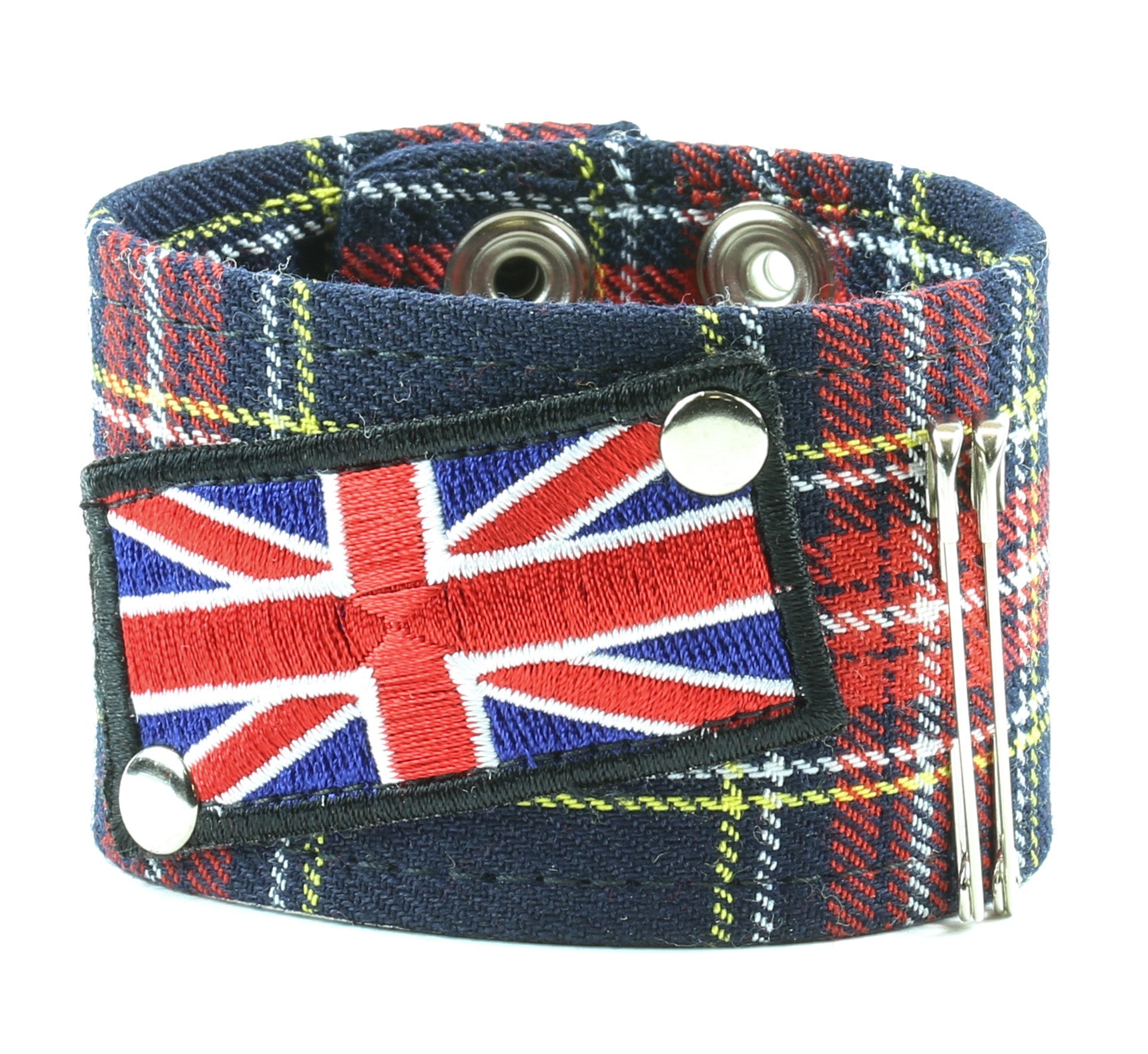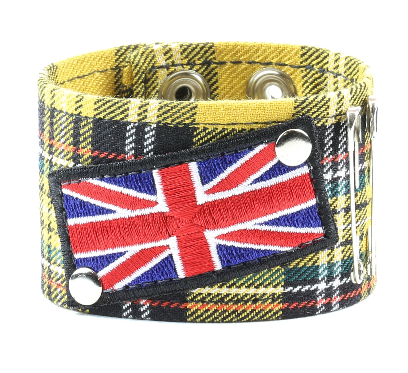 ASSORTED PLAID BRACELET WITH UNION JACK PATCH & SAFTY PIN, 1 3/4" WIDE