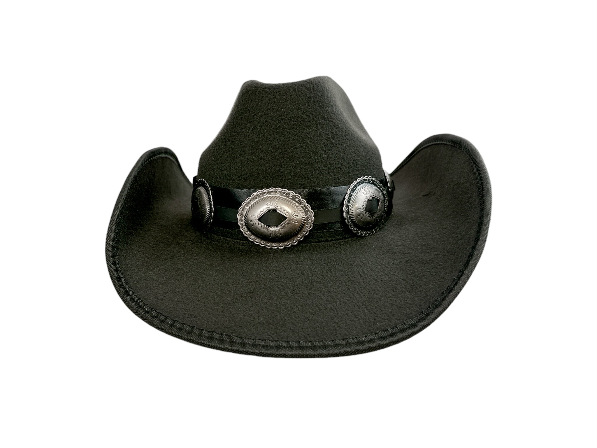 The black Traditional Western hat will get everyone in the mood to kick up their heels! The Texan Hat features a black band decorated with Conch. The hat is adult-sized.
