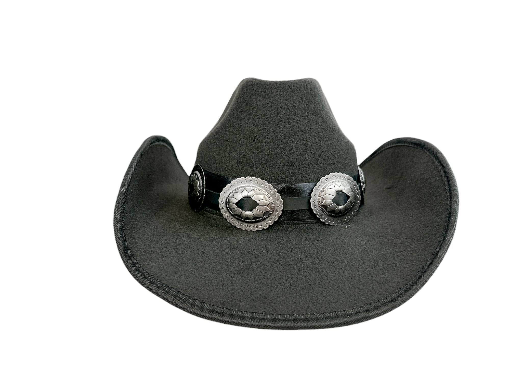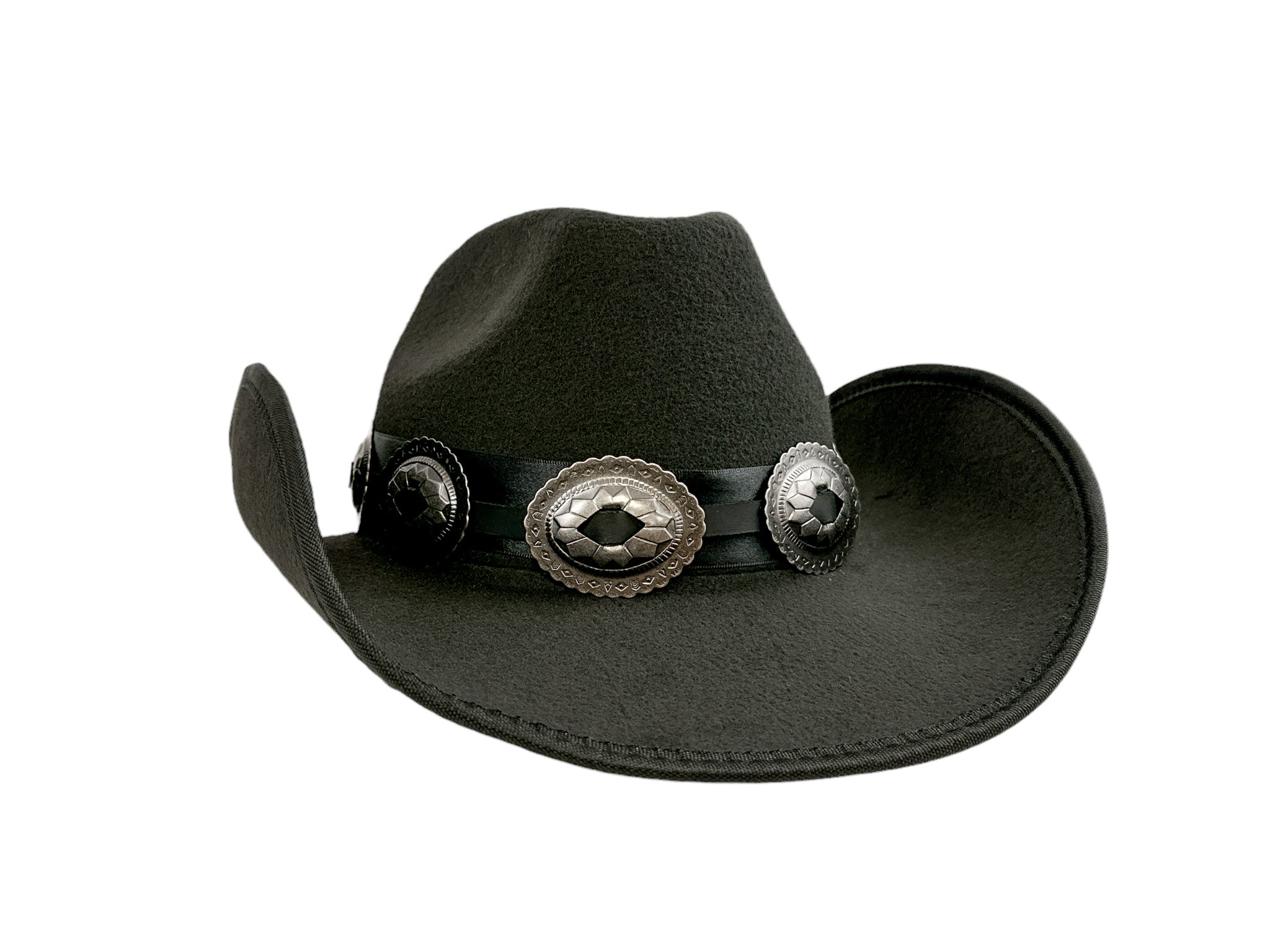 The black Traditional Western hat will get everyone in the mood to kick up their heels! The Texan Hat features a black band decorated with Conch. The hat is adult-sized.