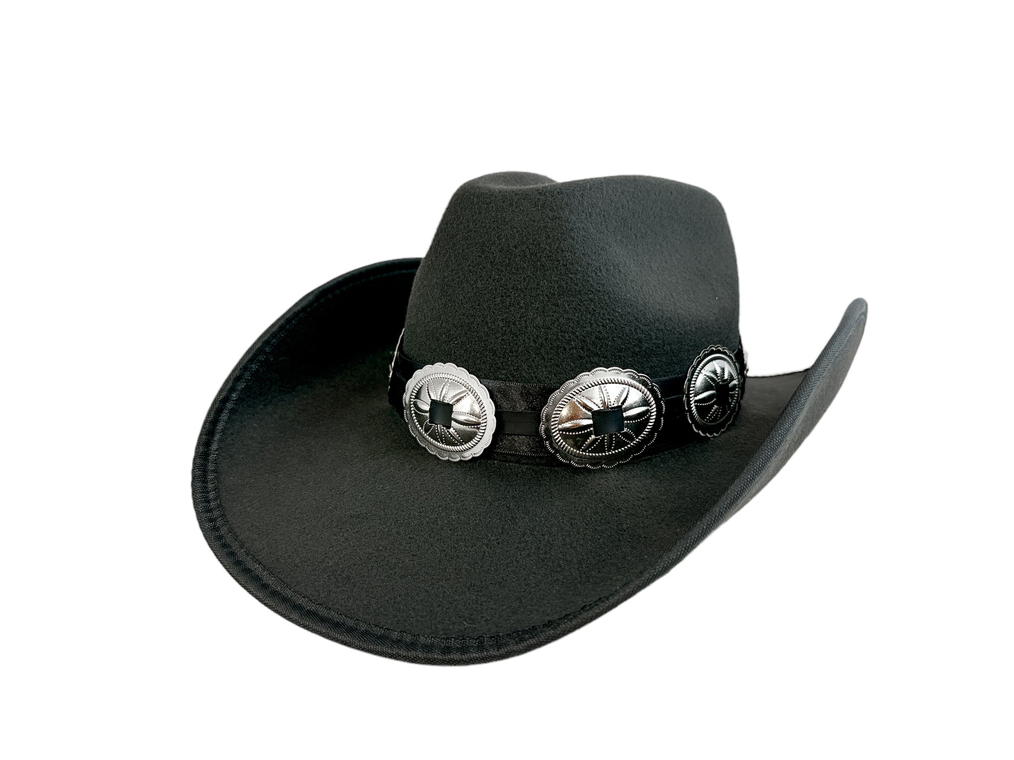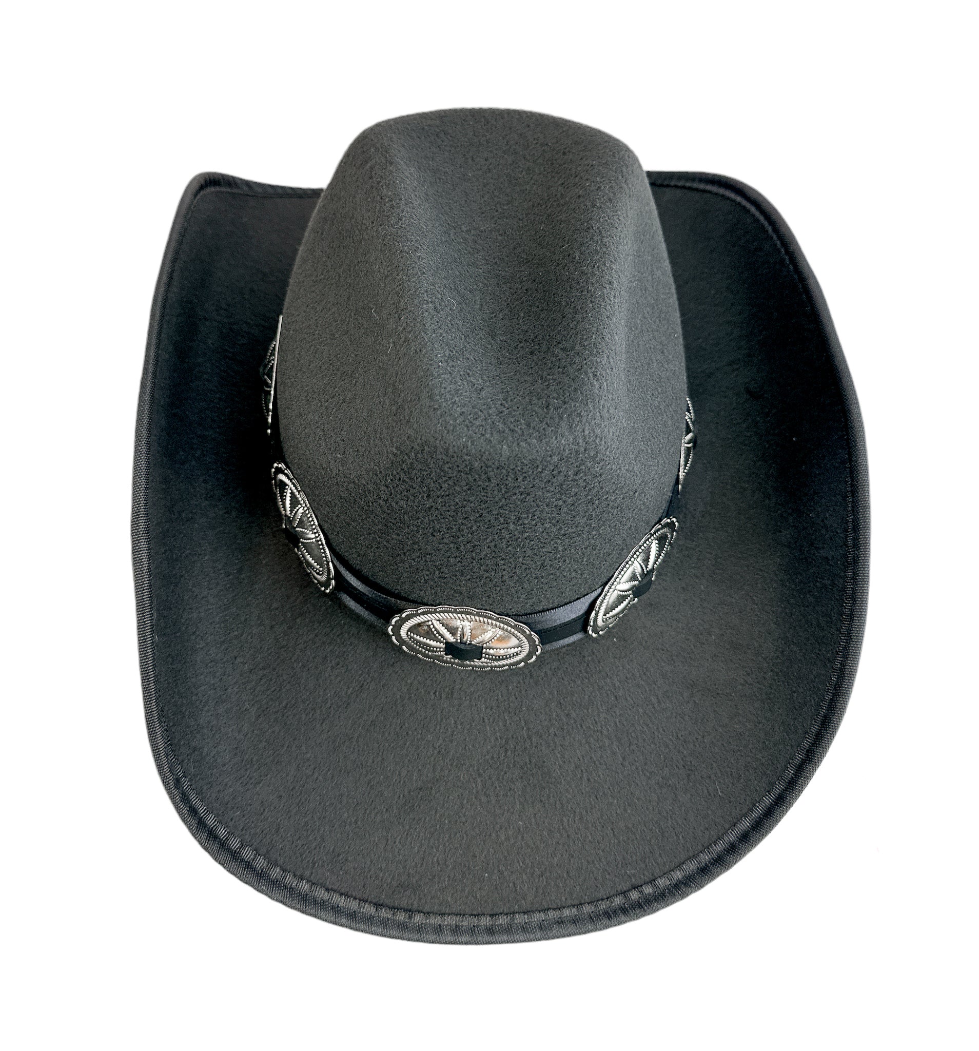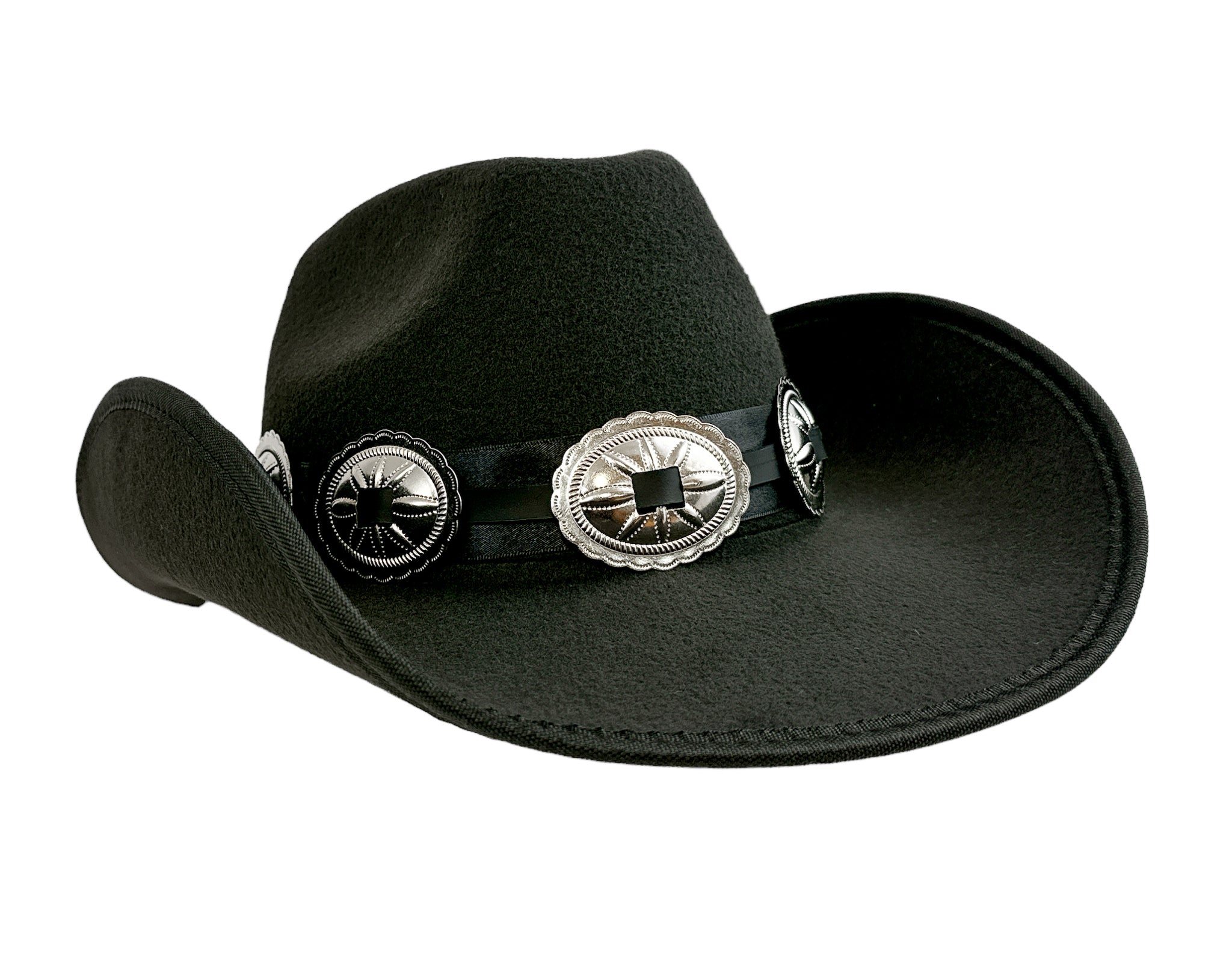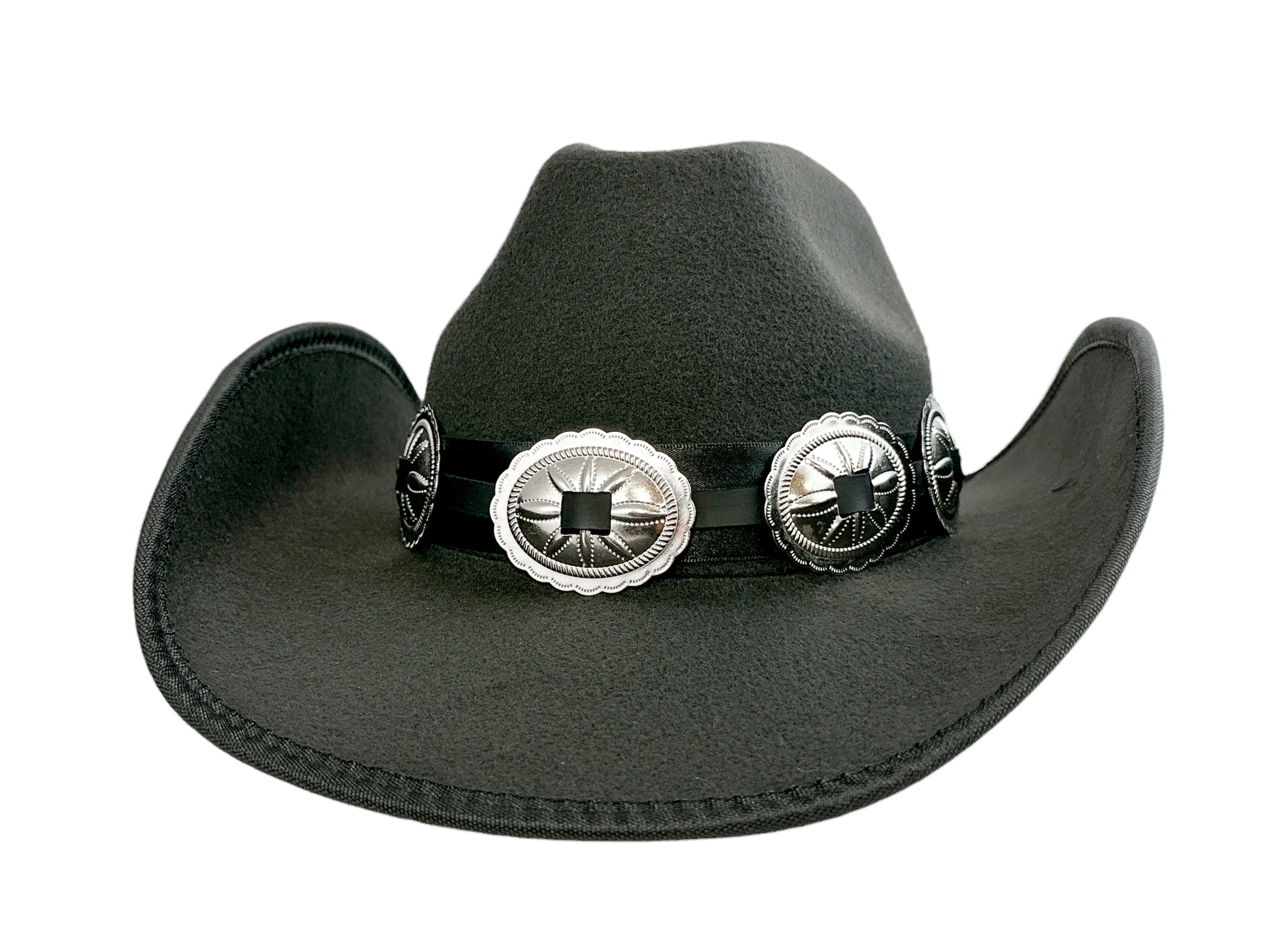 The black Traditional Western hat will get everyone in the mood to kick up their heels! The Texan Hat features a black band decorated with Conch. The hat is adult-sized.