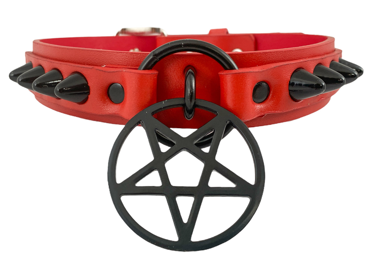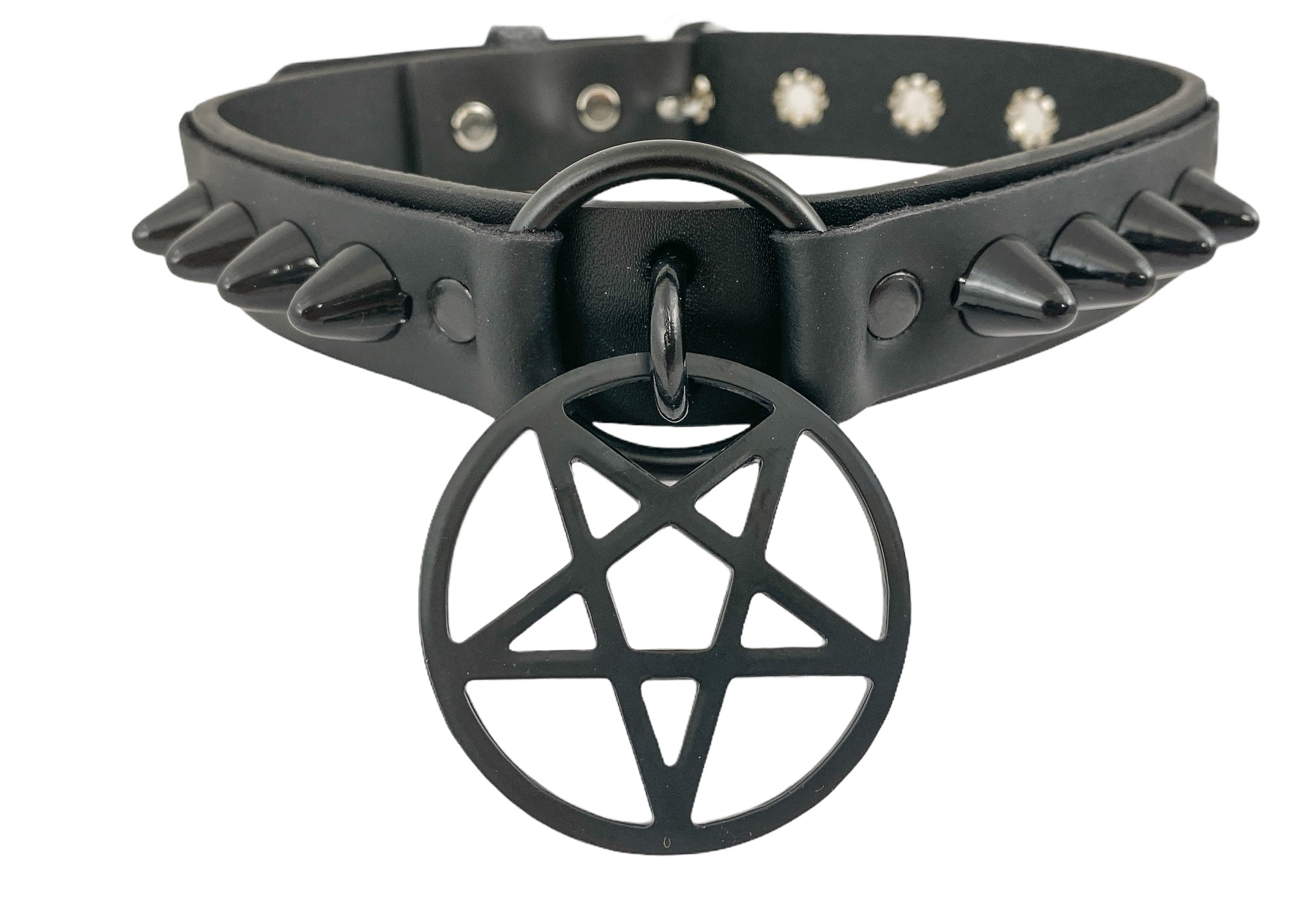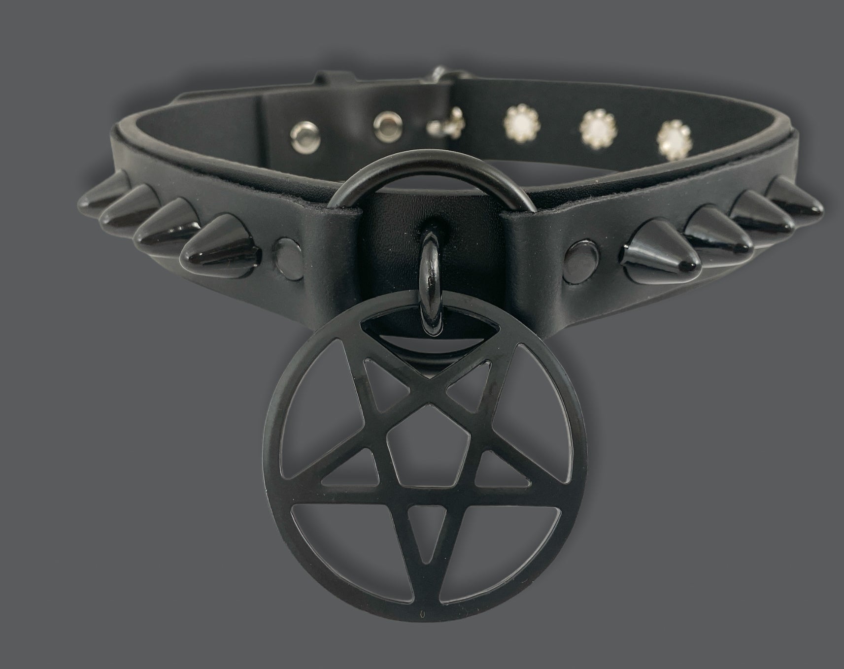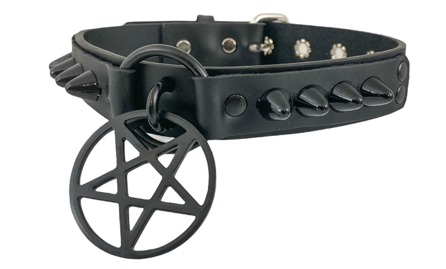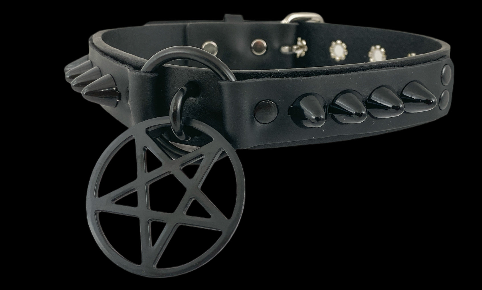 1 1/4" GENUINE-LEATHER CHOKER WITH U RING AND 2" STAINLESS STEEL PENTAGRAM RING AND UK 77 STUD
