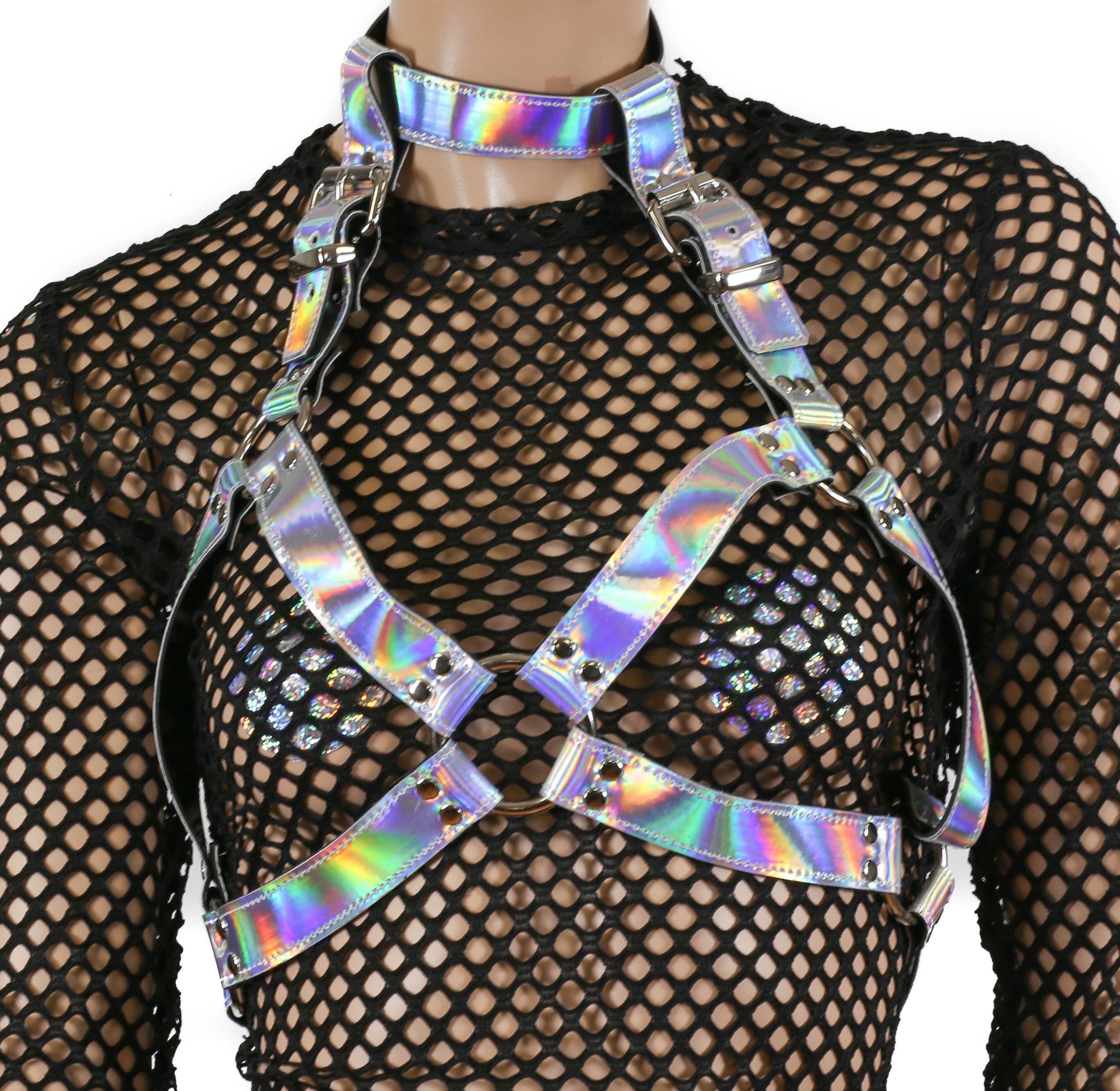 Silver Rainbow Leather Wide Bra Style Vegan Leather Harness